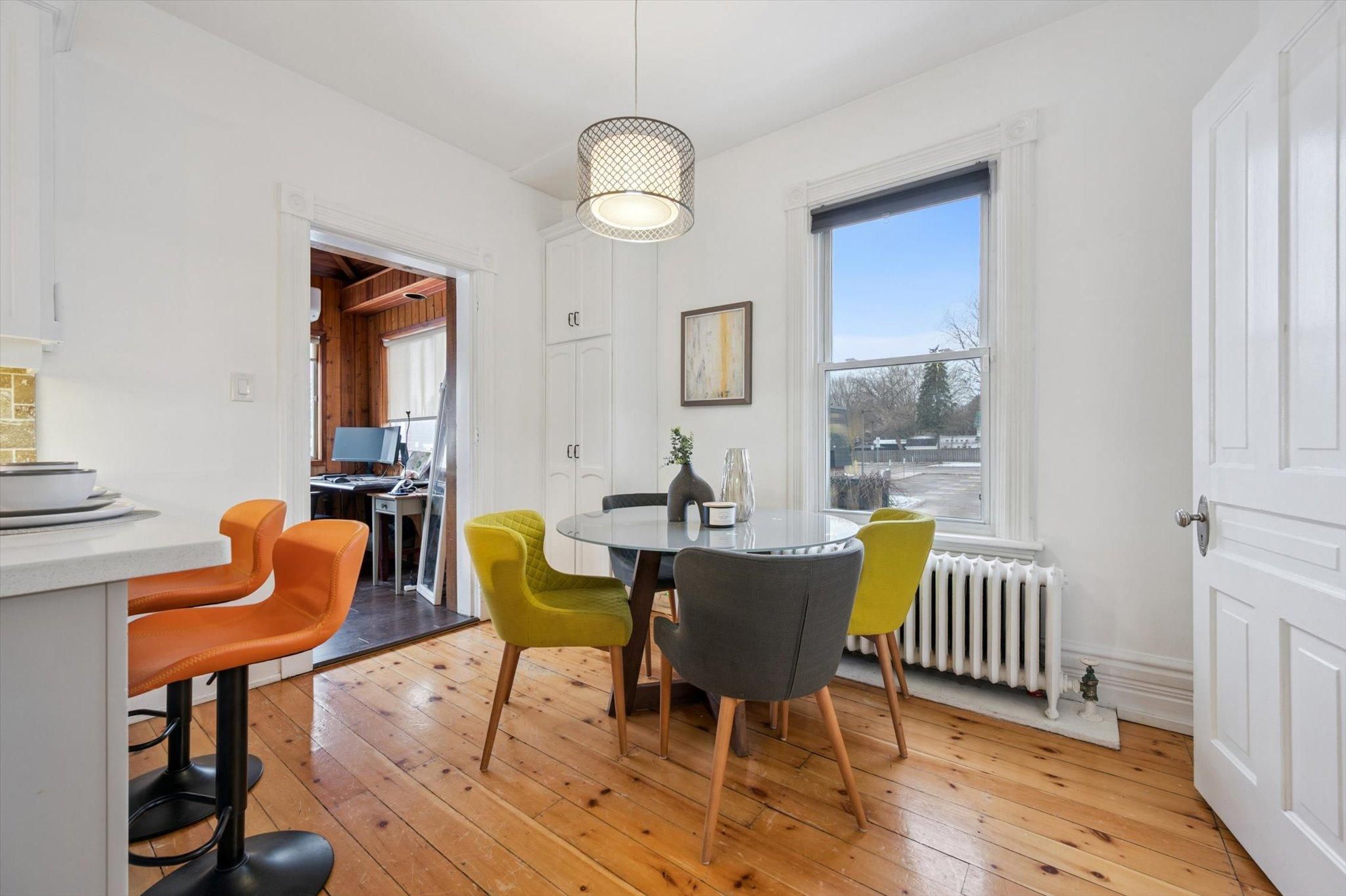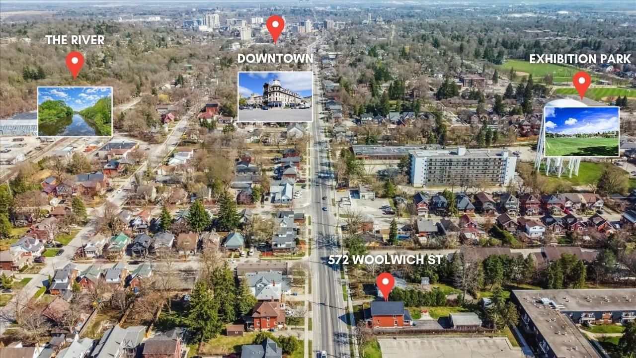 You've been looking for a property that adapts to your life, not the other way around. This is it! 60 x 160 lot w/detached 2-car garage & ample parking in heart of guelph, this century home immediately stands out. What sets the home apart is detached 2-car shop w/pit! Dream setup for car enthusiasts, contractors or anyone needing serious workspace. Combined w/ample on-site parking & effortless turnaround you'll never worry about backing onto woolwich or squeezing in work trucks or client cars. Add in prime downtown exposure & visibility, this becomes an exceptional opportunity for at-home business. Front lr can be converted into office or space for massage therapy, physiotherapy or similar professions. For investors the upside is just as compelling! Existing floor plan allows lr & dr to be easily reconfigured into add'l bdrms creating 4 or 5-bdrms! See attach for income pro forma for 5-bdrm rental. Lot size & layout support adu & home sits on bus route to uofg w/walkability to downtown, major draw for tenants. Red-brick exterior & front porch deliver timeless character. Inside home blends original details w/thoughtful updates. Lr w/hardwood, high baseboards, fireplace & picture windows. It flows into dr creating perfect setting for family meals & entertaining. Renovated kitchen w/timeless cabinetry, quartz counters, backsplash, b/i appliances, breakfast bar & dining nook. Sun-room at rear is ideal as reading nook, office or studio. Solid wood stairs lead up to 3 bdrms w/hardwood & large windows. Updated bathroom w/glass tub-shower, vanity & backsplash. Backyard offers expansive lot for kids, pets, entertaining & relaxing. Walk to downtown shops, restaurants & nightlife. Steps from royal rec trail, exhibition & riverside park. This isn't just a home, it's a place where you can live, work, invest & grow! Property gives you options today & powerful upside tomorrow. Downtown homes rarely offer this level of space, parking, versatility & income potential, this one does!
