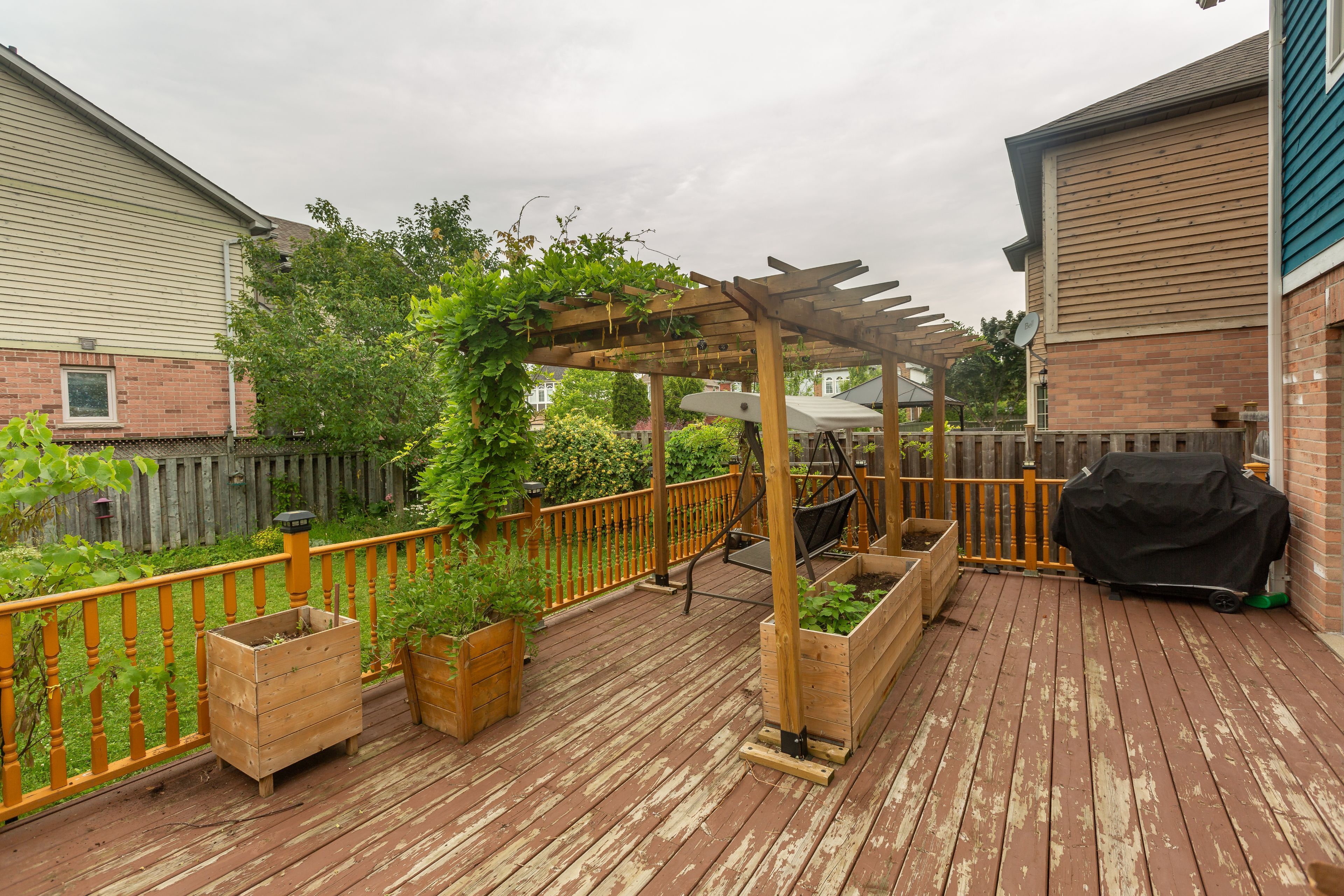 • Well-shaped backyard with raised beds and a large deck with pergola.
