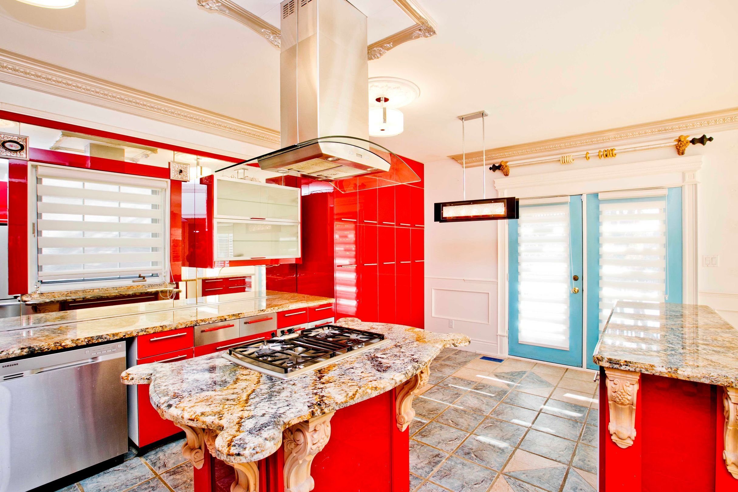 • Chef's kitchen featuring Brazilian granite countertops and gas cooktop.