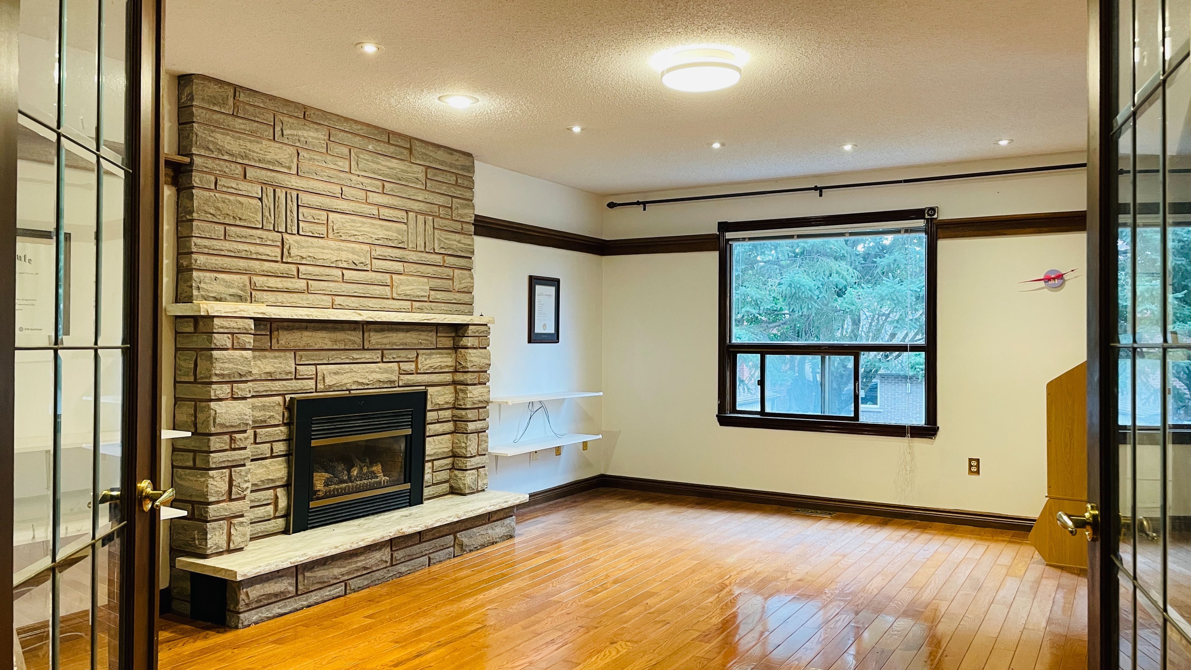 • Family room includes a cozy gas fireplace and stone mantel.