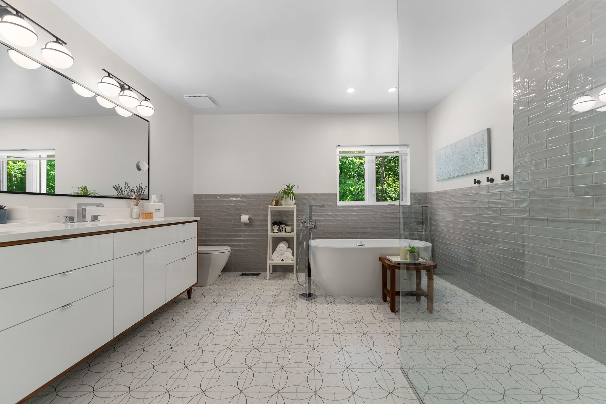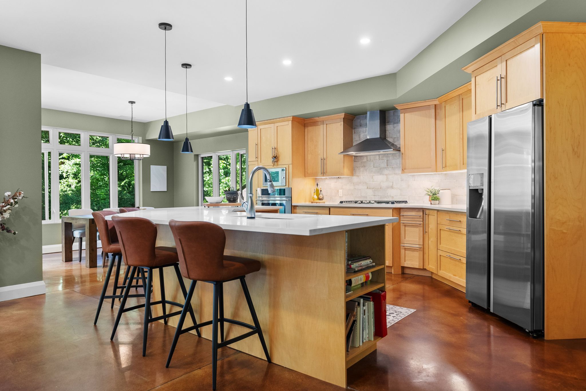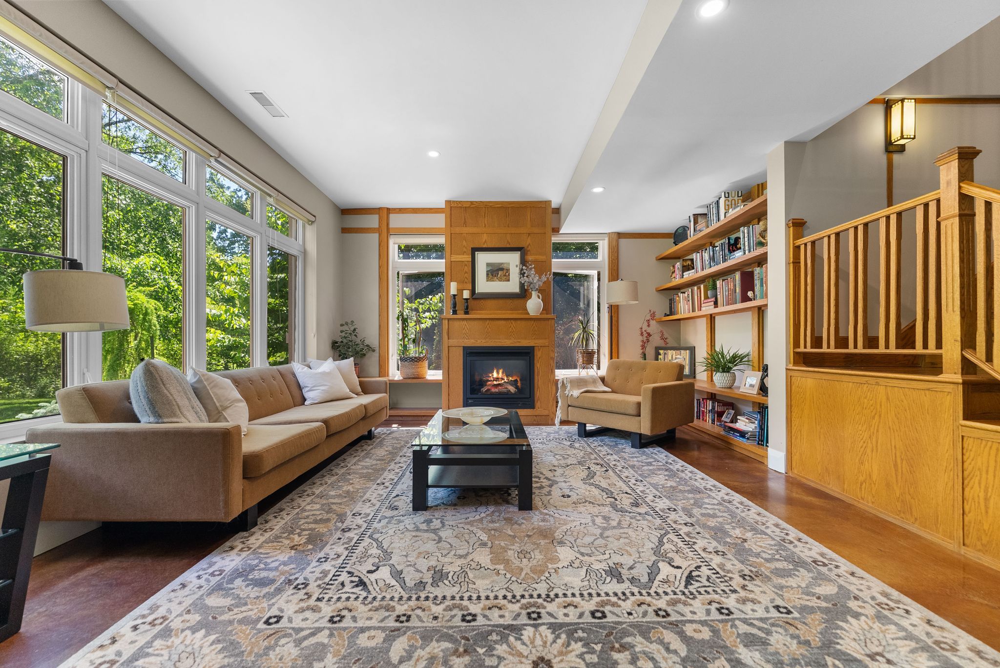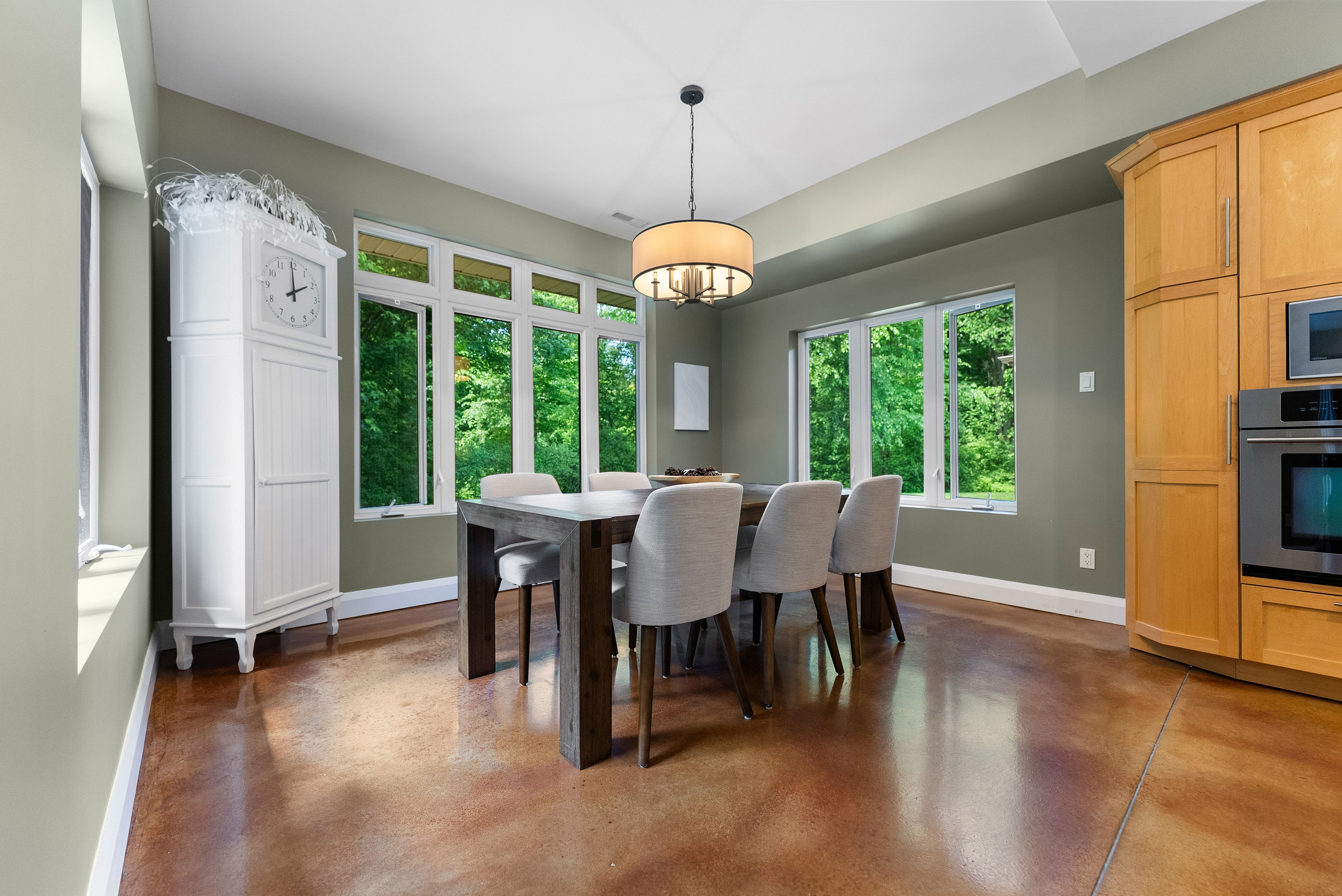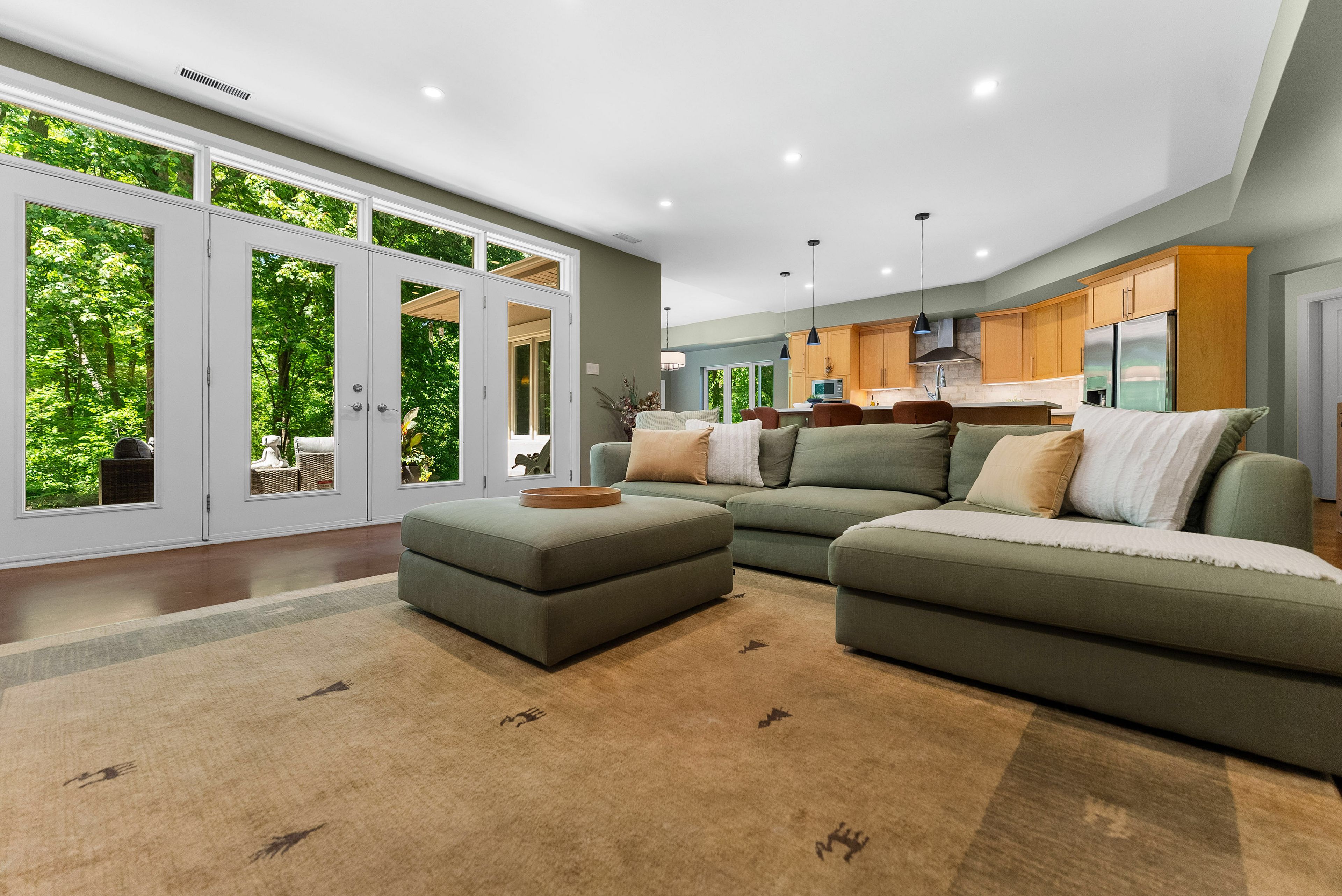 • Floor-to-ceiling windows offer abundant natural light and serene forest views.