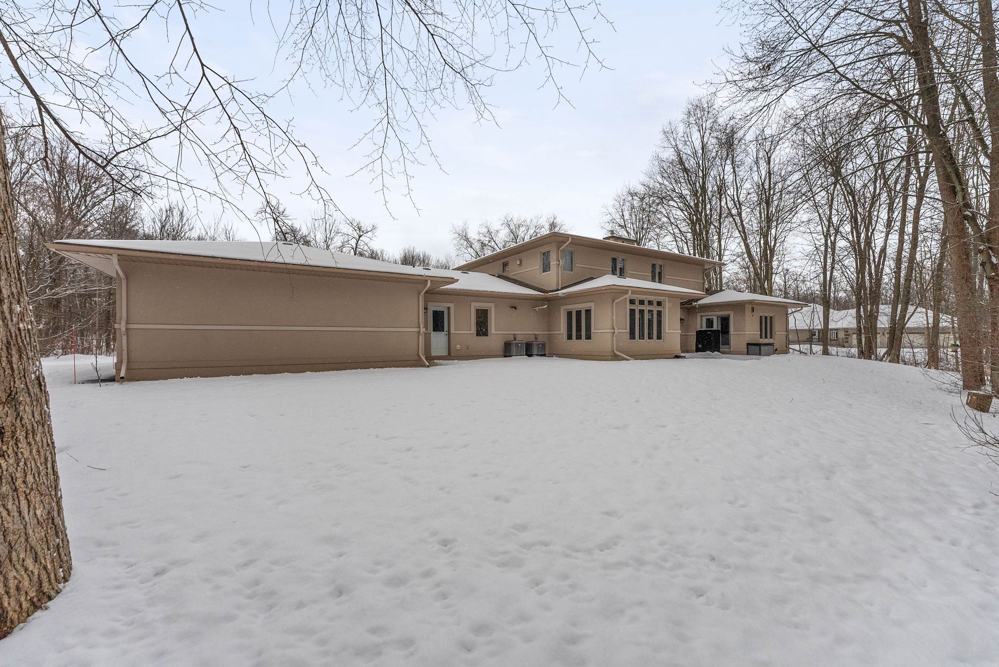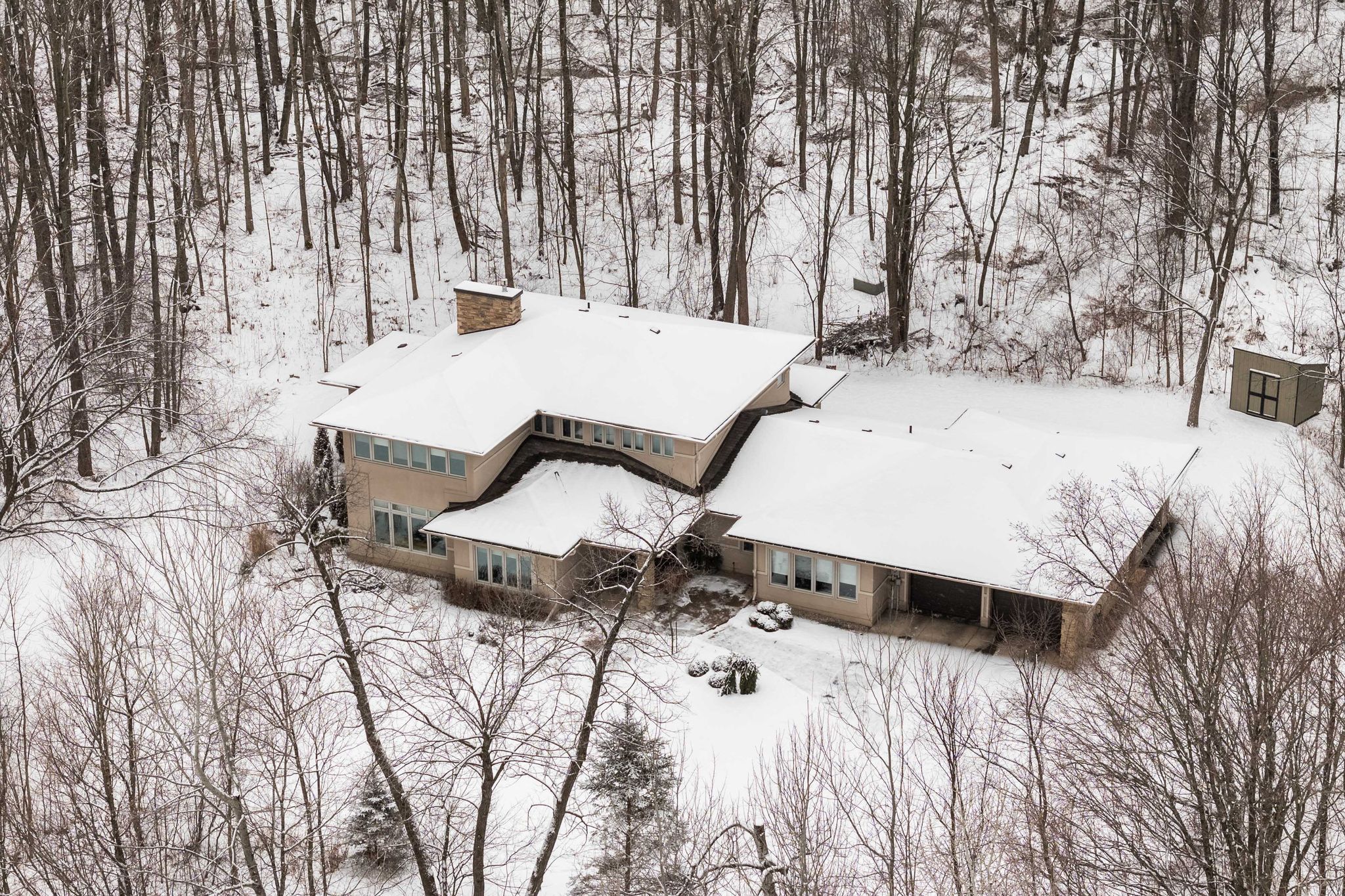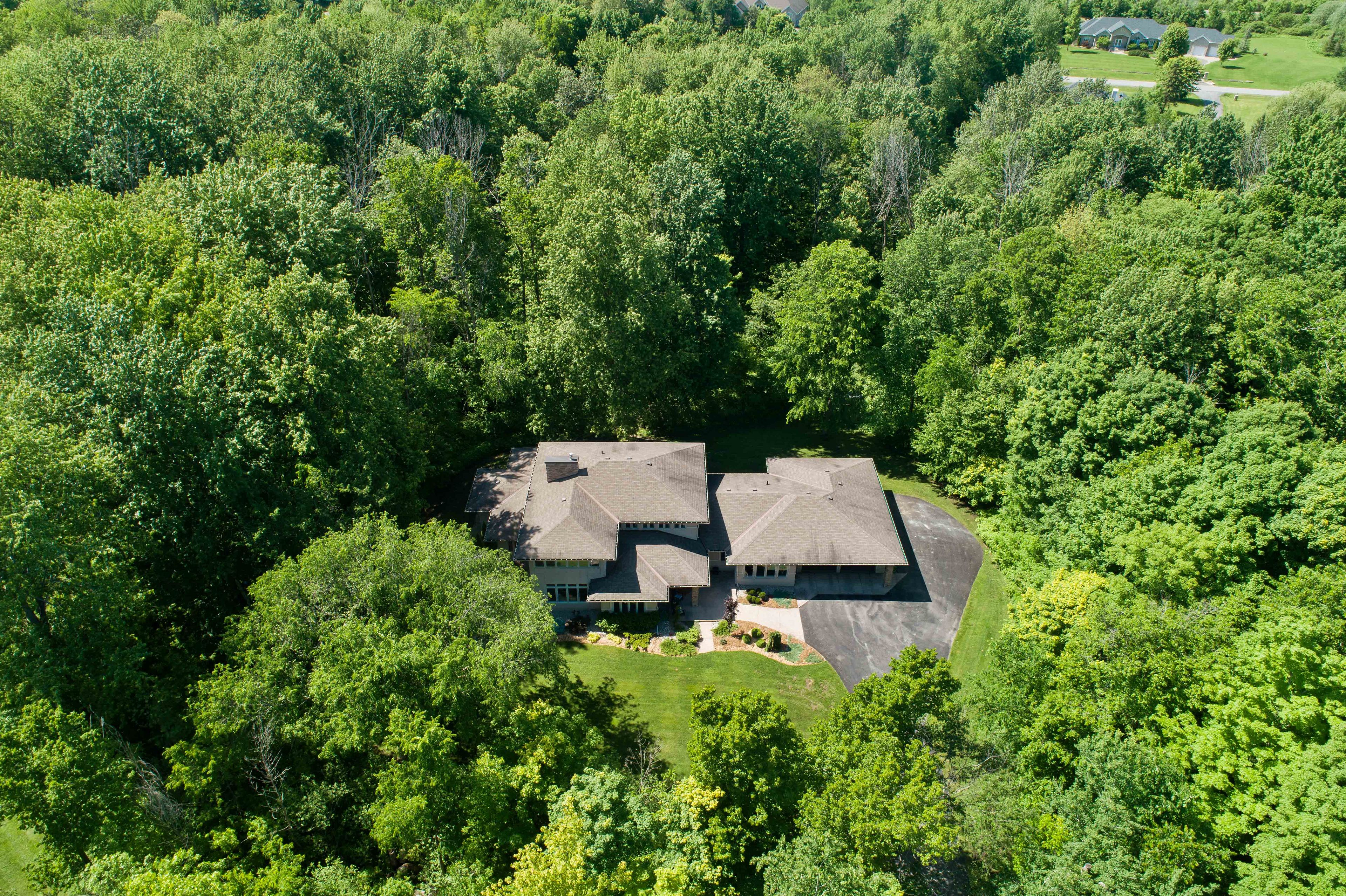 • Custom-built home on a private 4.4-acre treed estate with Prairie-style architecture.