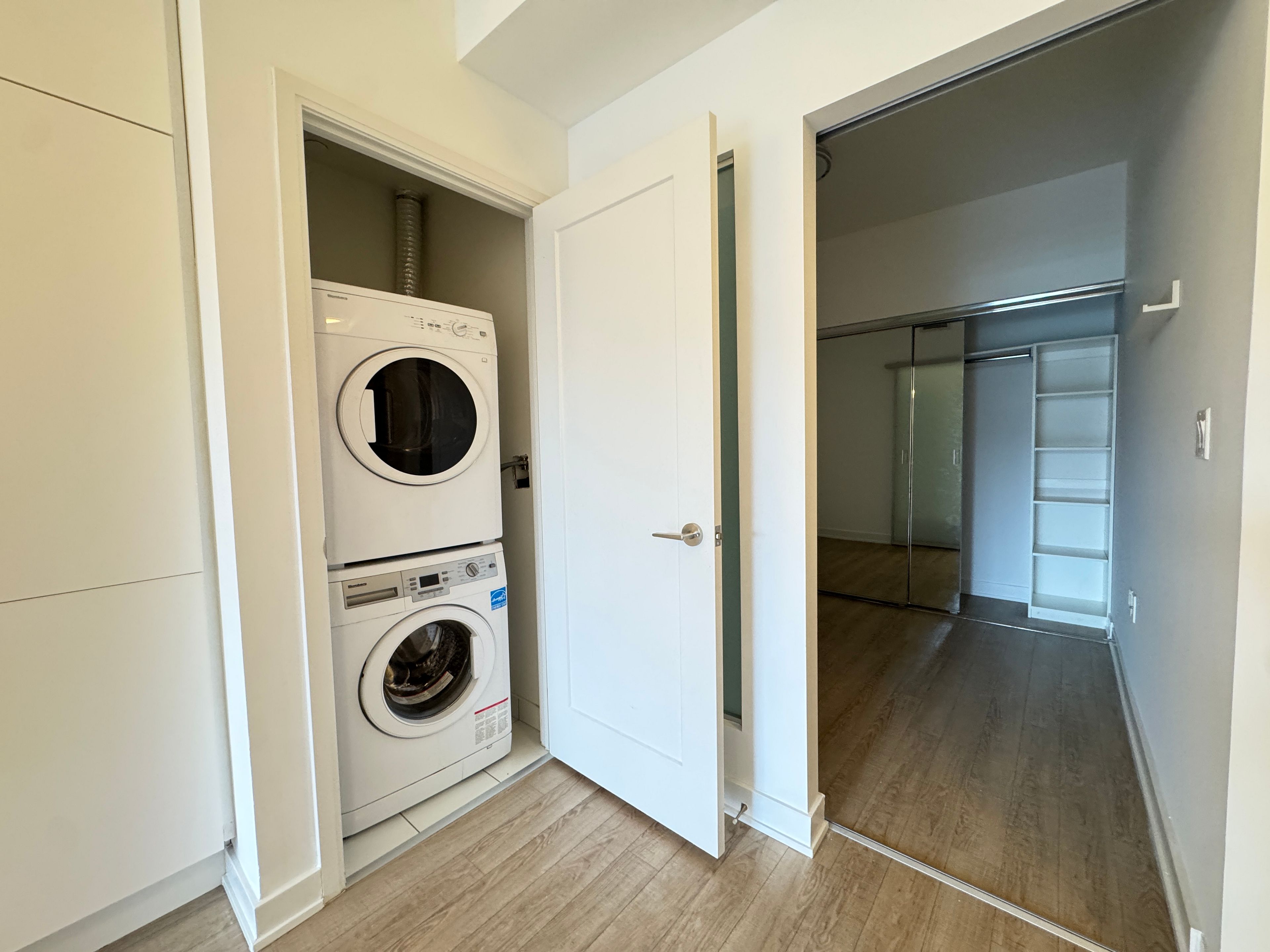 Located at the prime intersection of front & bathurst in one of toronto's most sought-after downtown neighbourhoods, this immaculate 2-bedroom, 2-bathroom residence offers the perfect blend of urban convenience and refined living. Featuring a bright east-facing exposure, the suite is filled with natural morning light and includes a private balcony ideal for relaxing or entertaining, along with a dedicated locker for added storage. The thoughtfully designed layout boasts modern finishes, an open-concept living and dining area, and a sleek contemporary kitchen equipped with full-size appliances. Residents enjoy hotel-style amenities, including a 24-hour concierge, state-of-the-art fitness facilities, party and recreation rooms, and more. Just steps to ttc transit, grocery stores, cafes, top-rated restaurants, and vibrant entertainment, and only minutes to the gardiner expressway for effortless commuting. Includes all kitchen appliances, washer, dryer, window coverings, and light fixtures-move-in ready!