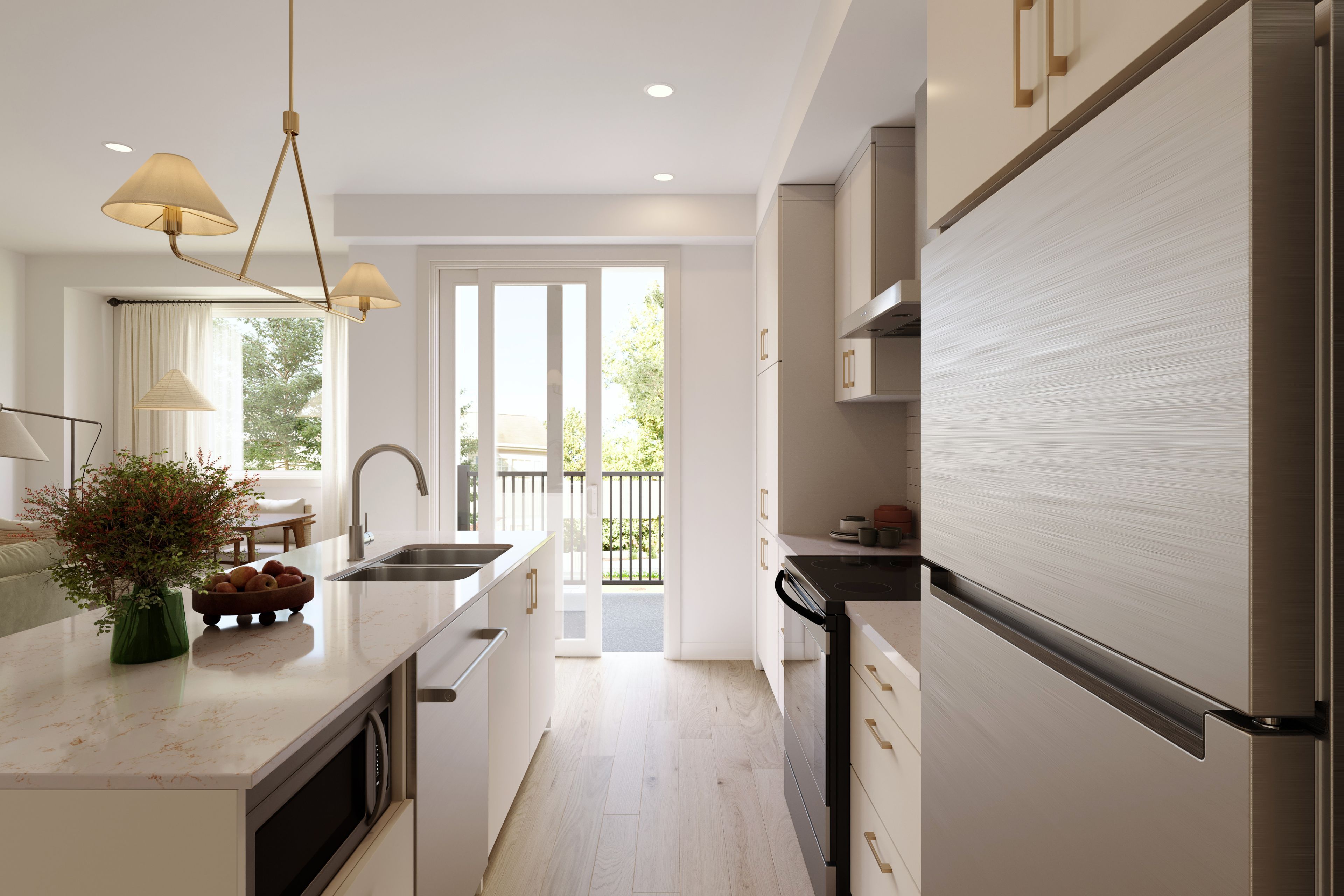 • Contemporary kitchen equipped with quartz countertops and six appliances.