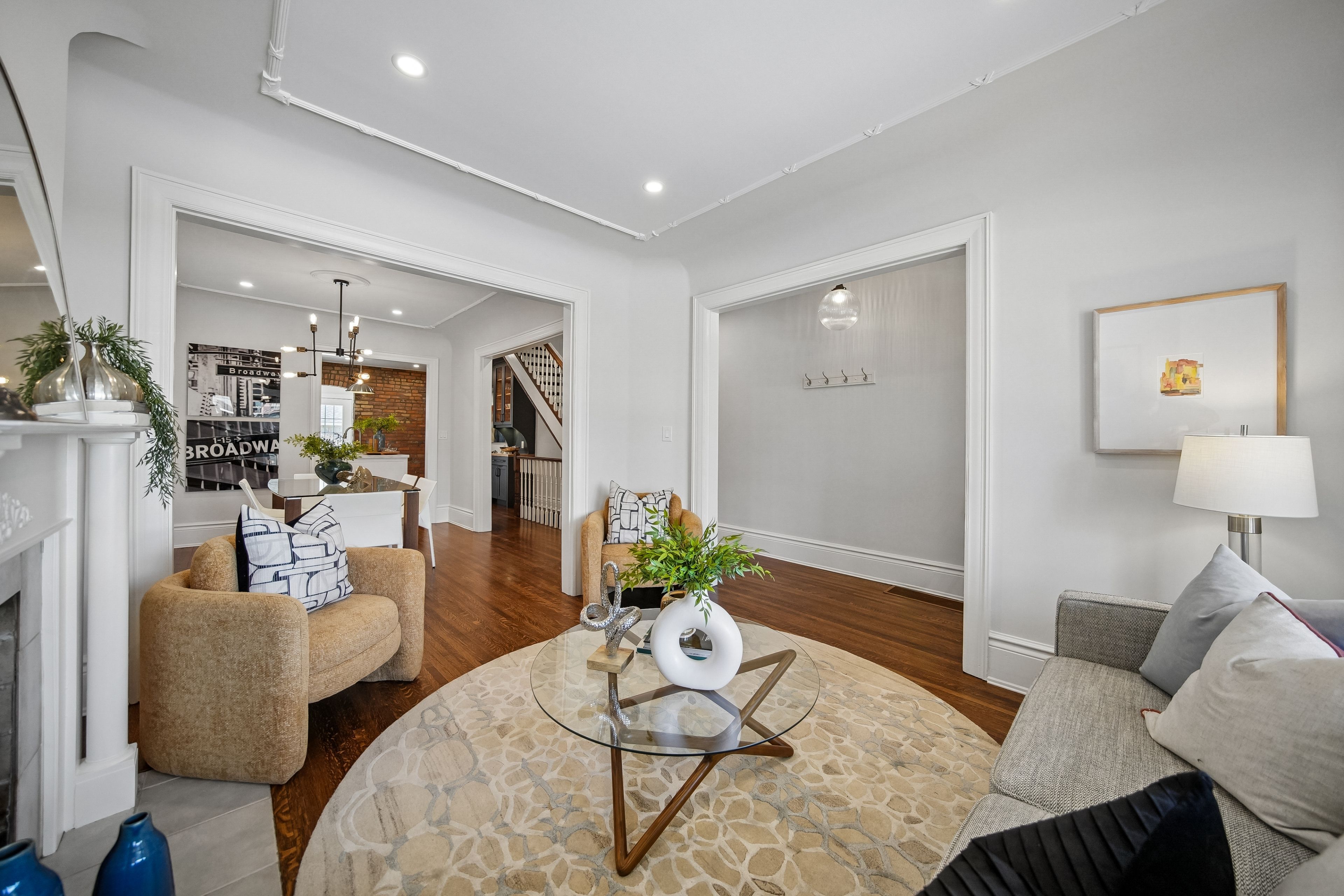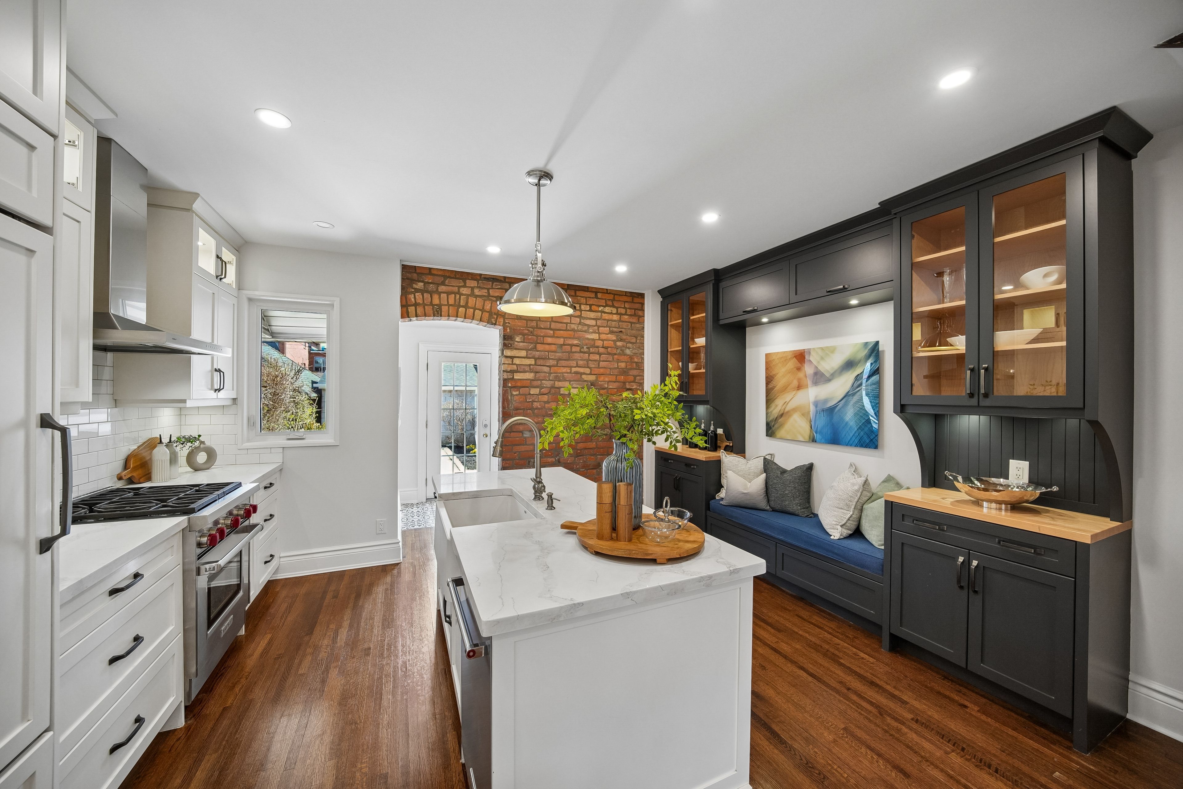 • Main floor features beautiful hardwood and an exposed brick wall.
