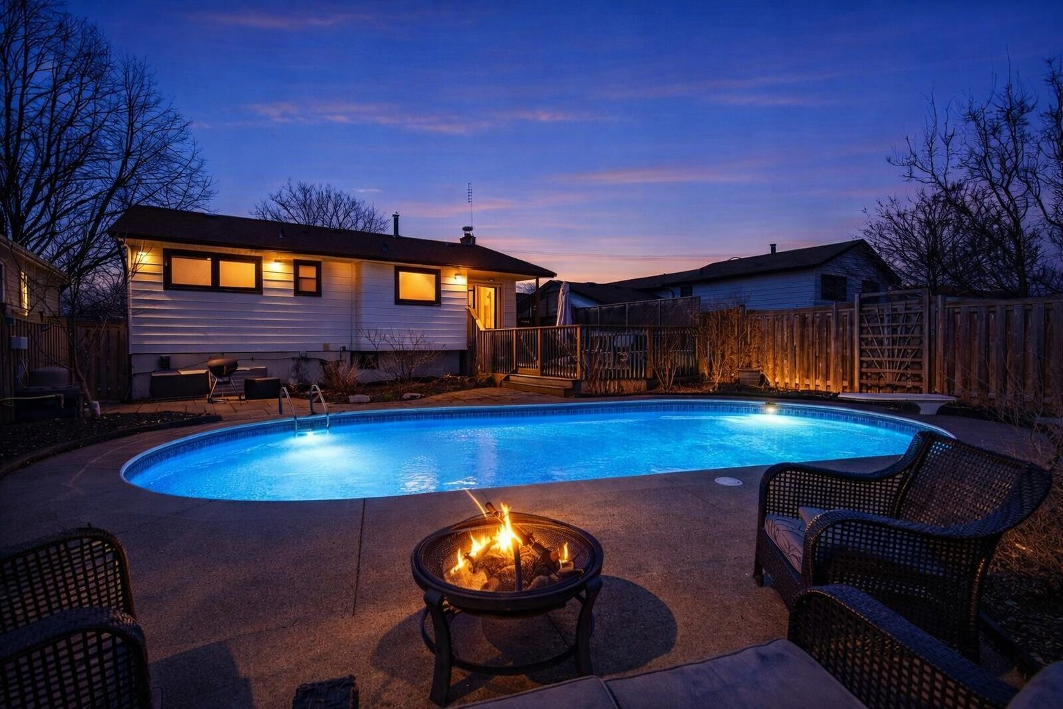 Welcome to 578 holly hill crescent, a beautifully updated family home on a quiet, kid friendly street backing directly onto a park, an unbeatable setting for growing families. Freshly painted with new vinyl flooring, this 3+1 bed, 2 bath home provides a bright, functional layout with spacious bedrooms & room to grow. The sun filled living room features a gas fireplace & california shutters, flowing seamlessly into the dining area with walk out to a 2 tier deck. The kitchen offers stainless steel appliances, breakfast nook& peaceful backyard views. The main level features 3 spacious bedrooms & an updated bathroom with heated floors, ideal for family living. Downstairs, enjoy a finished rec room with a gas fireplace, flexible bedroom or office & oversized mudroom with garage access. Outside, a private backyard oasis awaits with a saltwater pool & direct park access, perfect for kids, entertaining& everyday enjoyment. Located near parks, trails, schools, shops, transit & highways, enjoy burlington's family living at its best.