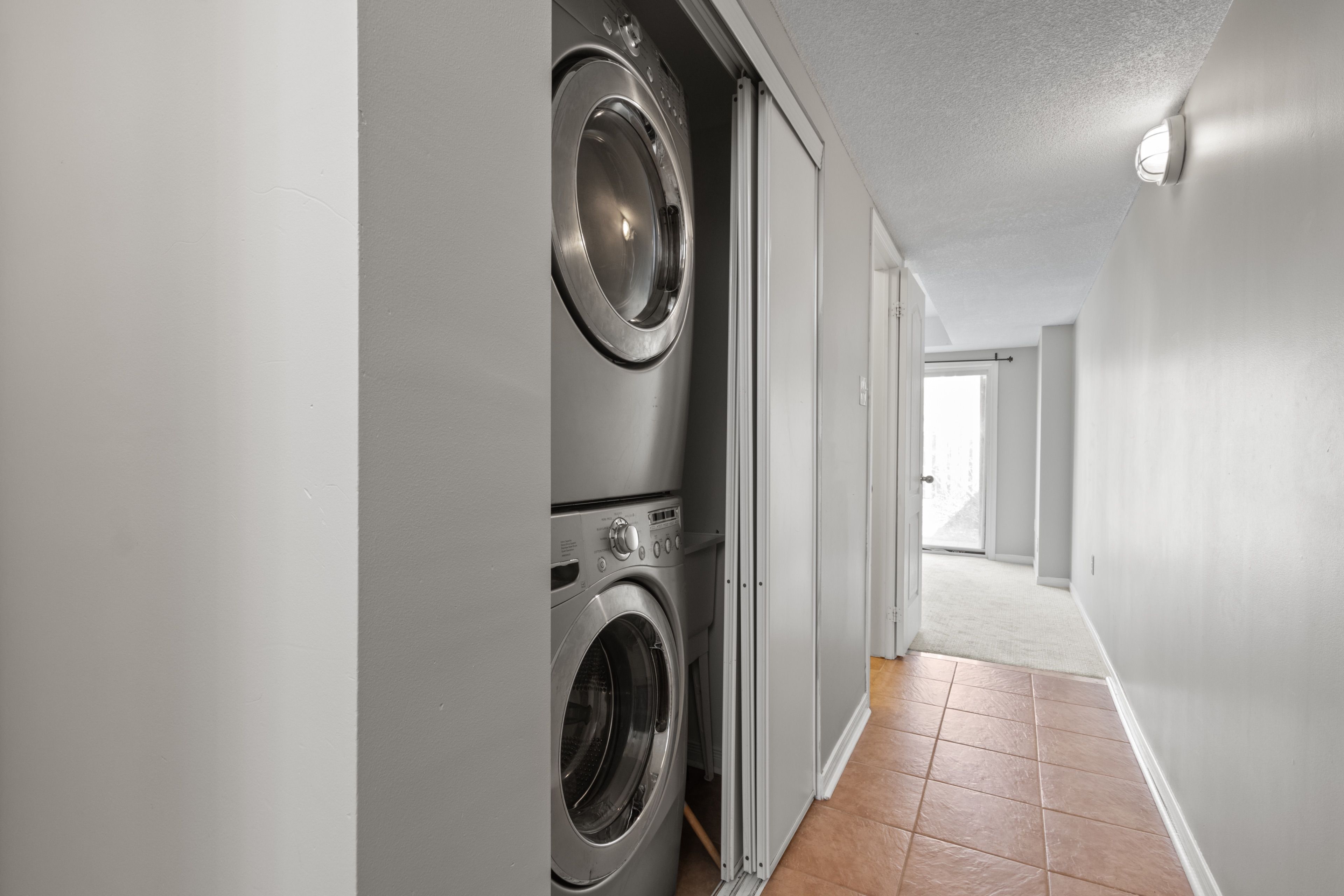 • Open-concept kitchen with modern appliances and a walkout to a balcony.