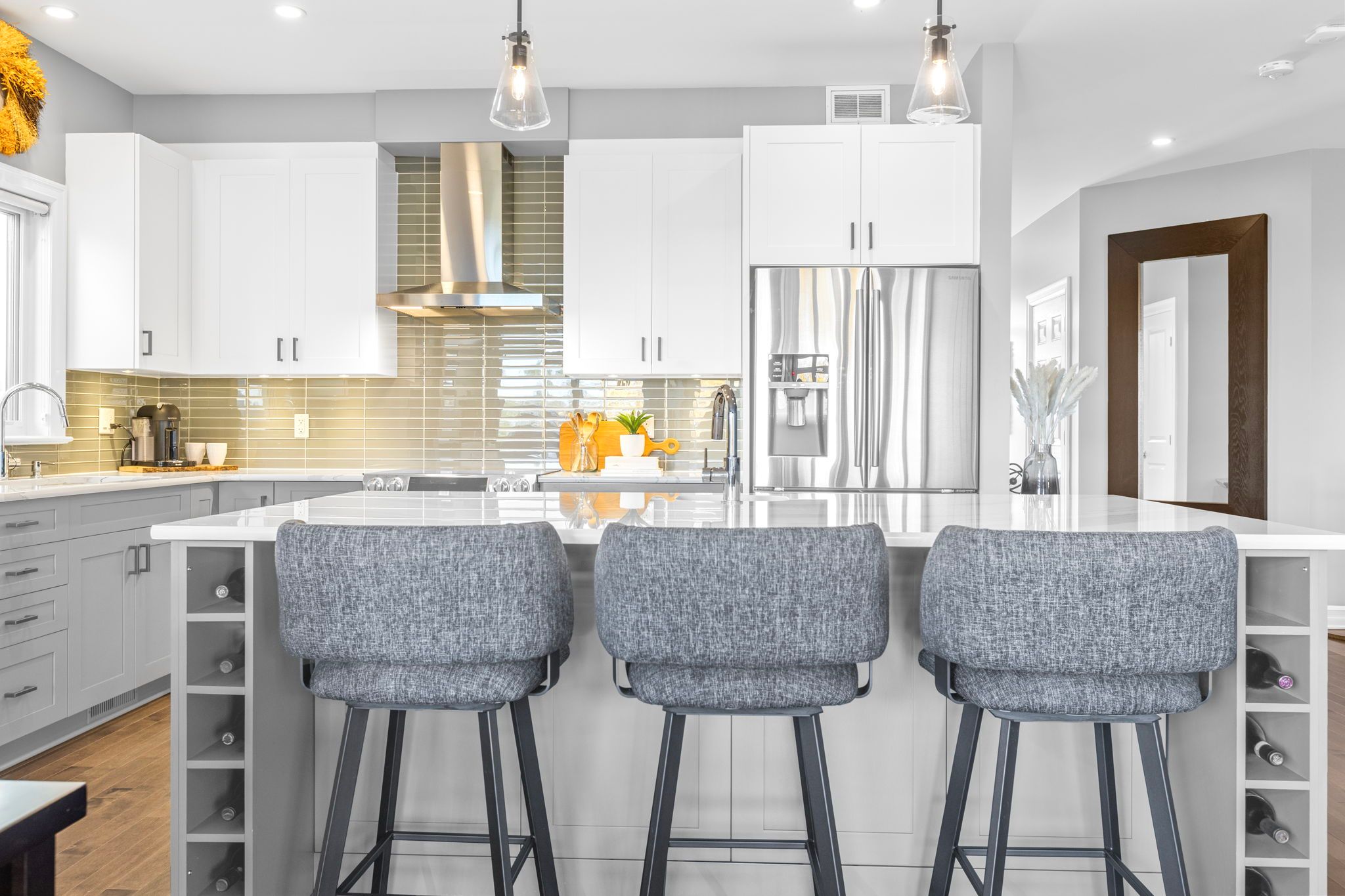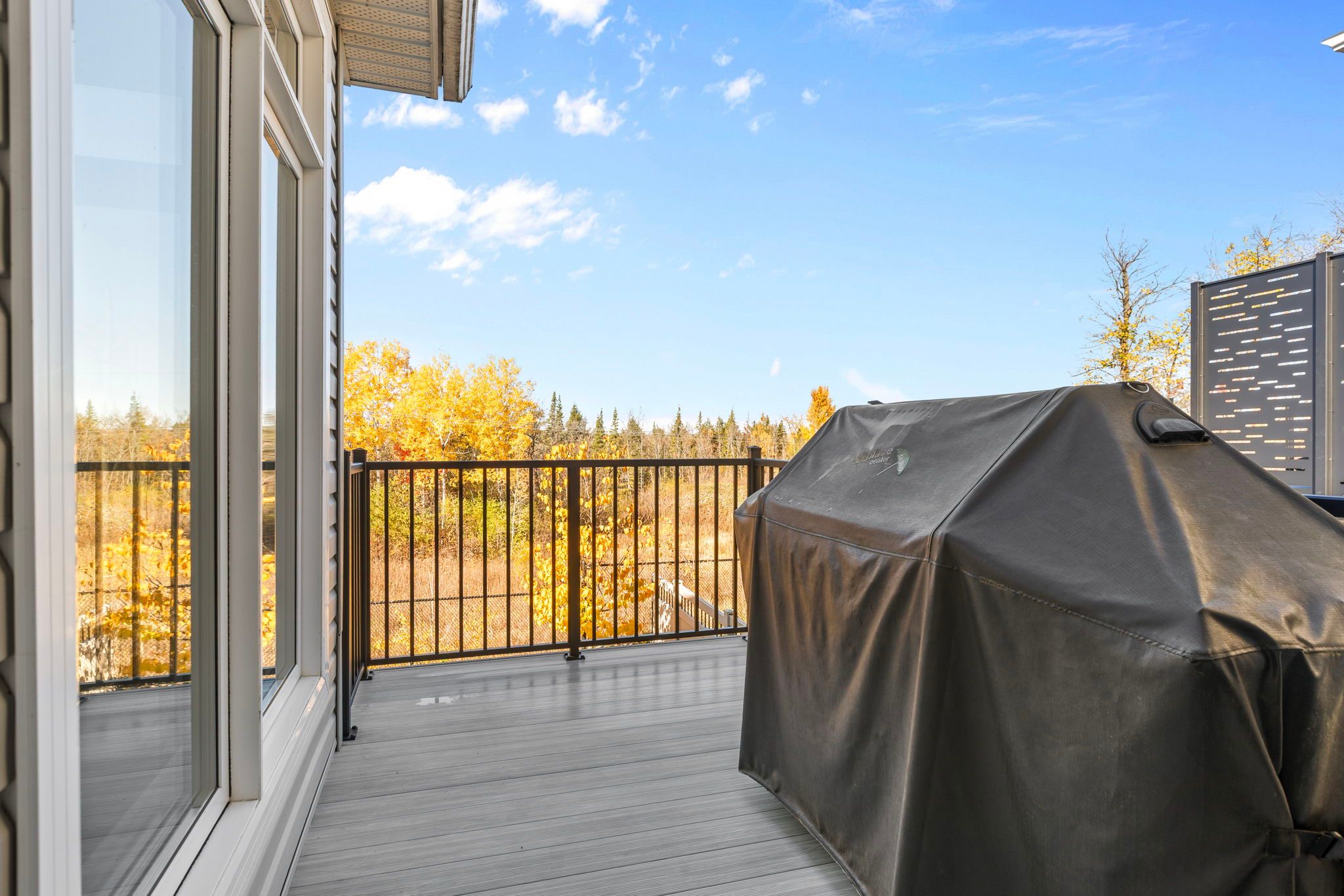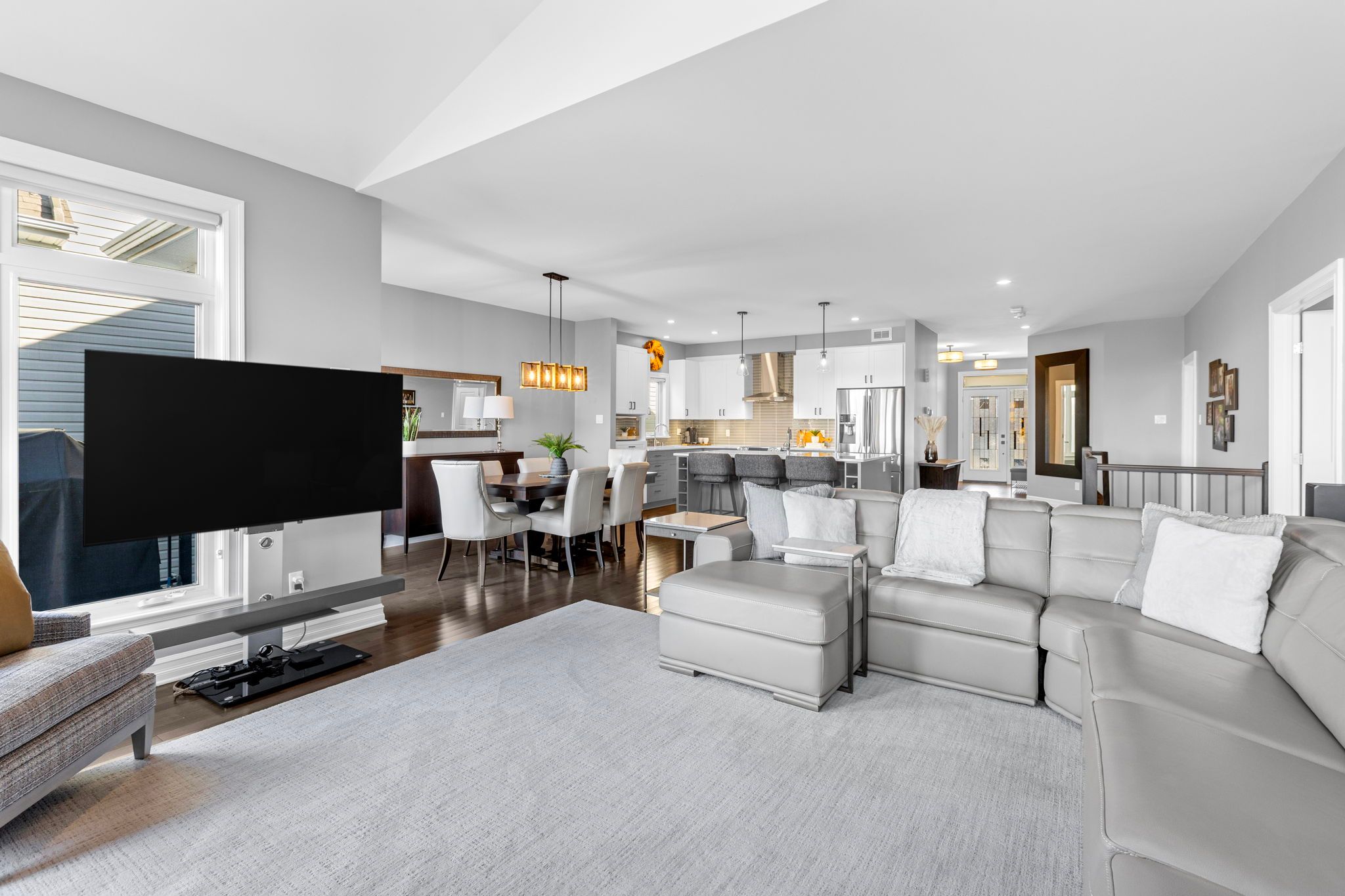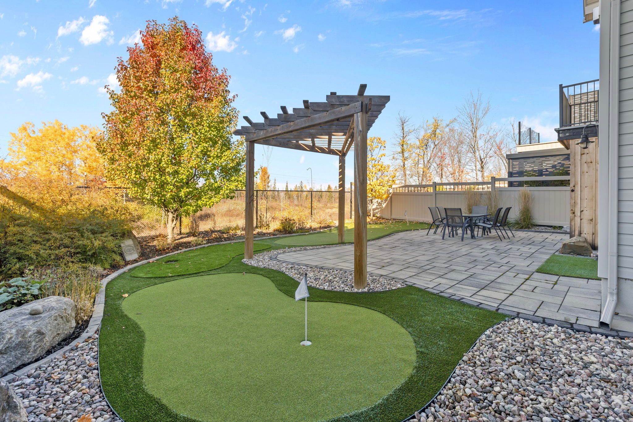 This impressive luxury bungalow offers exceptional design, high-end finishes, and an ideal location in cardinal creek backing onto peaceful green space and a scenic bike path. The exterior features an interlock walkway, covered front veranda, and landscaped grounds that enhance curb appeal. Inside, a spacious front foyer with subway tile flooring opens to 9' flat ceilings and an elegant open-concept layout. The chef's kitchen is the heart of the home, showcasing an oversized center island with breakfast bar, quartz countertops, two-tone cabinetry, a wine rack, and a deep 24" pantry. The recessed sink beneath a window provides backyard views, while the horizontal tile backsplash and modern lighting complete the look. The adjoining dining area offers access to an elevated balcony, perfect for outdoor dining or relaxing with a view. The living room is bright and welcoming, featuring hardwood flooring, high baseboards, wrap-around windows with a curved transom, cathedral ceiling, and a gas fireplace with tiled hearth. The rear primary bedroom includes a double-sided walk-in closet and a 4-piece ensuite with glass shower, stand-alone tub, and quartz vanity. A second bedroom or office with glass door, a 3-piece bath, and convenient main floor laundry complete the main level. The walk-out lower level is fully finished with 9' ceilings, pot lighting, and a spacious recreation room with patio access. Two additional bedrooms, a full 3-piece bath, and storage areas provide excellent flexibility for guests or family. The fenced backyard is beautifully landscaped and designed for relaxation and entertainment, gazebo, patio, putting green, and storage shed. Located close to walking trails and a short 15 minute walk to new lrt station, this property combines luxury, comfort, and convenience in one exceptional package.