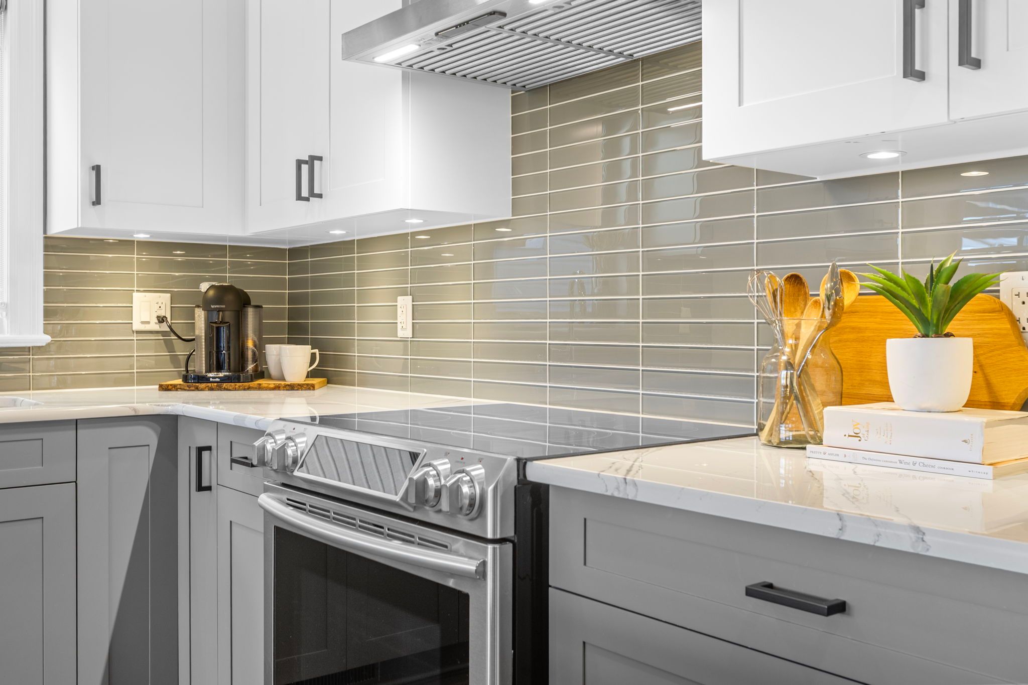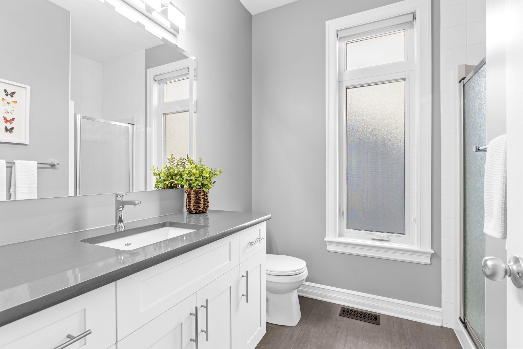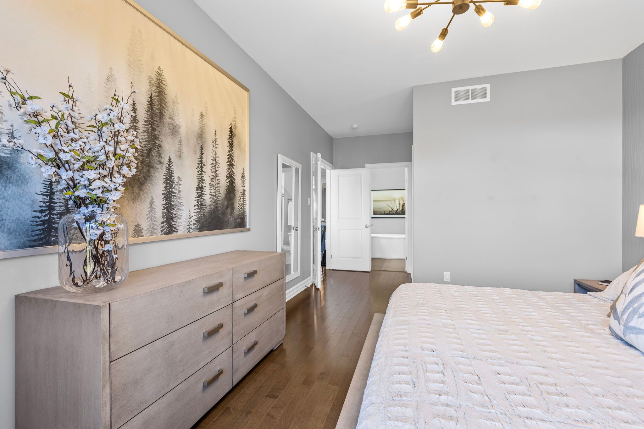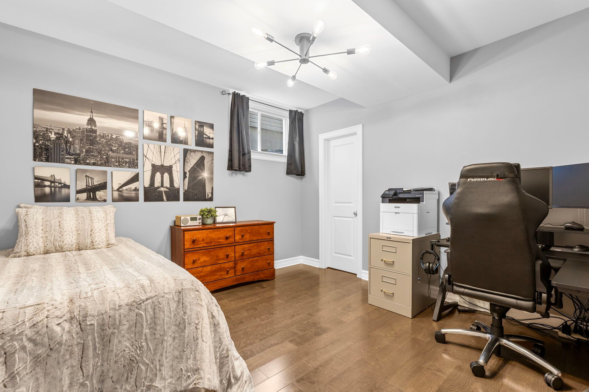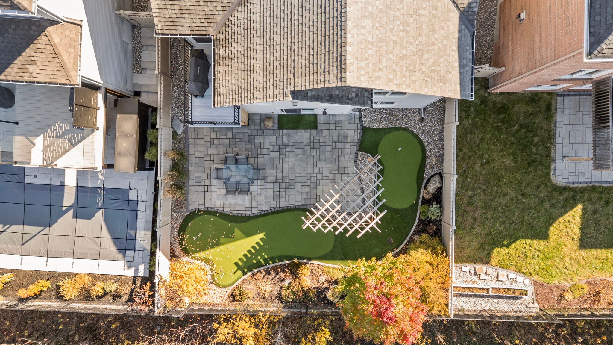 This impressive luxury bungalow offers exceptional design, high-end finishes, and an ideal location in cardinal creek backing onto peaceful green space and a scenic bike path. The exterior features an interlock walkway, covered front veranda, and landscaped grounds that enhance curb appeal. Inside, a spacious front foyer with subway tile flooring opens to 9' flat ceilings and an elegant open-concept layout. The chef's kitchen is the heart of the home, showcasing an oversized center island with breakfast bar, quartz countertops, two-tone cabinetry, a wine rack, and a deep 24" pantry. The recessed sink beneath a window provides backyard views, while the horizontal tile backsplash and modern lighting complete the look. The adjoining dining area offers access to an elevated balcony, perfect for outdoor dining or relaxing with a view. The living room is bright and welcoming, featuring hardwood flooring, high baseboards, wrap-around windows with a curved transom, cathedral ceiling, and a gas fireplace with tiled hearth. The rear primary bedroom includes a double-sided walk-in closet and a 4-piece ensuite with glass shower, stand-alone tub, and quartz vanity. A second bedroom or office with glass door, a 3-piece bath, and convenient main floor laundry complete the main level. The walk-out lower level is fully finished with 9' ceilings, pot lighting, and a spacious recreation room with patio access. Two additional bedrooms, a full 3-piece bath, and storage areas provide excellent flexibility for guests or family. The fenced backyard is beautifully landscaped and designed for relaxation and entertainment, gazebo, patio, putting green, and storage shed. Located close to walking trails and a short 15 minute walk to new lrt station, this property combines luxury, comfort, and convenience in one exceptional package.