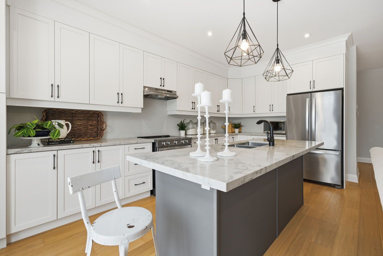 • Spacious kitchen featuring custom cabinetry, quartz countertops, and a breakfast bar.