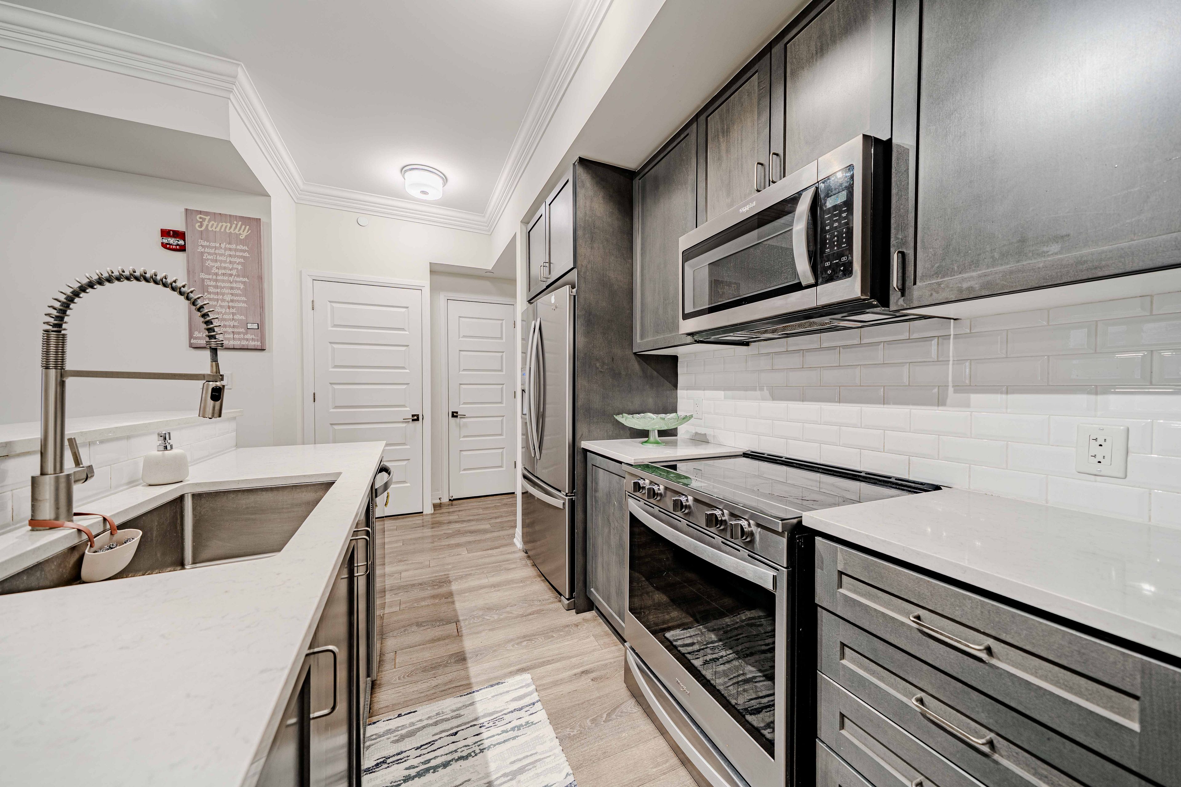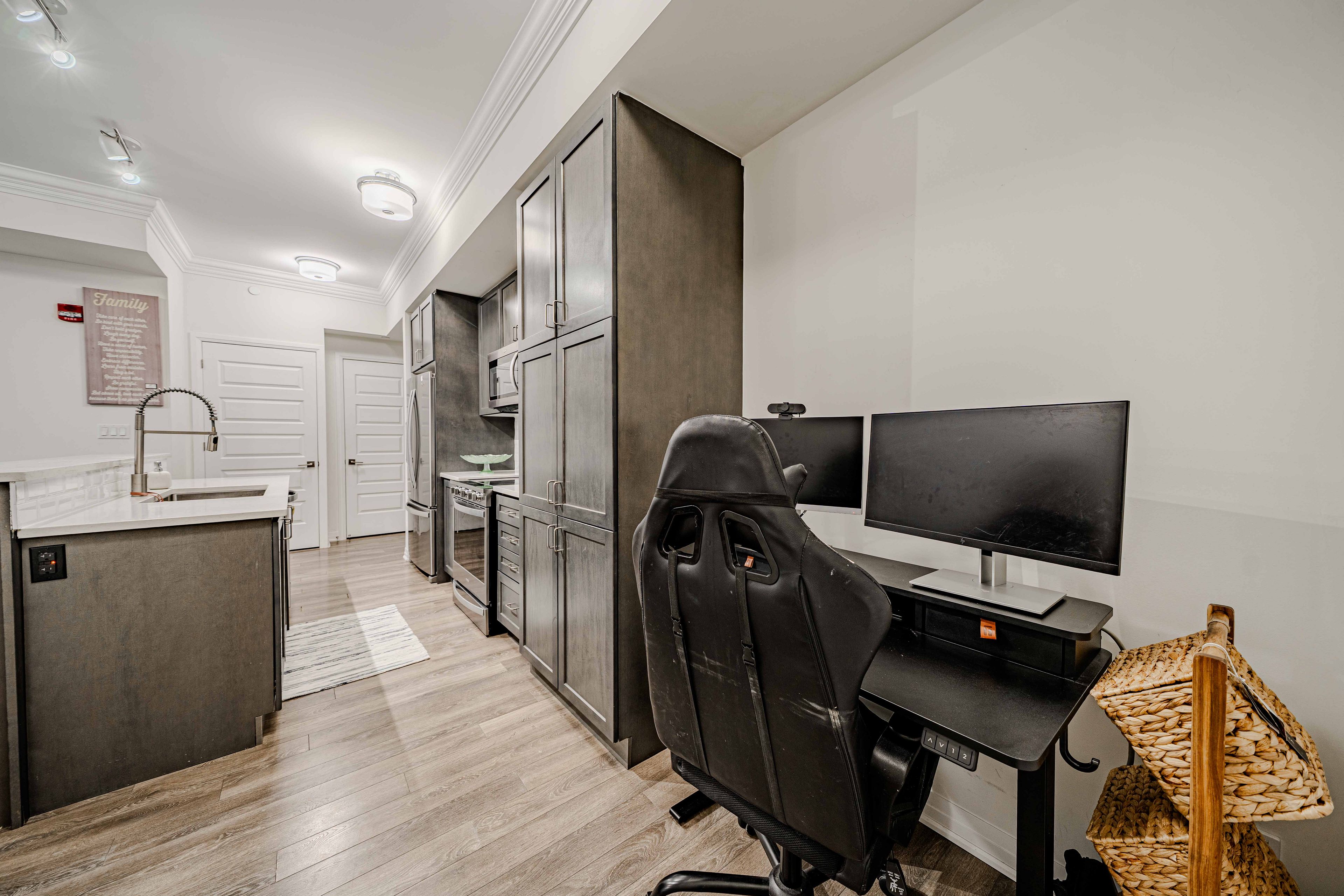 Welcome to the crown jewel of markham in the highly sought-after community of cornell, offering this beautifully upgraded 2-bedroom + den, 2 full bathroom home with a stunning open-concept layout designed for modern living. Enjoy a private walkout patio with convenient access to visitor parking, perfect for everyday ease and entertaining. With over $50k in upgrades, this immaculate unit features laminate flooring throughout, smooth 10-foot ceilings with elegant 7" crown moulding, and large windows that flood the space with natural light. The designer kitchen showcases quartz countertops, a large island, ceramic backsplash, single undermount sink, and an oversized custom builder pantry, while the upgraded bathrooms provide spa-like finishes including quartz countertops, raised vanities with extra storage, glass walk-in shower with full-height tile and pot lighting, high-efficiency dual flush toilets, premium fixtures, and large-format stone floor tiles. Additional highlights include a spacious primary bedroom with walk-in closet, custom fitted double-door closet in the second bedroom, california shutters throughout, full-size stainless steel laundry with steamer feature, high-efficiency water heater, and internet included in condo fees. Residents enjoy excellent building amenities including a party room with pool table, fully equipped fitness centre, and rooftop bbq patio. Includes 1 parking space and 1 locker, all appliances, electrical light fixtures, and window coverings, and is ideally located close to transit, schools, community centre, library, hospital, and parks, offering the perfect blend of comfort, convenience, and upscale community living.