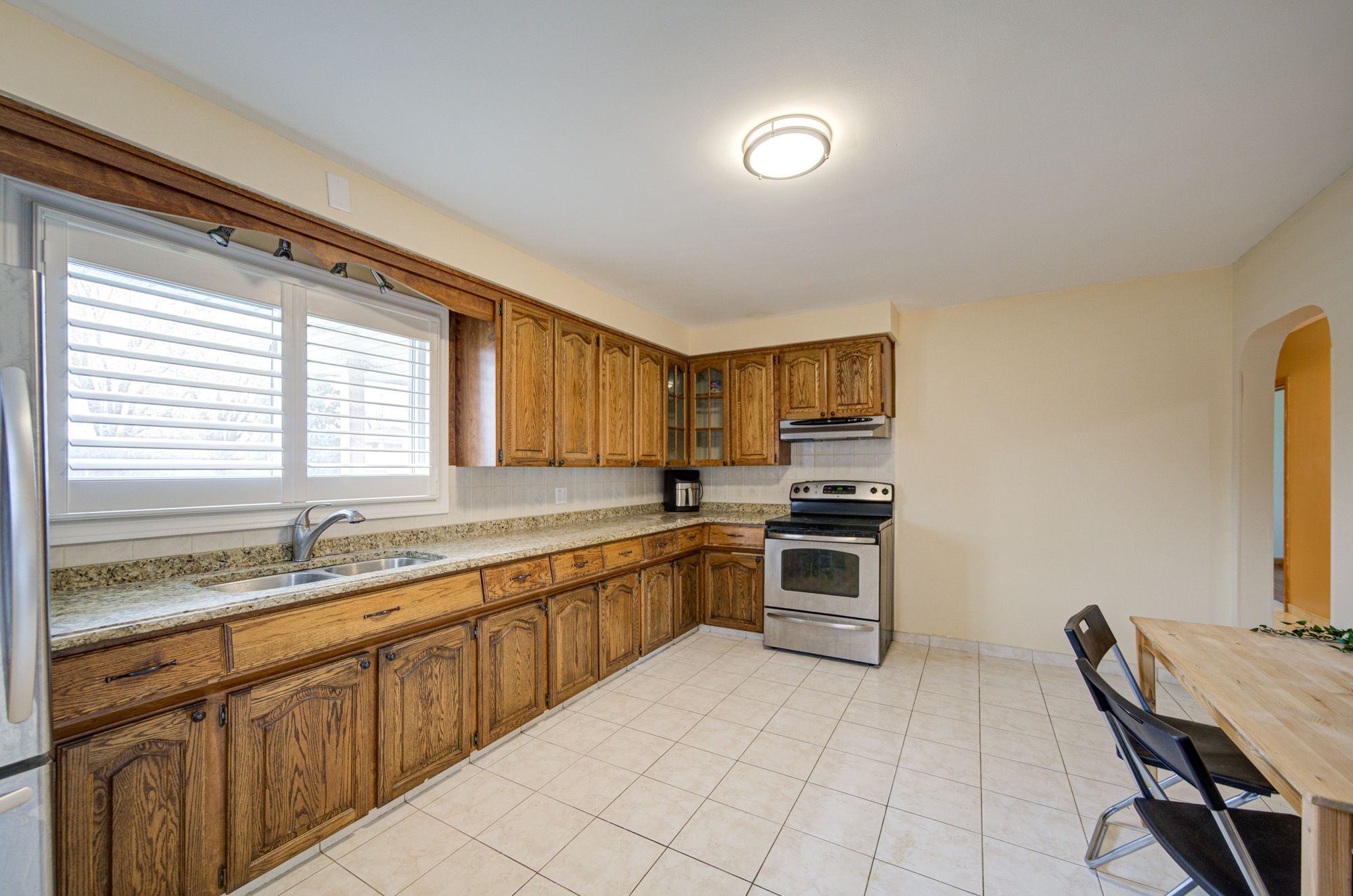 • Kitchen features oak cabinetry and granite countertops for practical use.