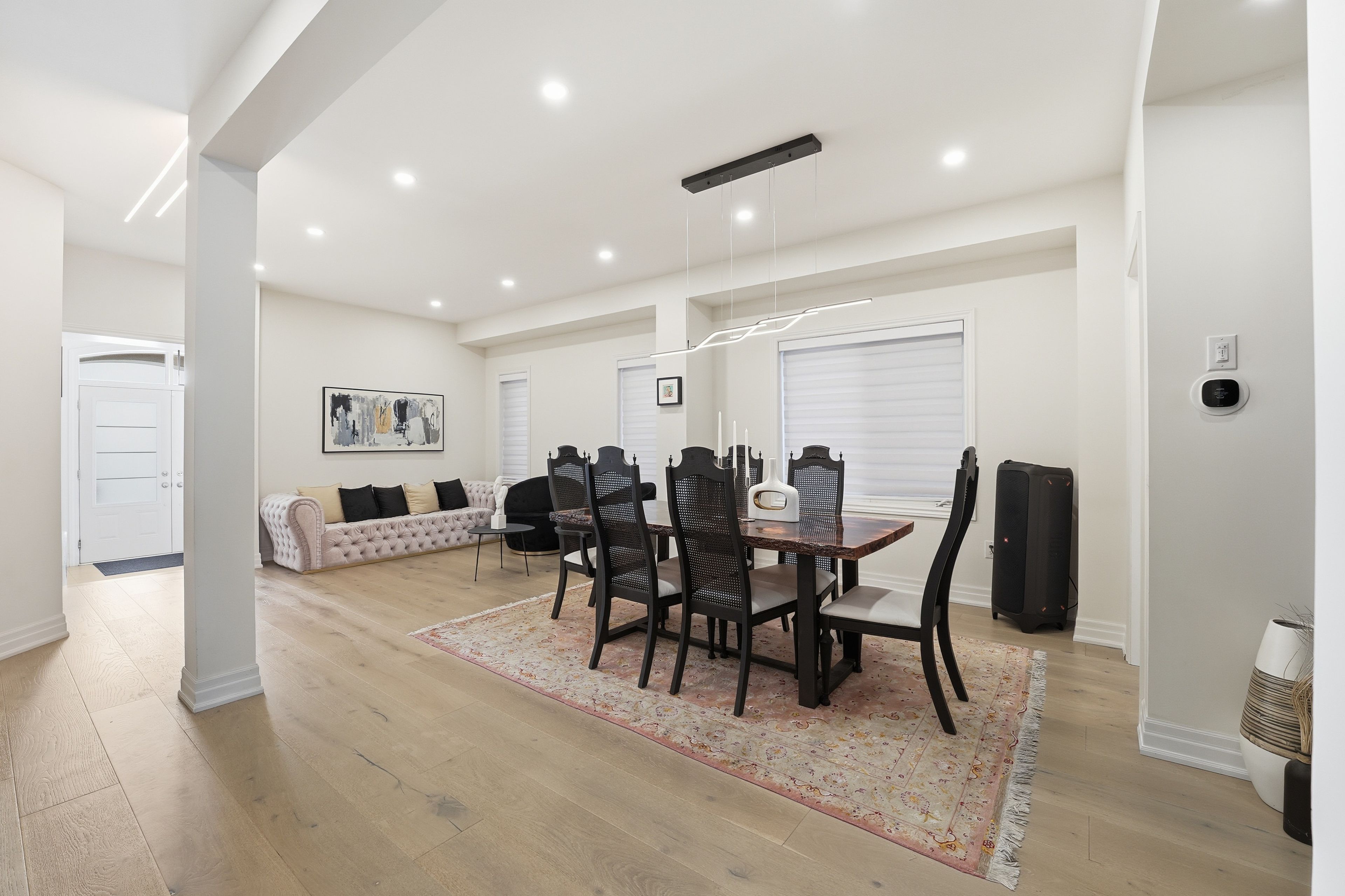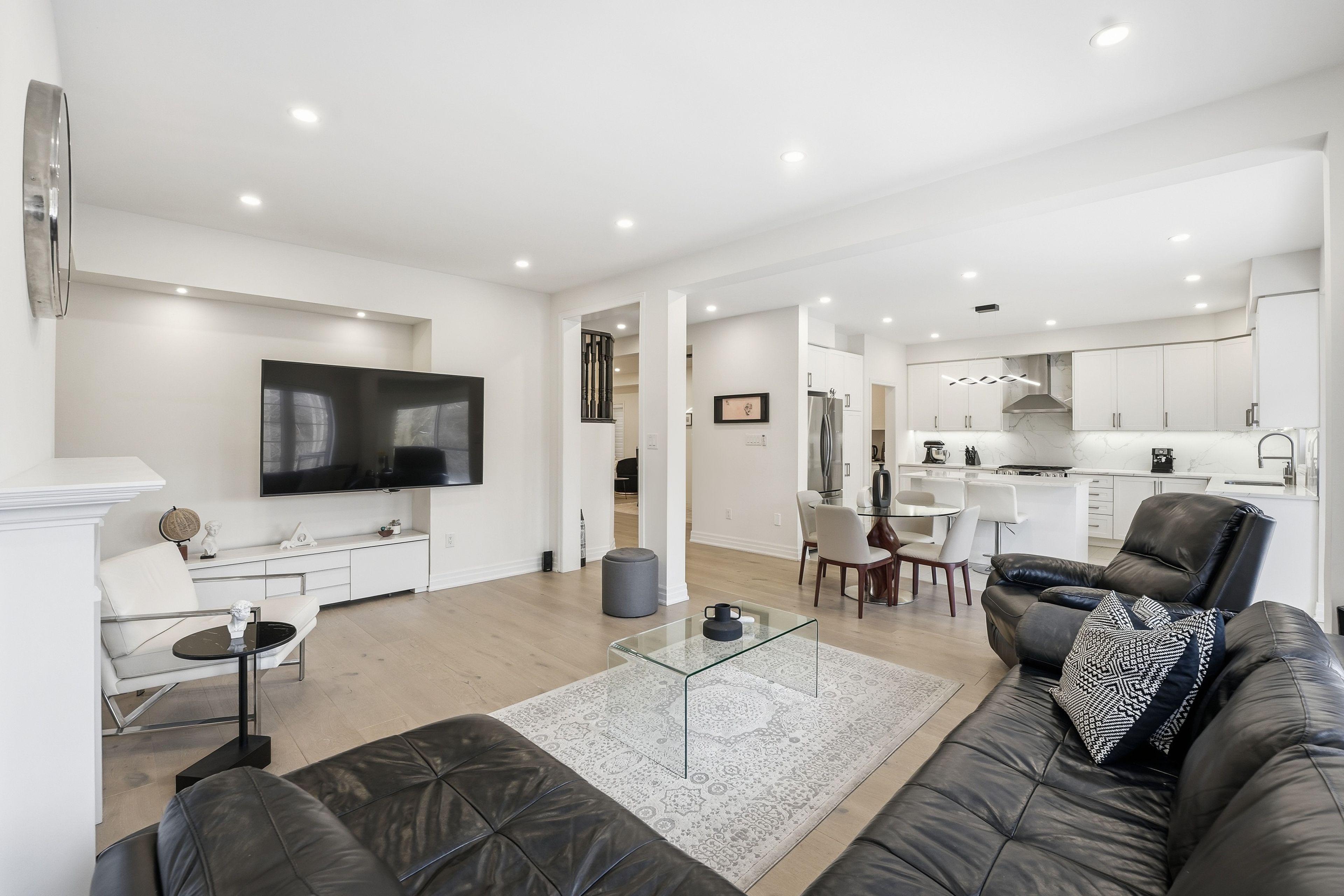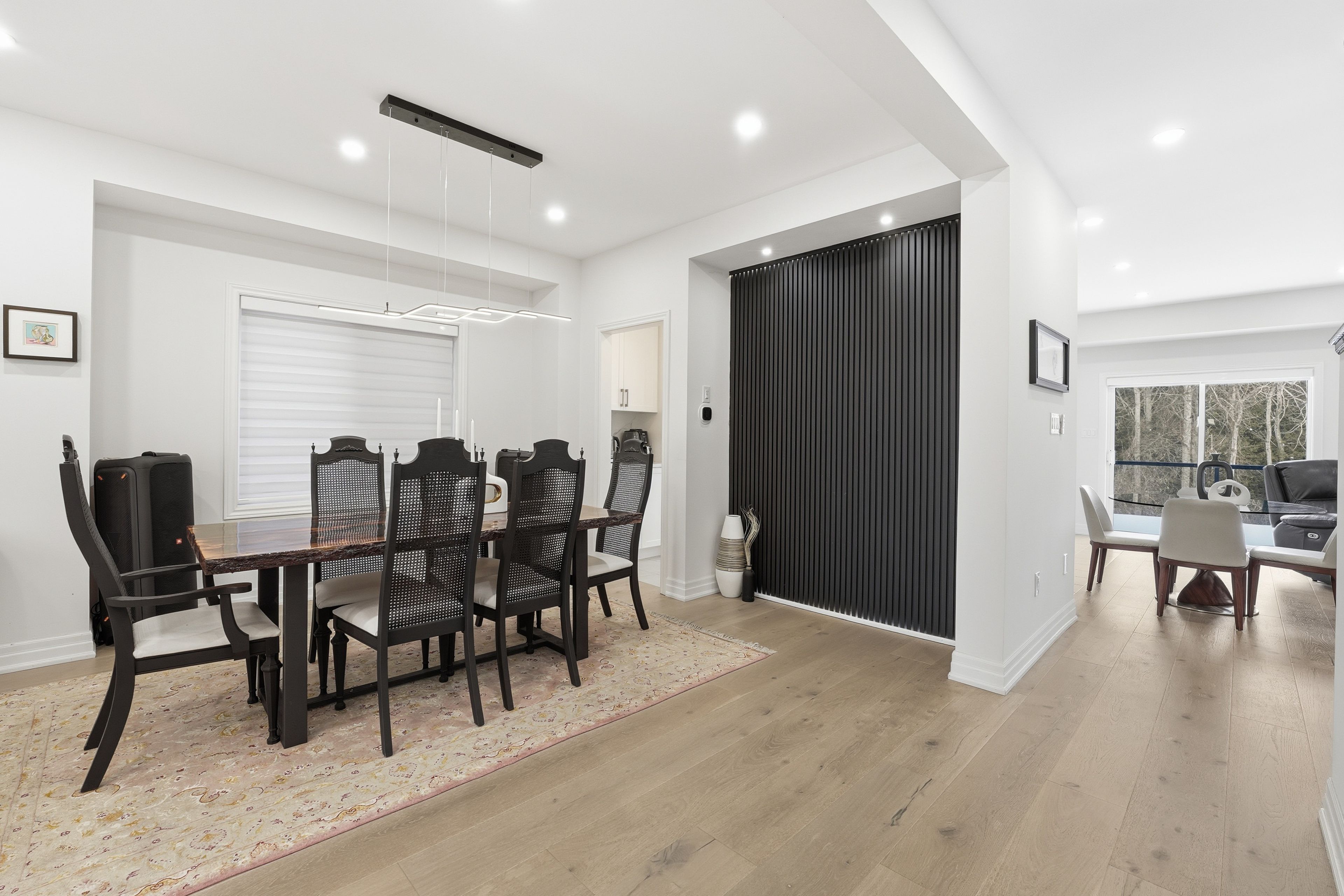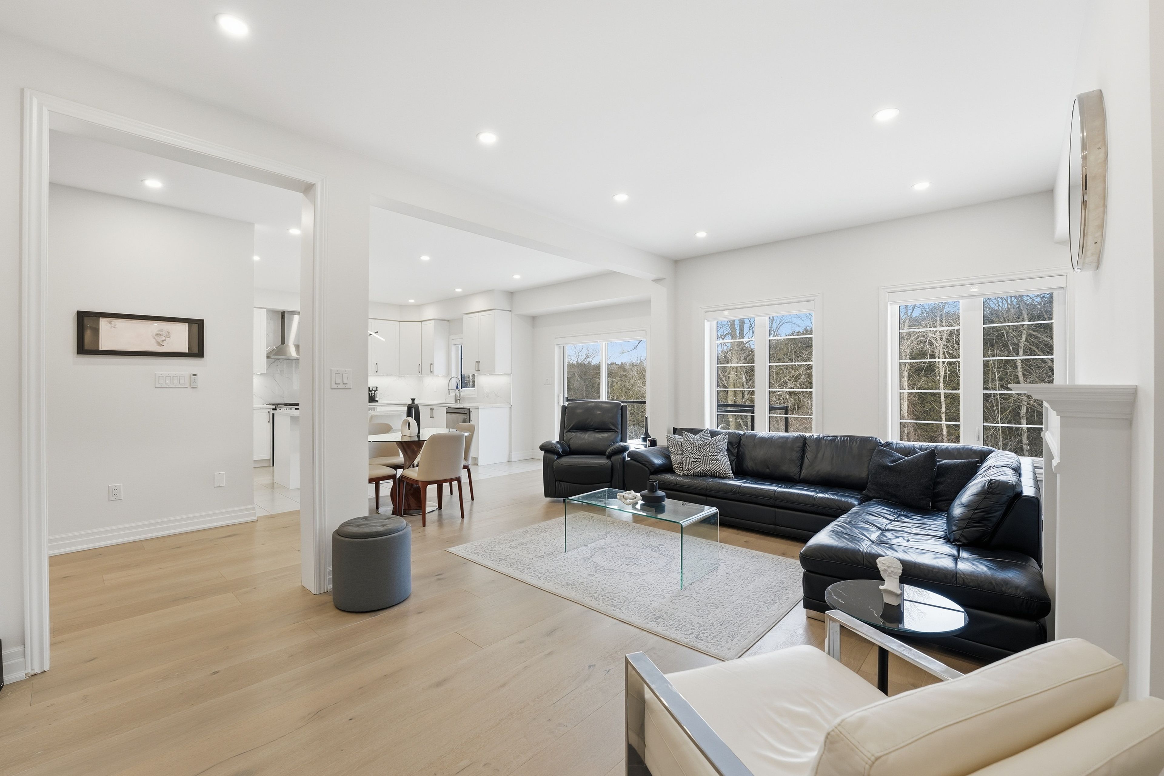 Stunning 5-bedroom executive home nestled on a premium street in sharon, east gwillimbury. Fully renovated main floor featuring 9-ft ceilings, wide-plank premium 9-inch hardwood (full glued-down), modern pot lights throughout interior and exterior, and an upgraded kitchen designed for everyday living and entertainment. Offering nearly 4,500 sq. Ft of total living space (approx. 3,100 sq. Ft above grade), this residence delivers generous principal rooms, bright windows, and an ideal family layout with private ravine setting. Premium upgrades include: wi-fi smart security system, wi-fi smart garage door opener, water softener, wi-fi water shut-off system for flood protection, 60-amp electric vehicle charger,and remote-controlled blinds throughout. Large 250 sq. Ft deck overlooking a lush ravine and scenic walking trail - perfect for outdoor gatherings with unmatched privacy. Unfinished walk-out basement offering tremendous potential for future expansion. Minutes to top amenities, schools, parks, shopping, and transit. A rare opportunity to own beautifully upgraded home in a highly sought-after pocket of sharon.