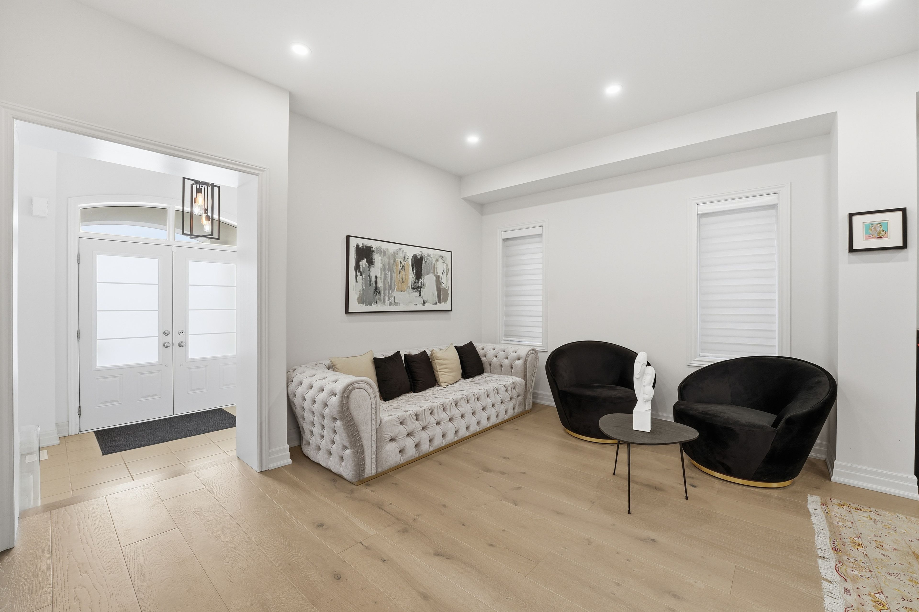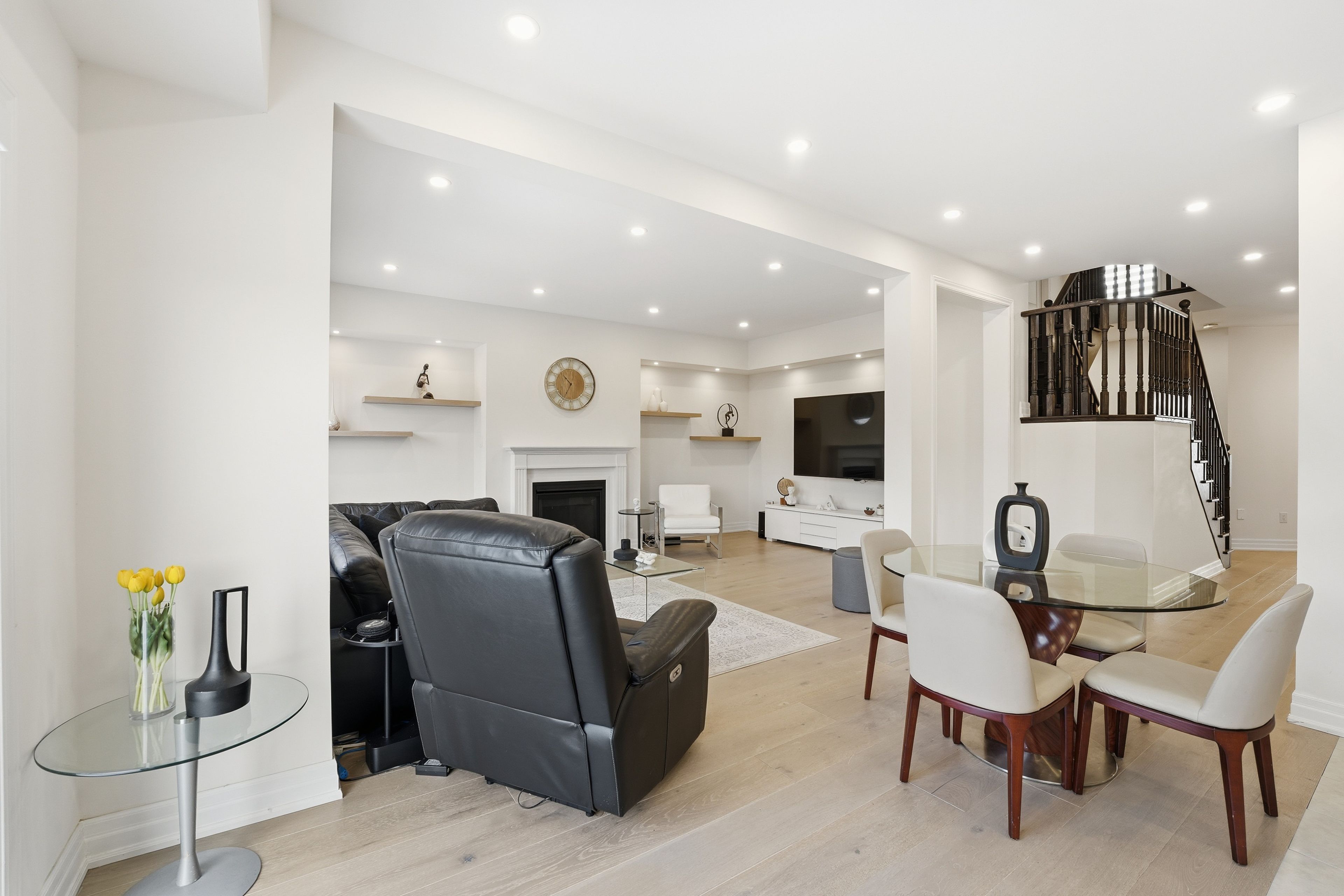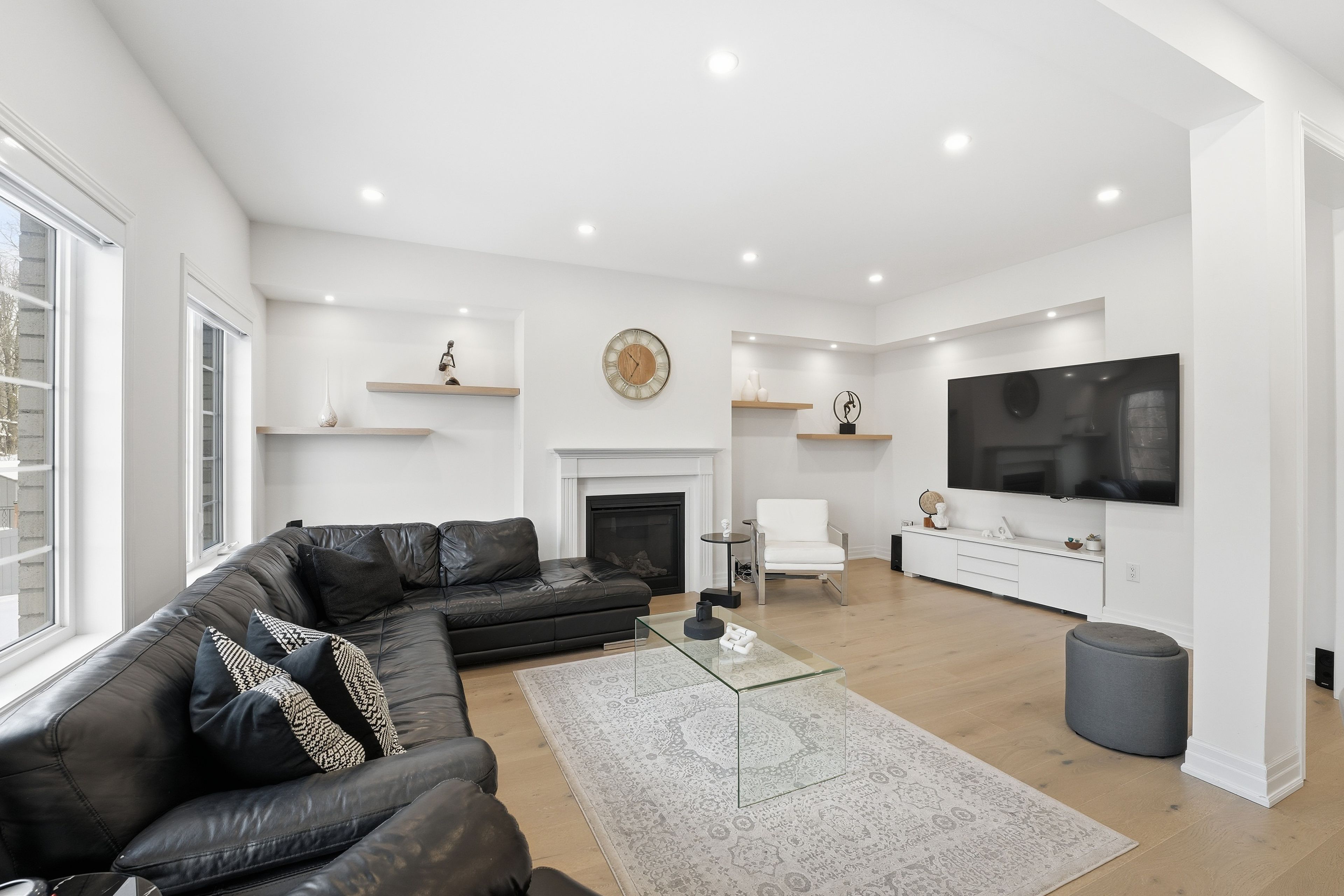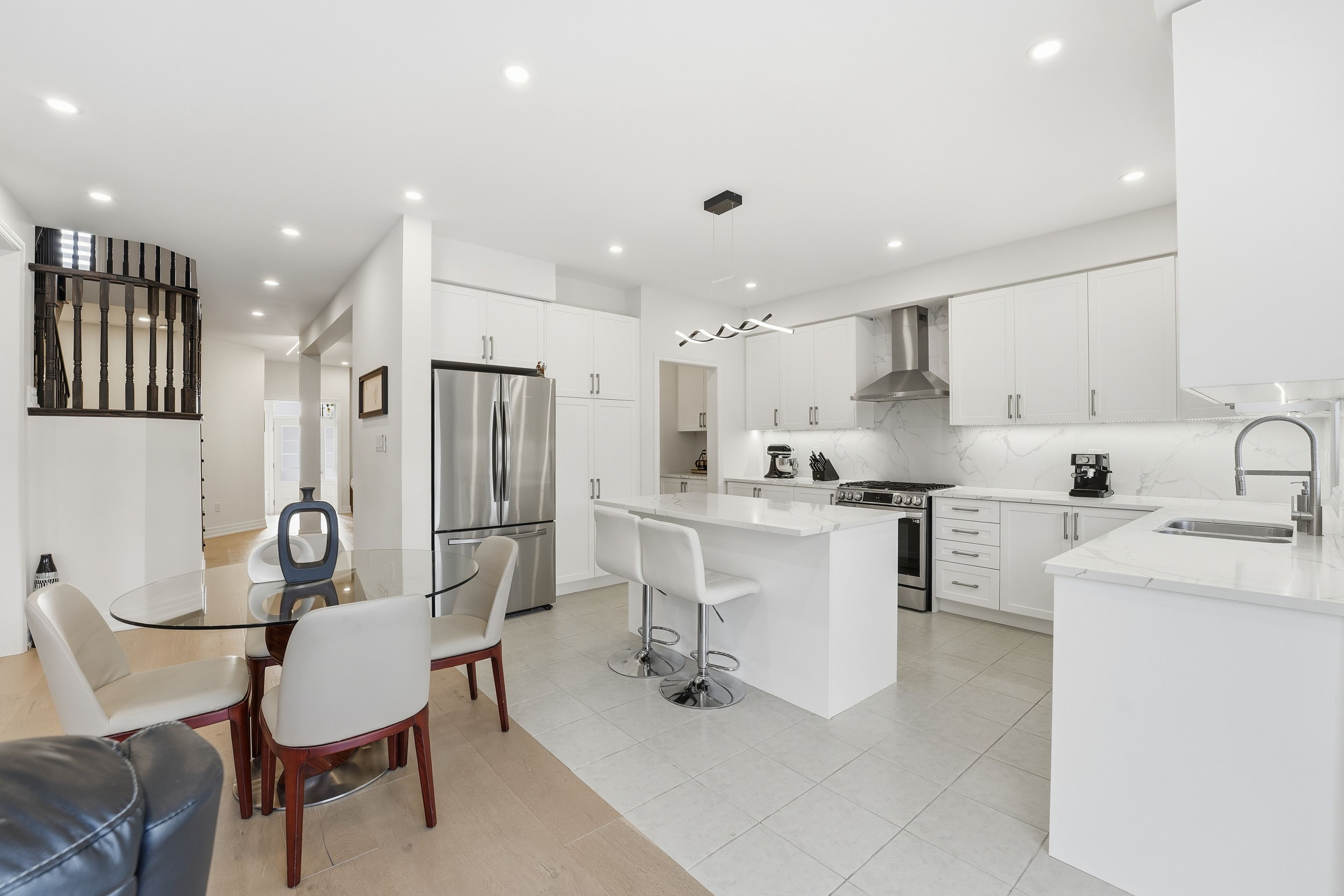 Stunning 5-bedroom executive home nestled on a premium street in sharon, east gwillimbury. Fully renovated main floor featuring 9-ft ceilings, wide-plank premium 9-inch hardwood (full glued-down), modern pot lights throughout interior and exterior, and an upgraded kitchen designed for everyday living and entertainment. Offering nearly 4,500 sq. Ft of total living space (approx. 3,100 sq. Ft above grade), this residence delivers generous principal rooms, bright windows, and an ideal family layout with private ravine setting. Premium upgrades include: wi-fi smart security system, wi-fi smart garage door opener, water softener, wi-fi water shut-off system for flood protection, 60-amp electric vehicle charger,and remote-controlled blinds throughout. Large 250 sq. Ft deck overlooking a lush ravine and scenic walking trail - perfect for outdoor gatherings with unmatched privacy. Unfinished walk-out basement offering tremendous potential for future expansion. Minutes to top amenities, schools, parks, shopping, and transit. A rare opportunity to own beautifully upgraded home in a highly sought-after pocket of sharon.