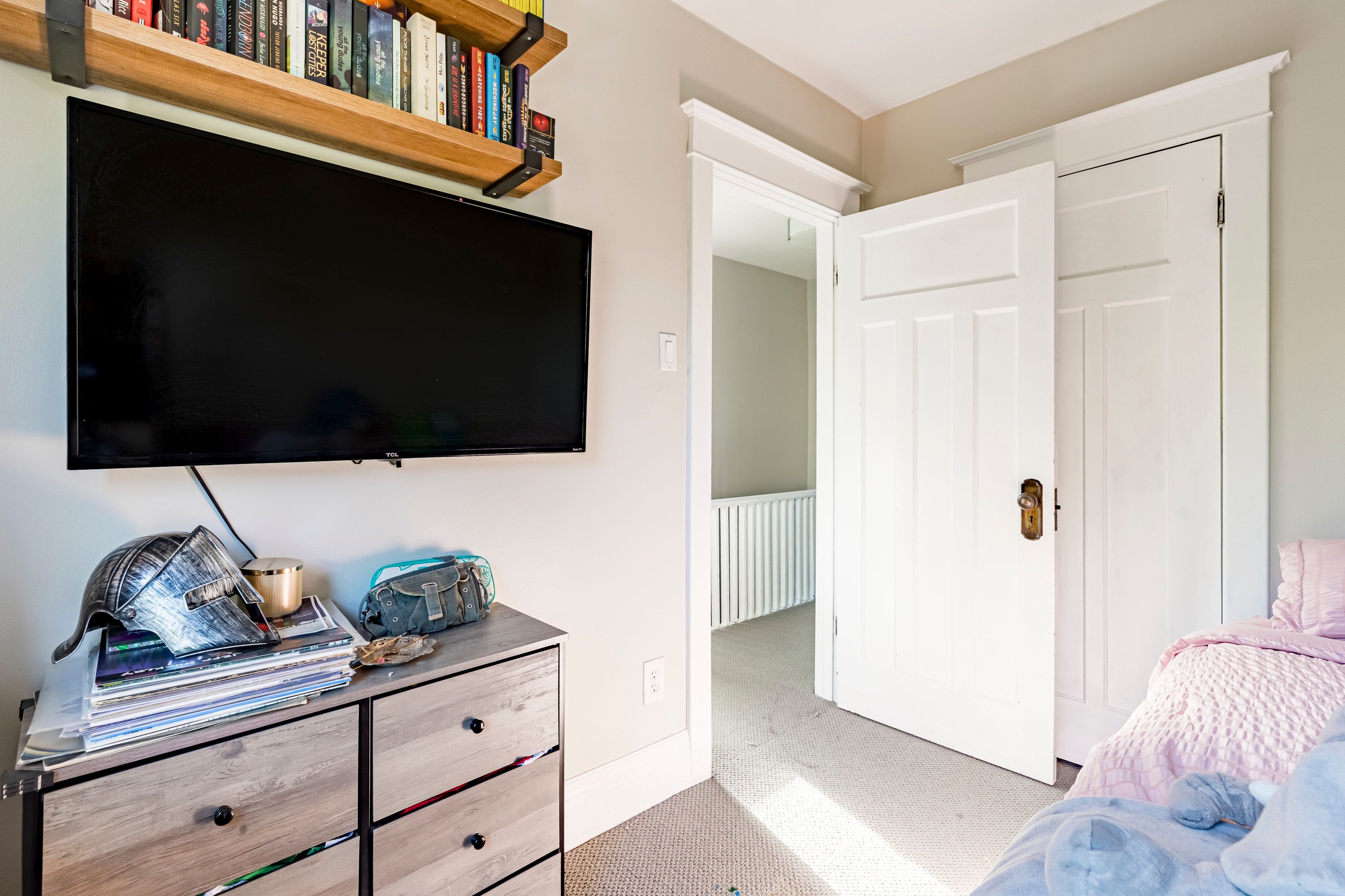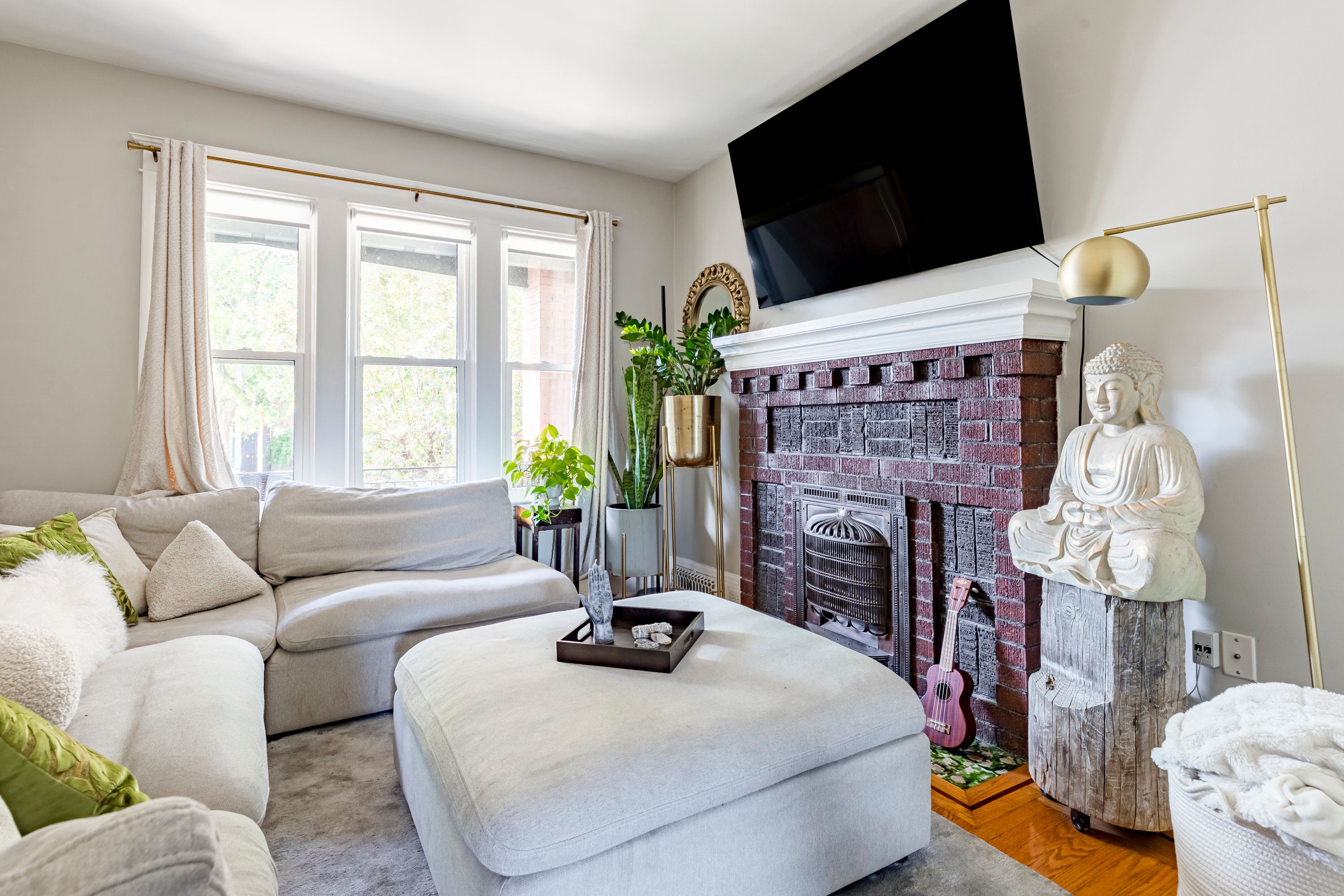 • Original hardwood floors and ornamental fireplace enhance the interior.