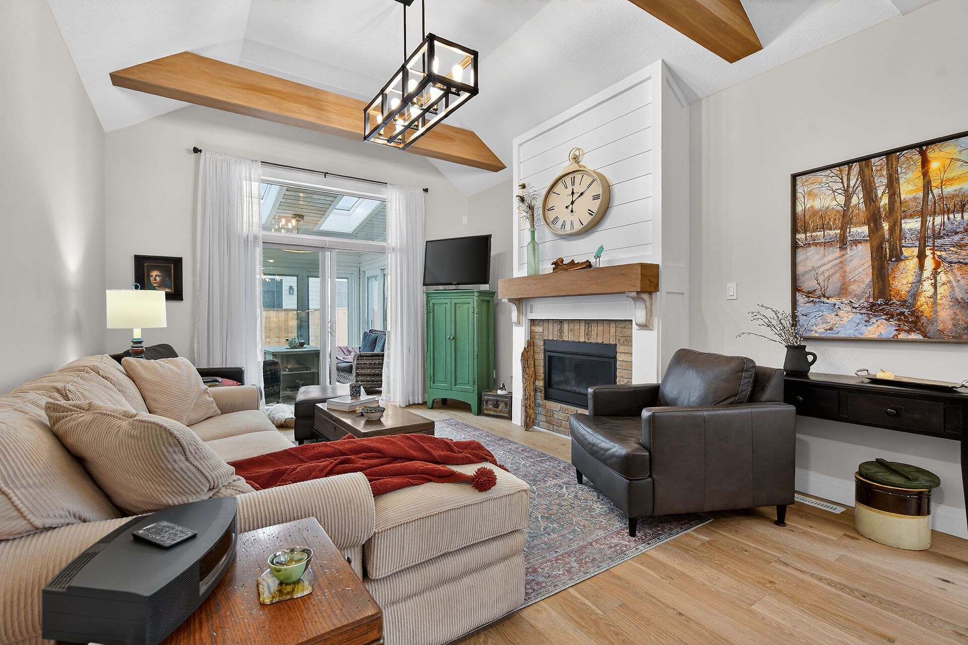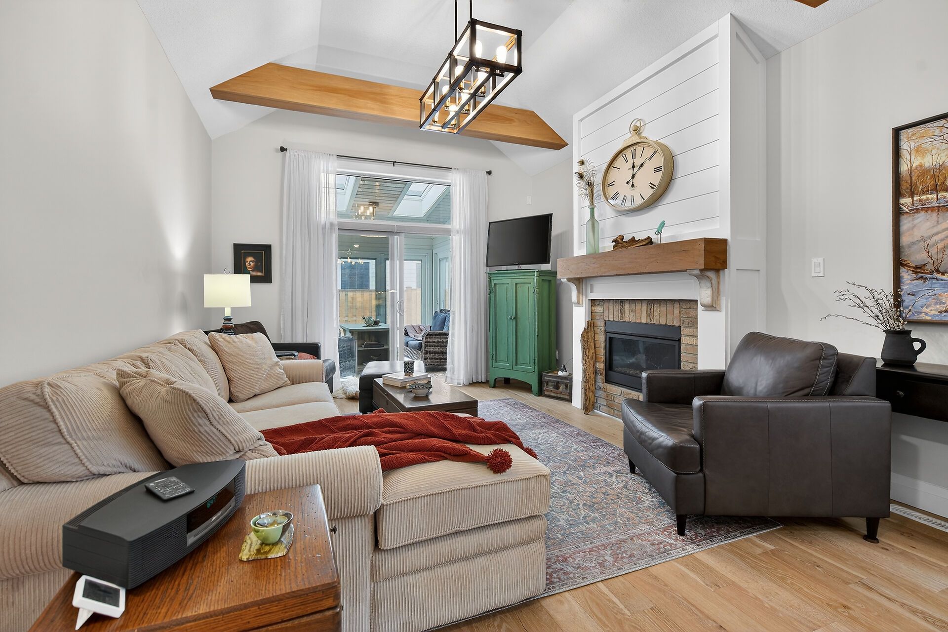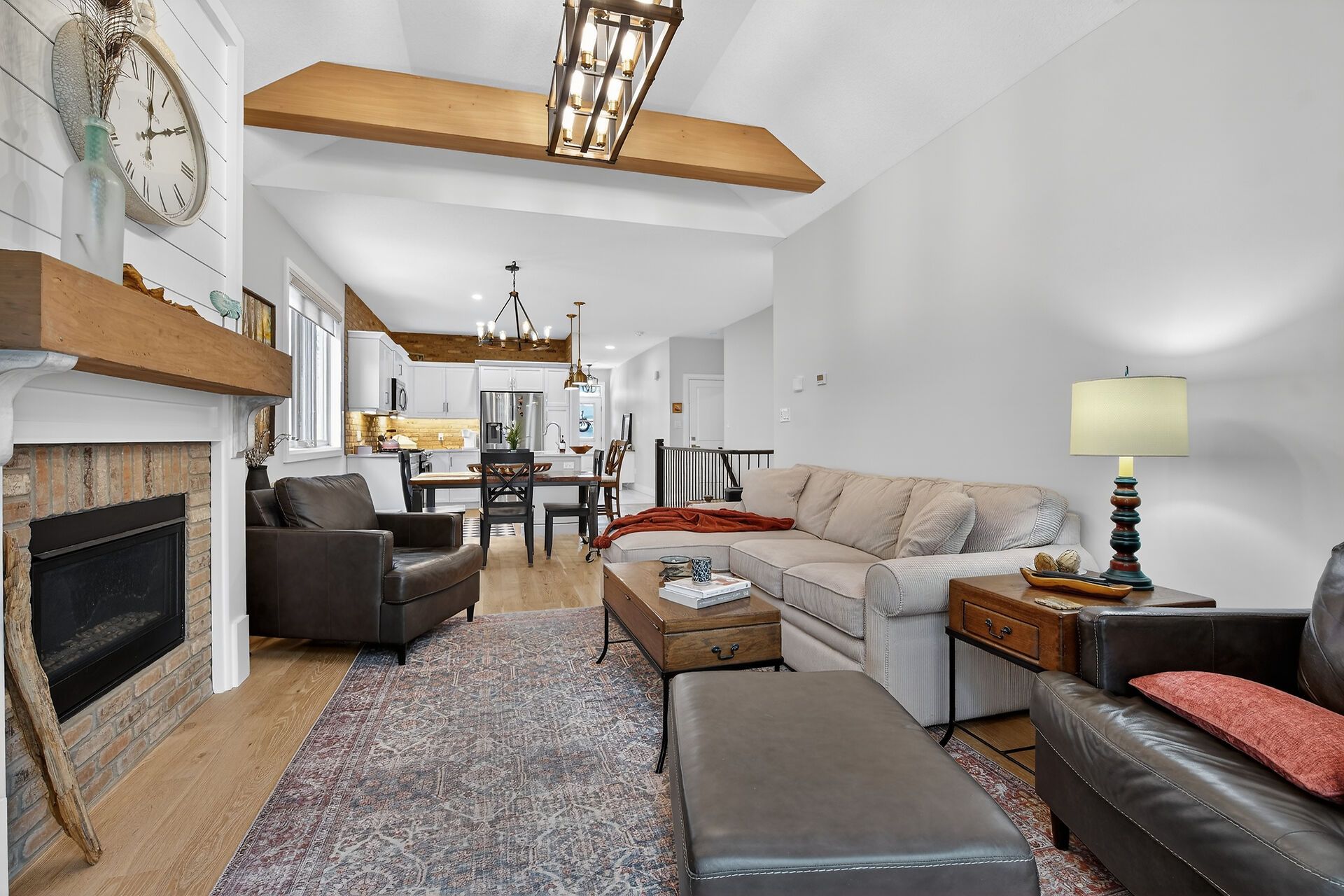 • Open concept living area features cozy gas fireplace and modern kitchen.