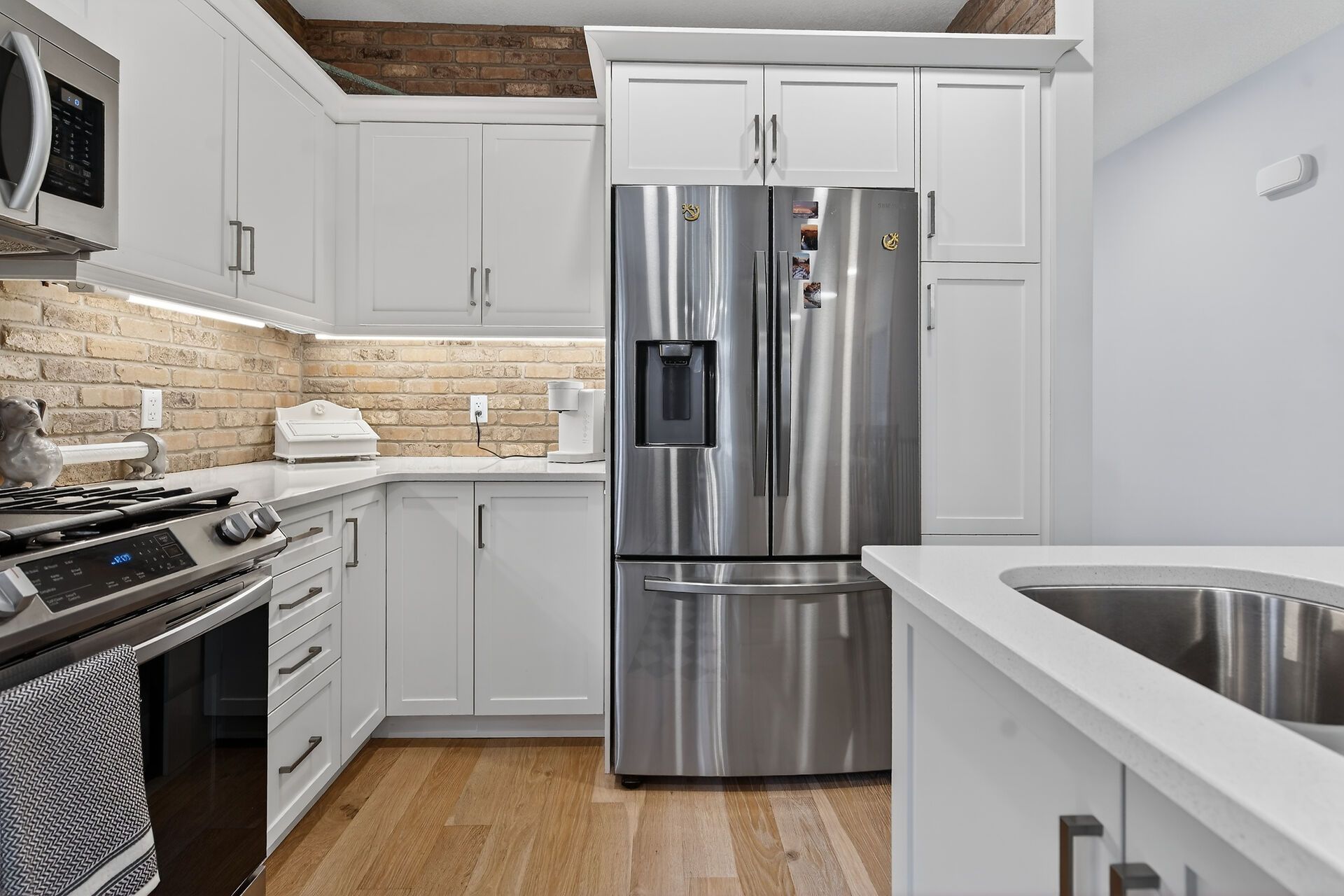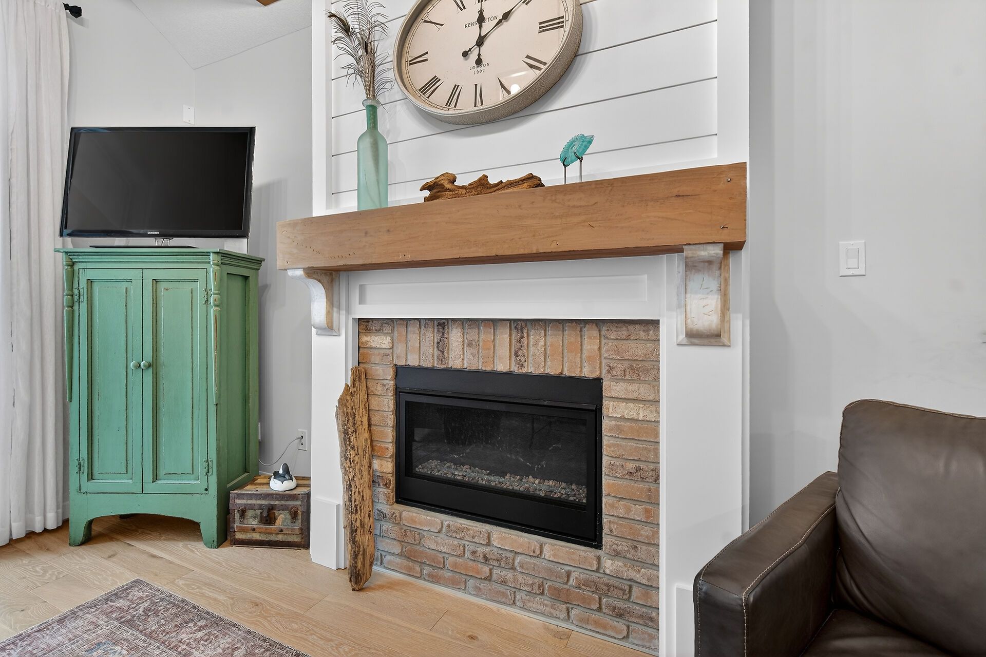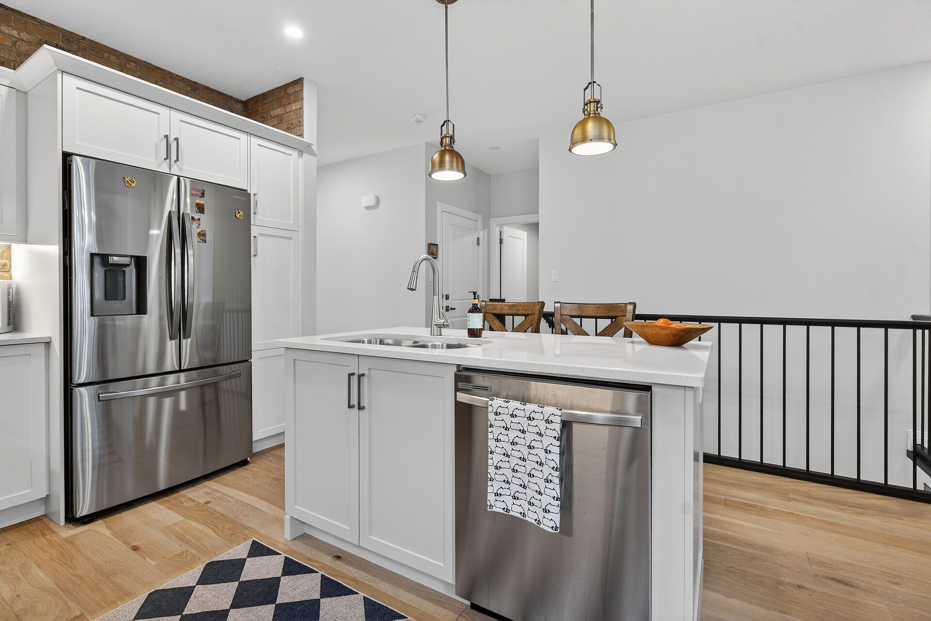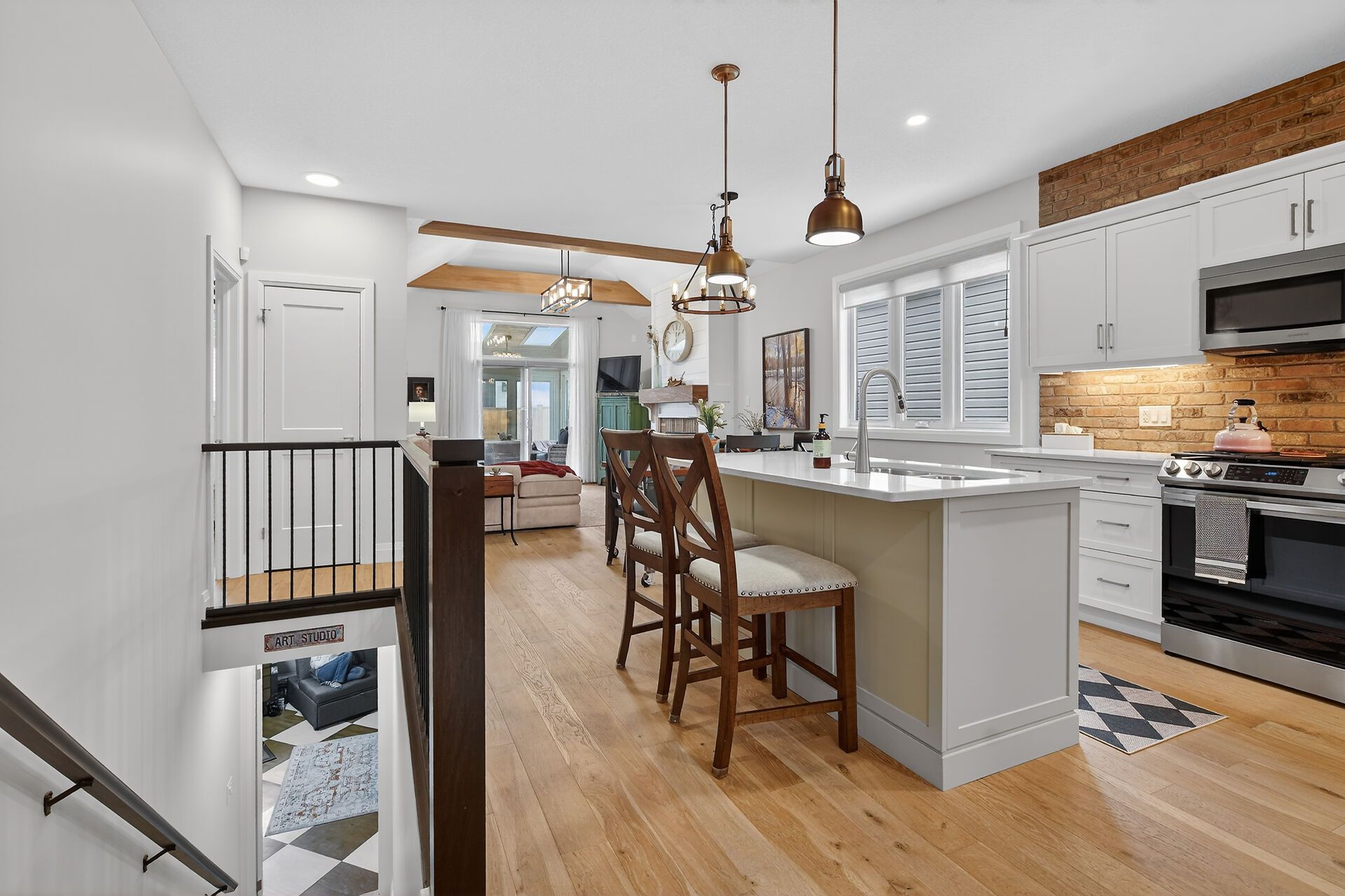 • Open concept living area features cozy gas fireplace and modern kitchen.
