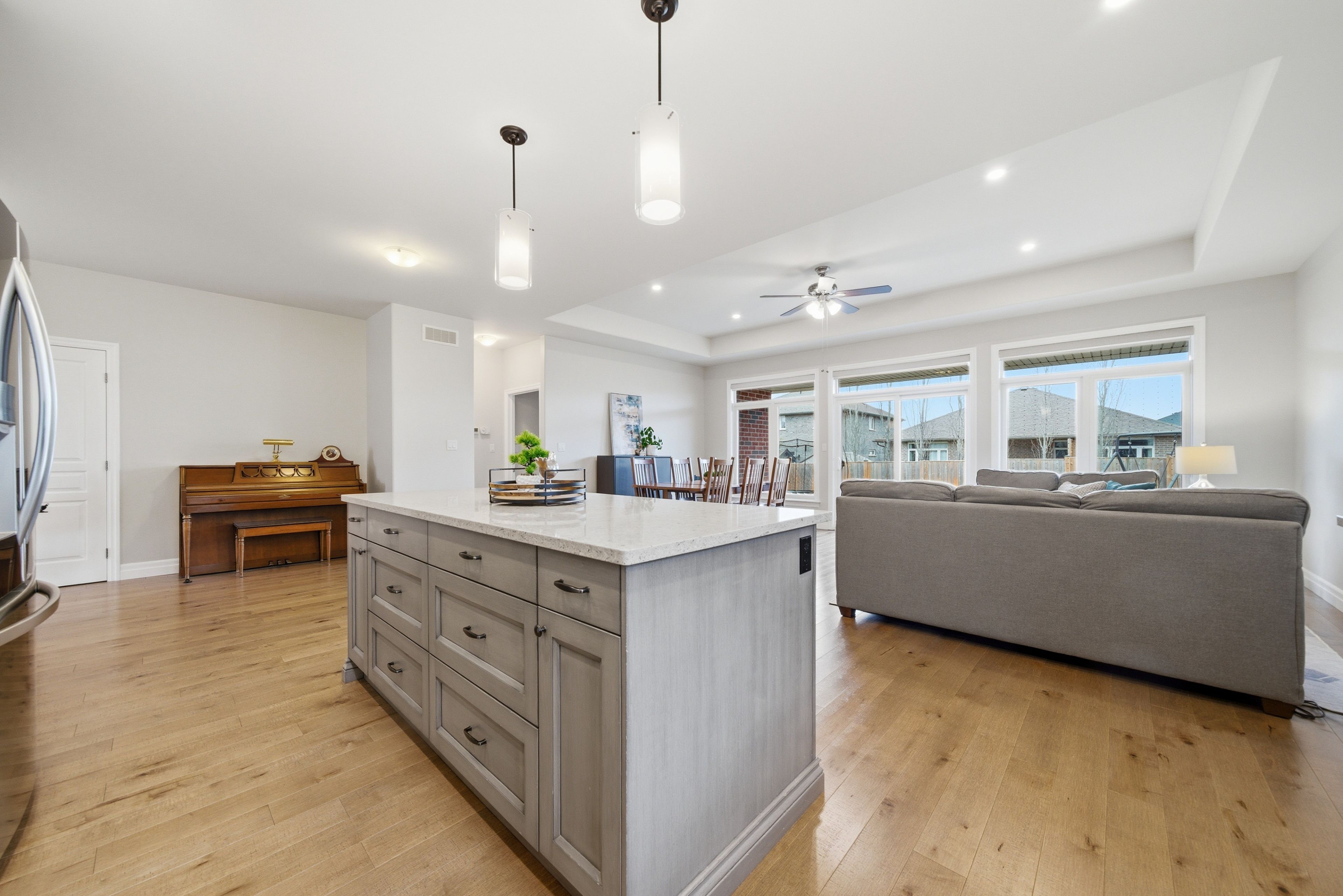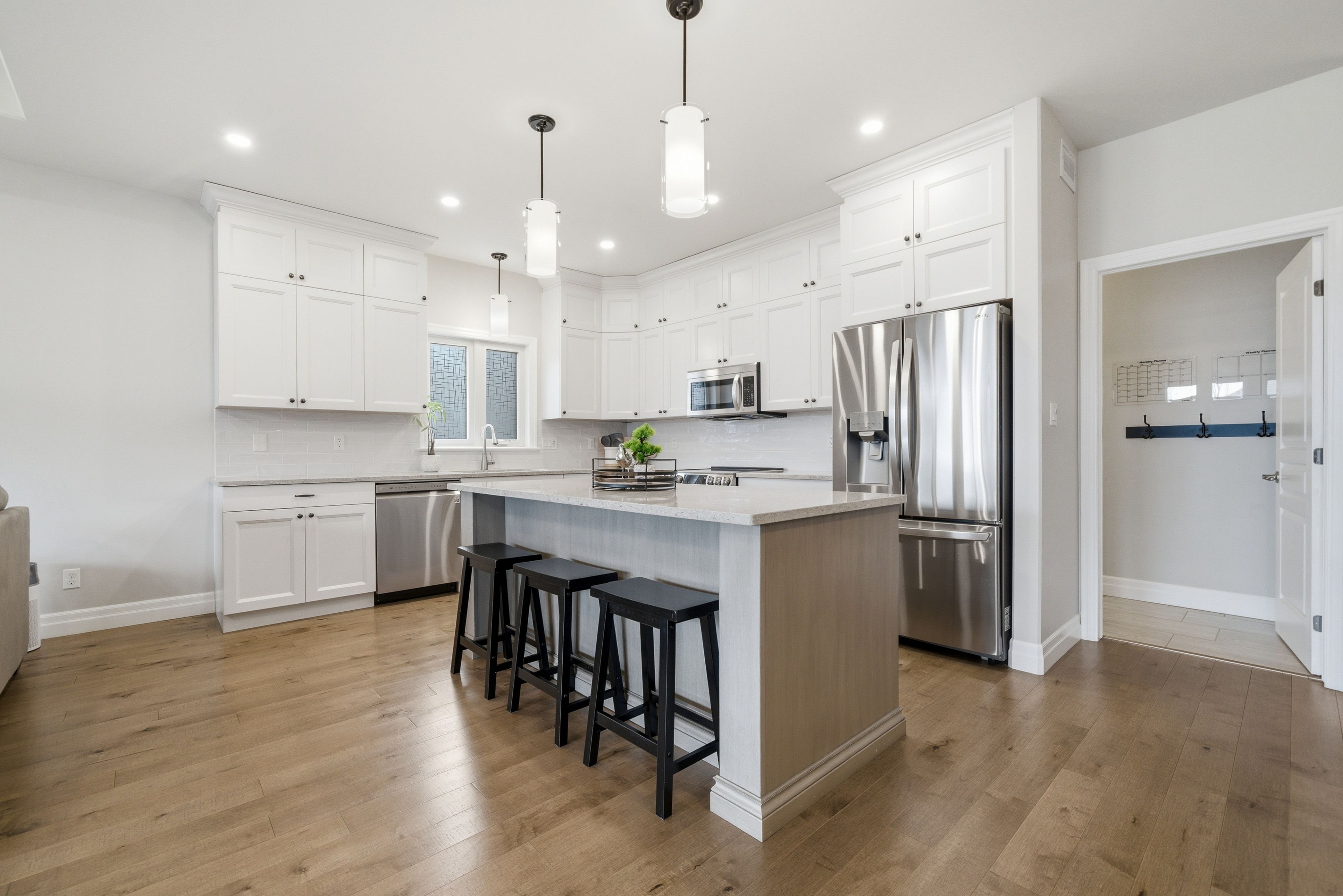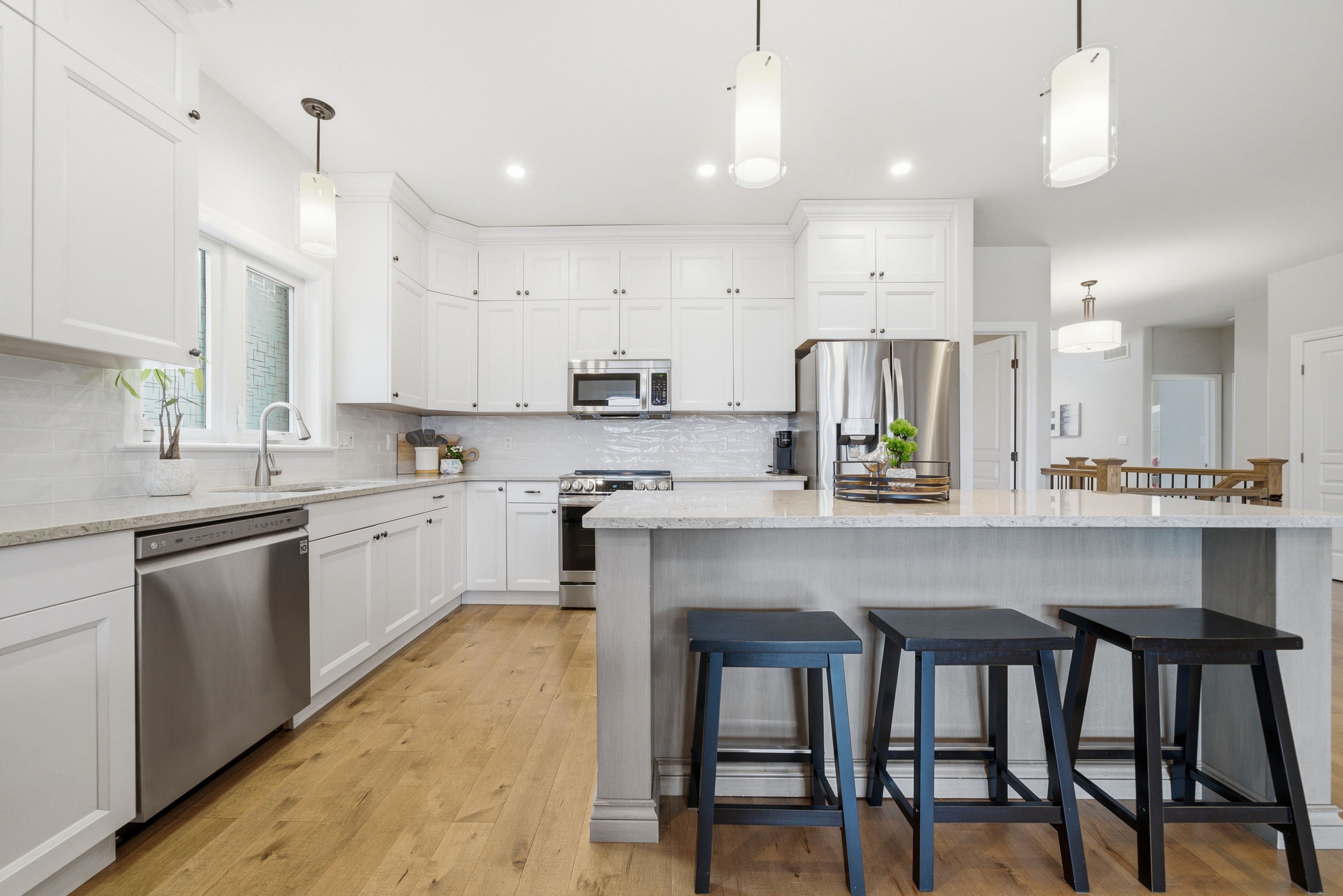 • Chef-inspired kitchen with quartz countertops and large eat-in island.