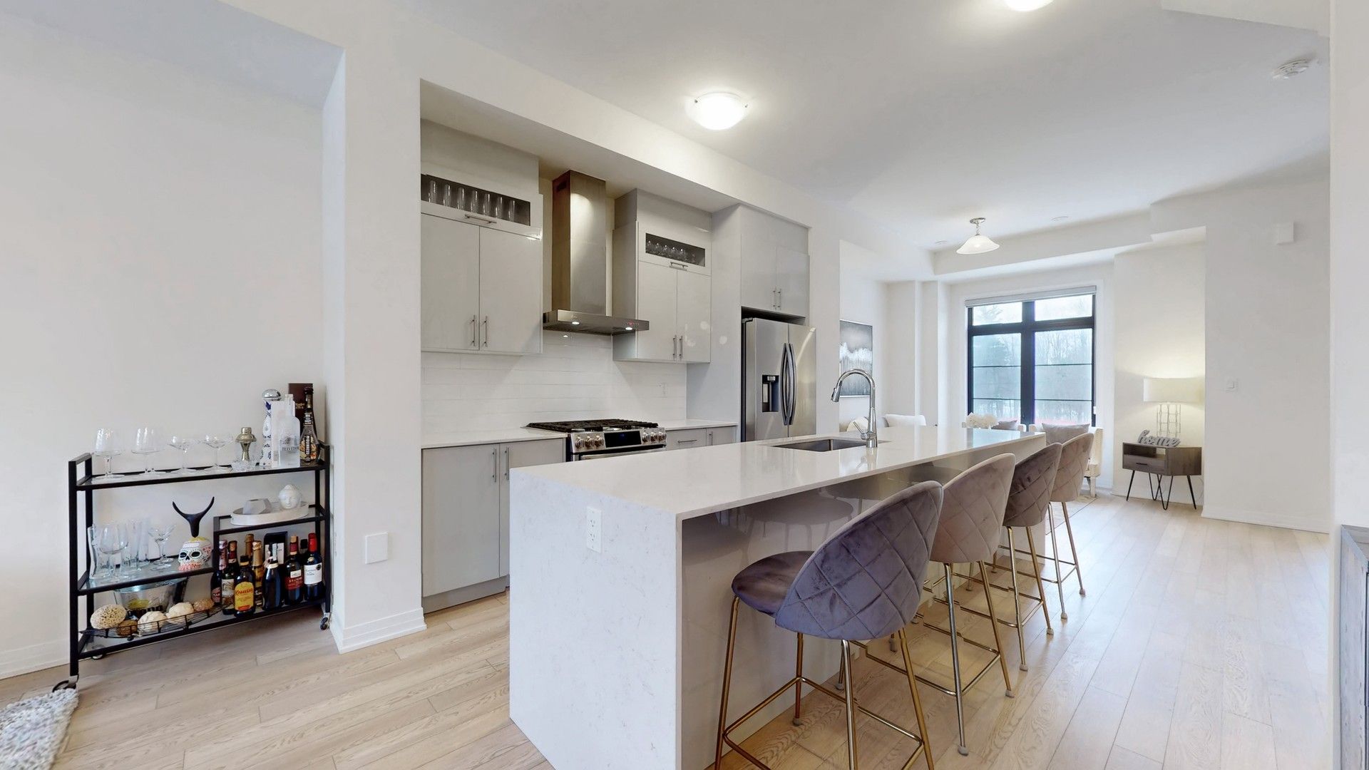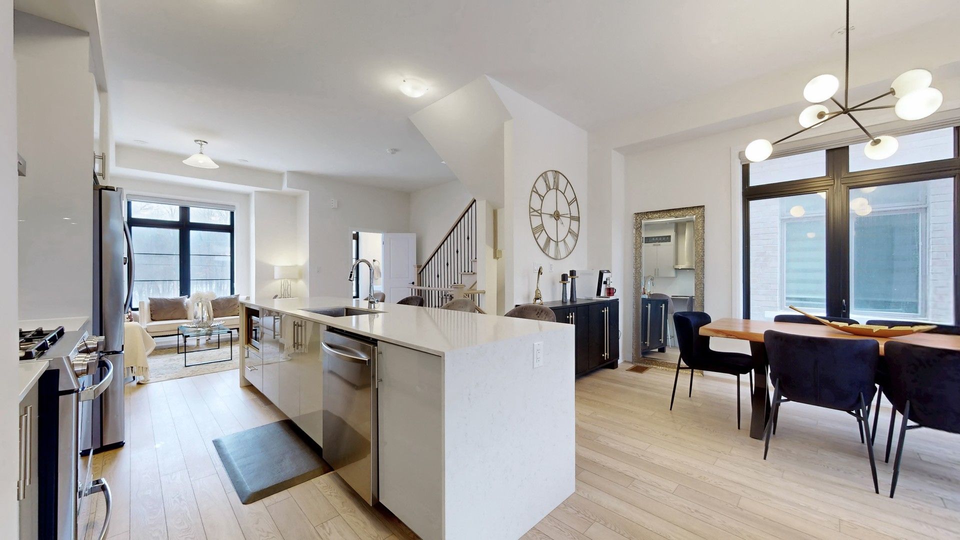 • Chef-inspired kitchen with stainless steel appliances and a generous center island.