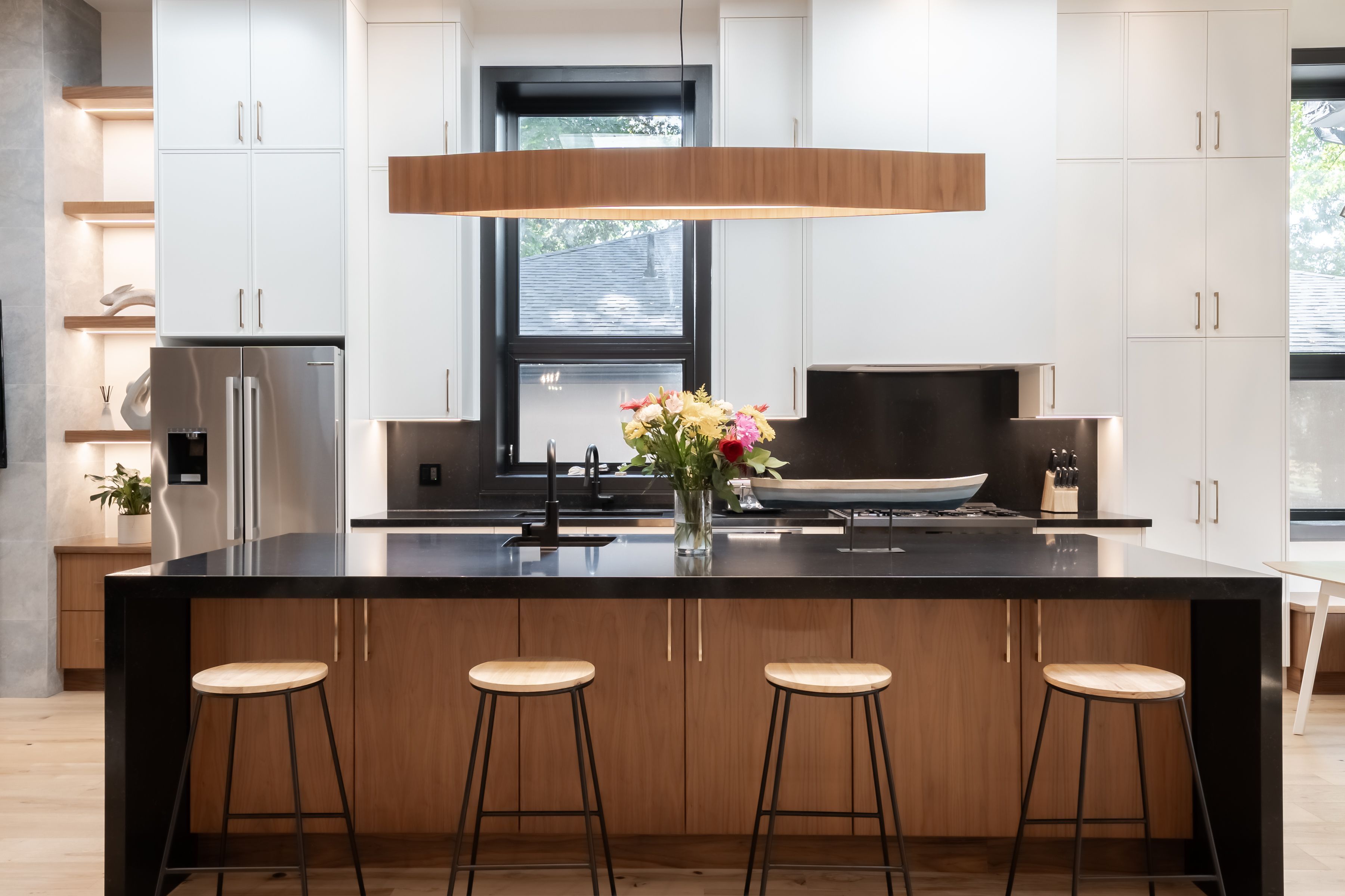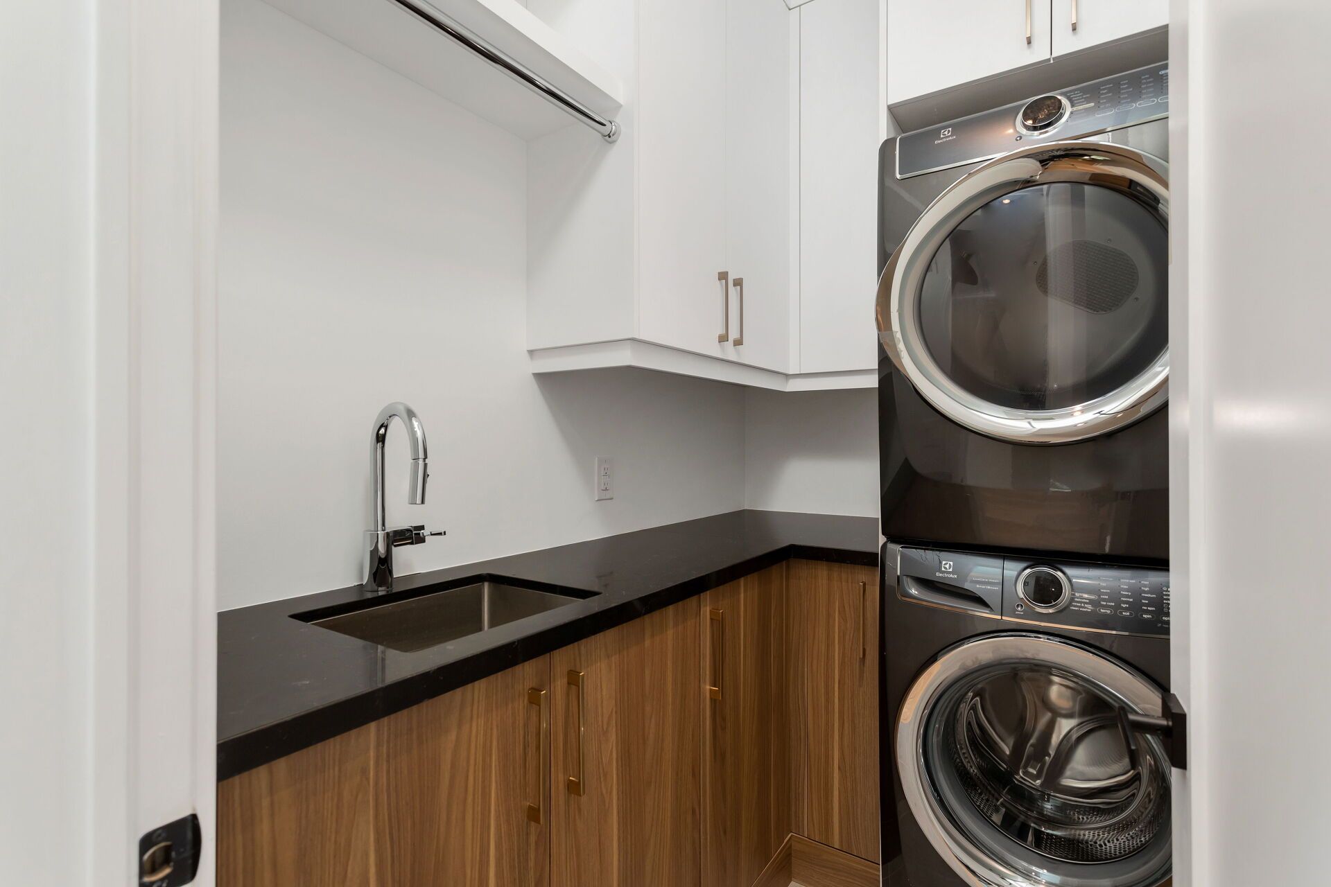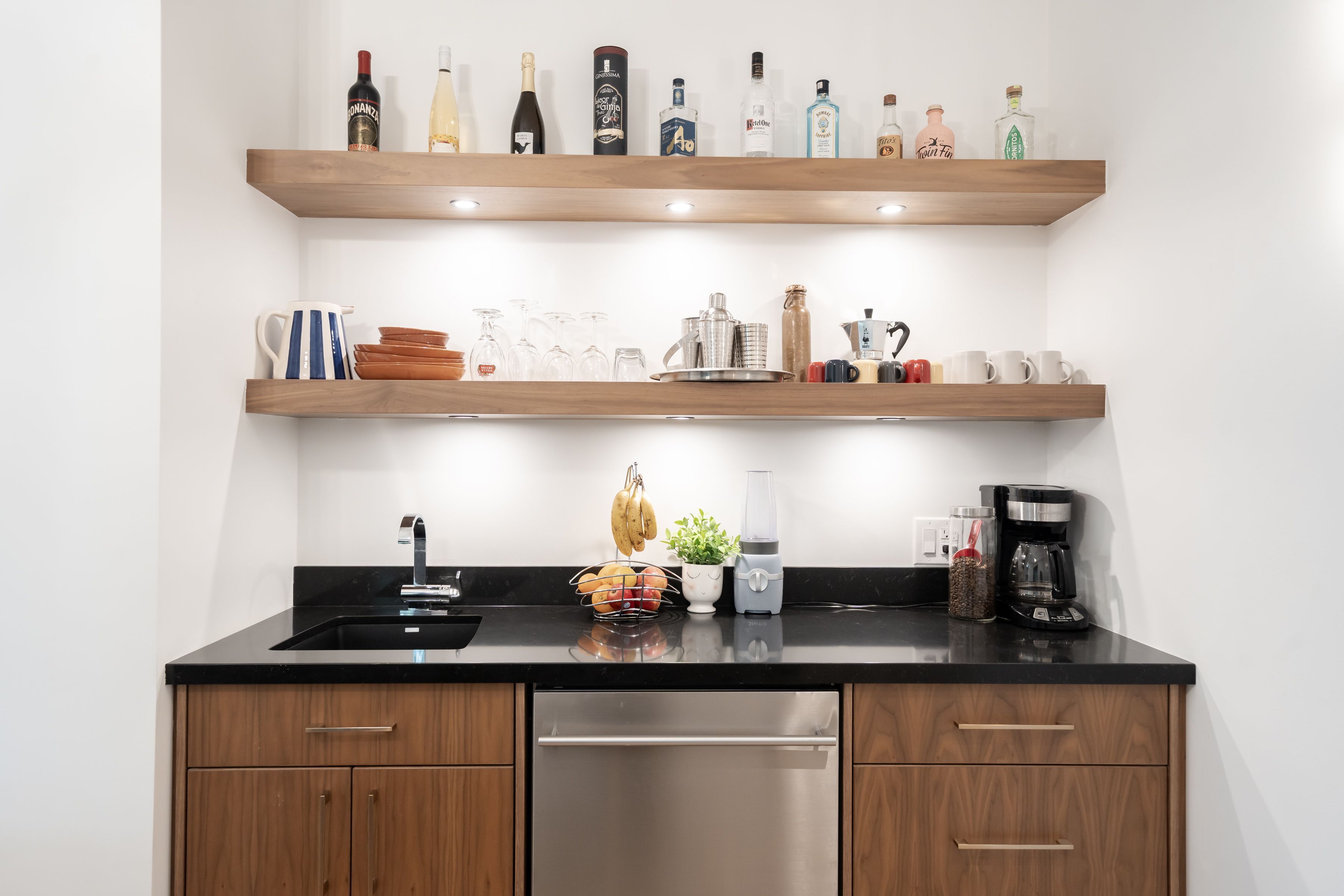 • Chef's kitchen with high-end appliances, prep sink, and wine fridge.