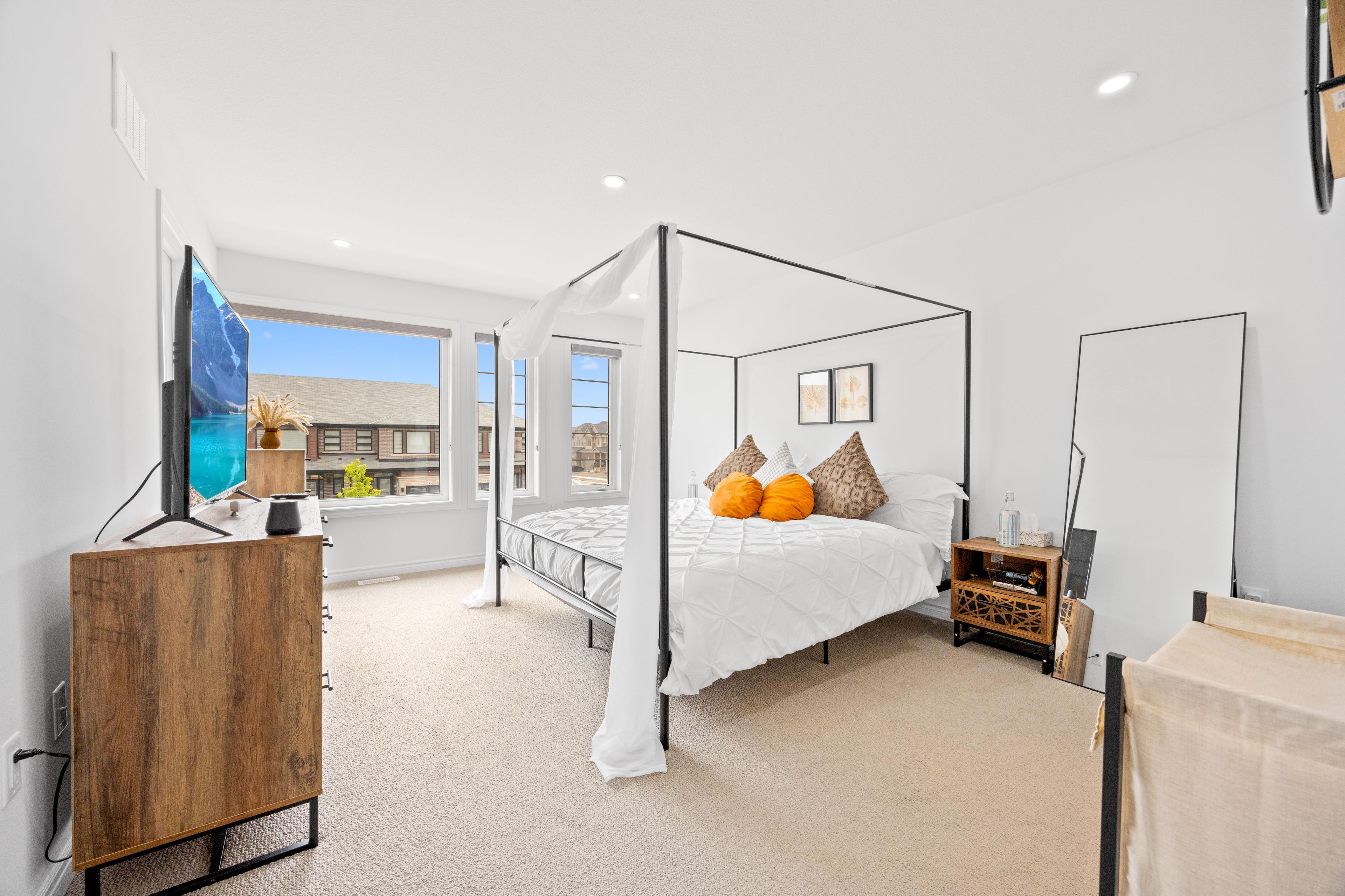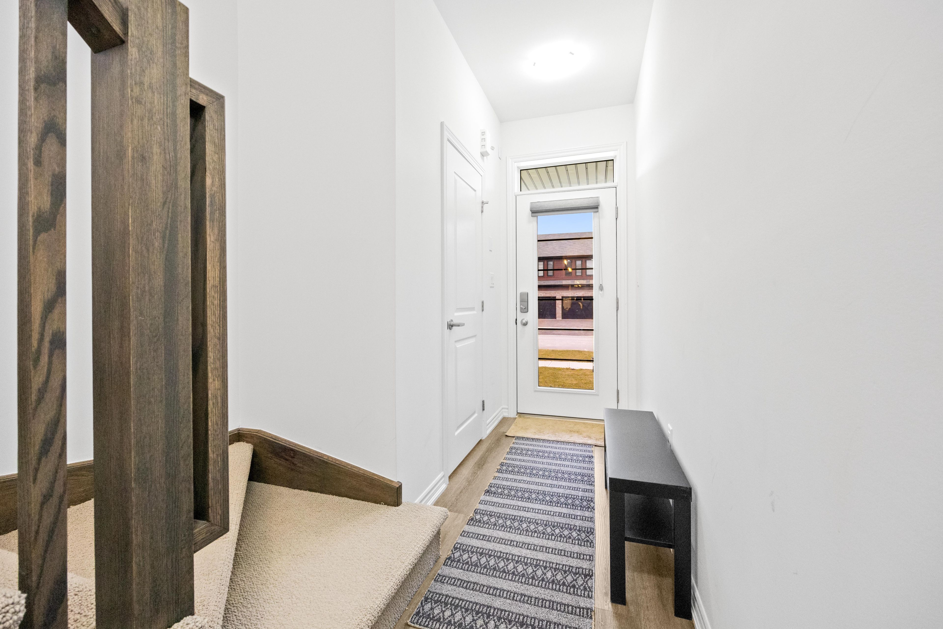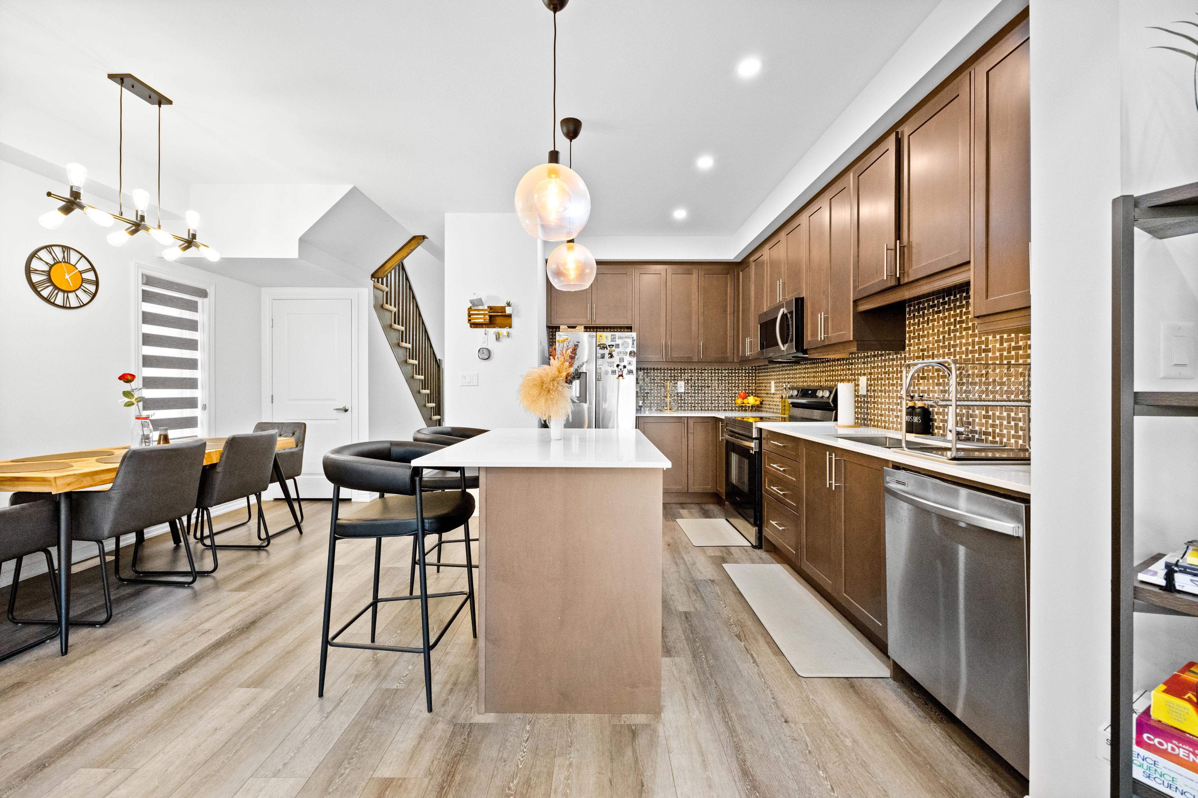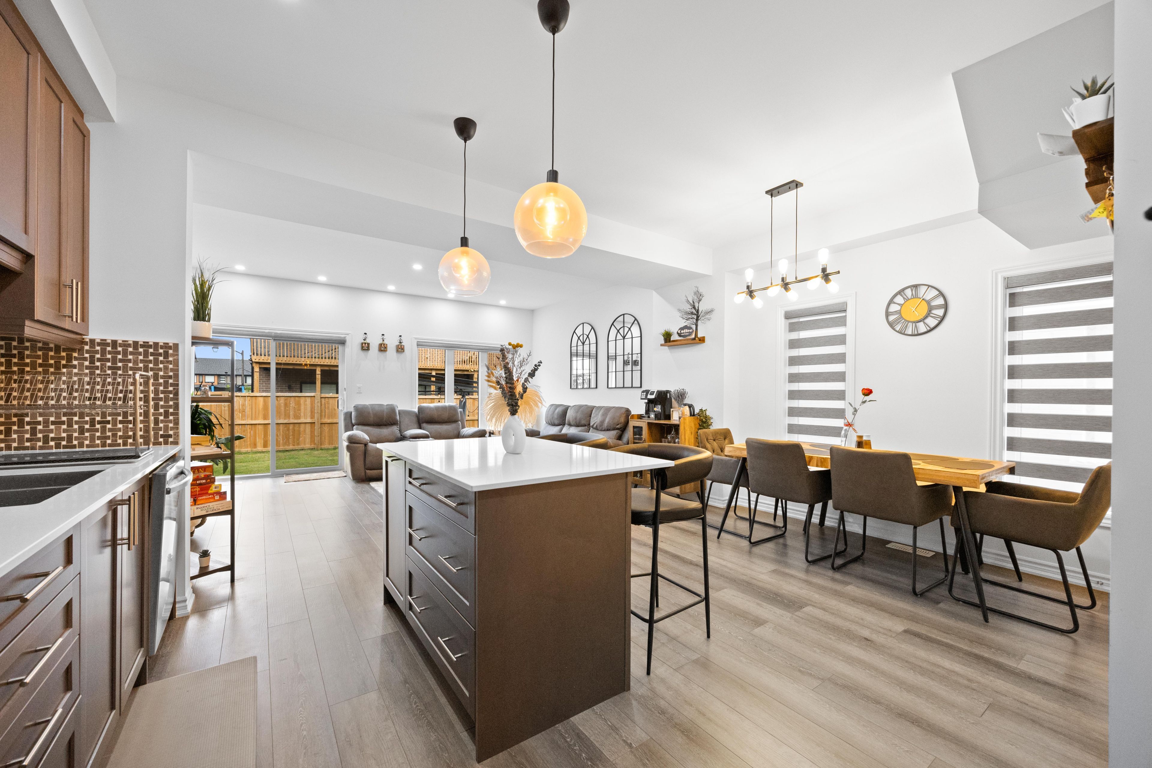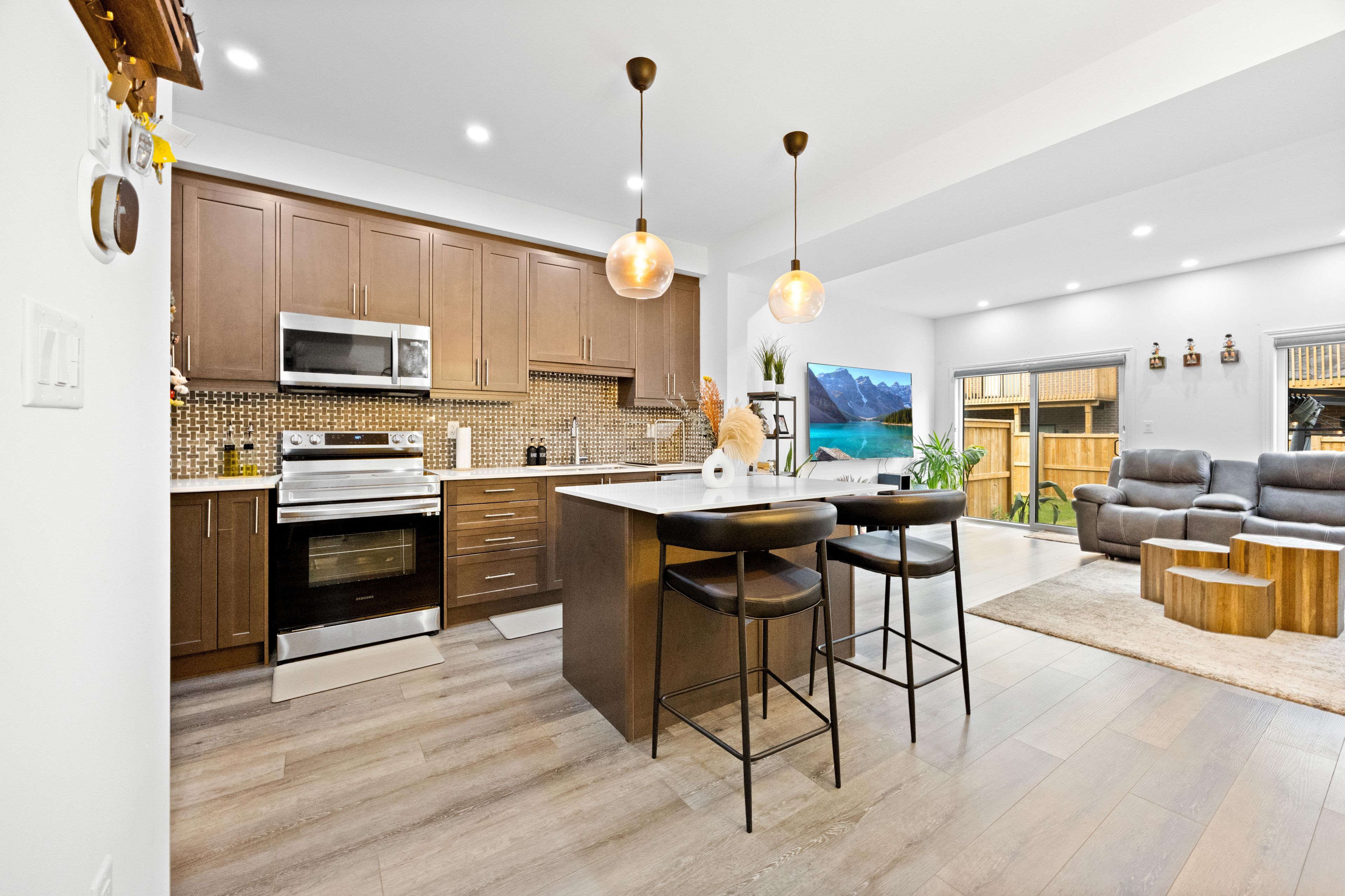 -main awesome end-unit freehold townhouse (feels like semi detached), move in ready! Corner enhanced end unit 1709 sq feet 2 storey freehold townhouse just like semi, in sought area of brant west! 3 bedrooms, 2. 5baths. Bright/spacious have larger windows for natural light floor 9ft ceiling, gorgeous kitchen with bigger living & dining area, quartz counter, deep sinks. Must-see, 3 years old, located in west brantford community features a modern open-concept design with 9-foot smooth ceilings and laminate flooring throughout the main floor. The upgraded kitchen boasts quartz countertops, a stylish undermount sink, extended-height upper cabinets, a kitchen island, and a microwave space saver provision, along with brand-new stainless steel appliances, including a fridge, stove, and dishwasher. Beautiful entry leads to a large foyer, opening into a bright living room with a walkout to the backyard, filled with natural light from oversized windows, making it perfect for family gatherings or entertaining friends. The main floor also includes pot lights to enhance the space with warm, modern lighting. Upstairs, the primary bedroom offers a walk-in closet and a luxurious ensuite full washroom, while the second bedroom also includes a walk-in closet. A convenient second-floor laundry room comes equipped with a brand-new white front-loading washer and dryer. Located in a family-friendly neighborhood, this home is just minutes from top-rated schools, a community center, shopping, scenic trails, and major highways, with visitor parking and a kids' park conveniently situated in front of the house. Don't miss this incredible opportunity schedule a showing today! Furnace, a/c and tankless hot water owned.