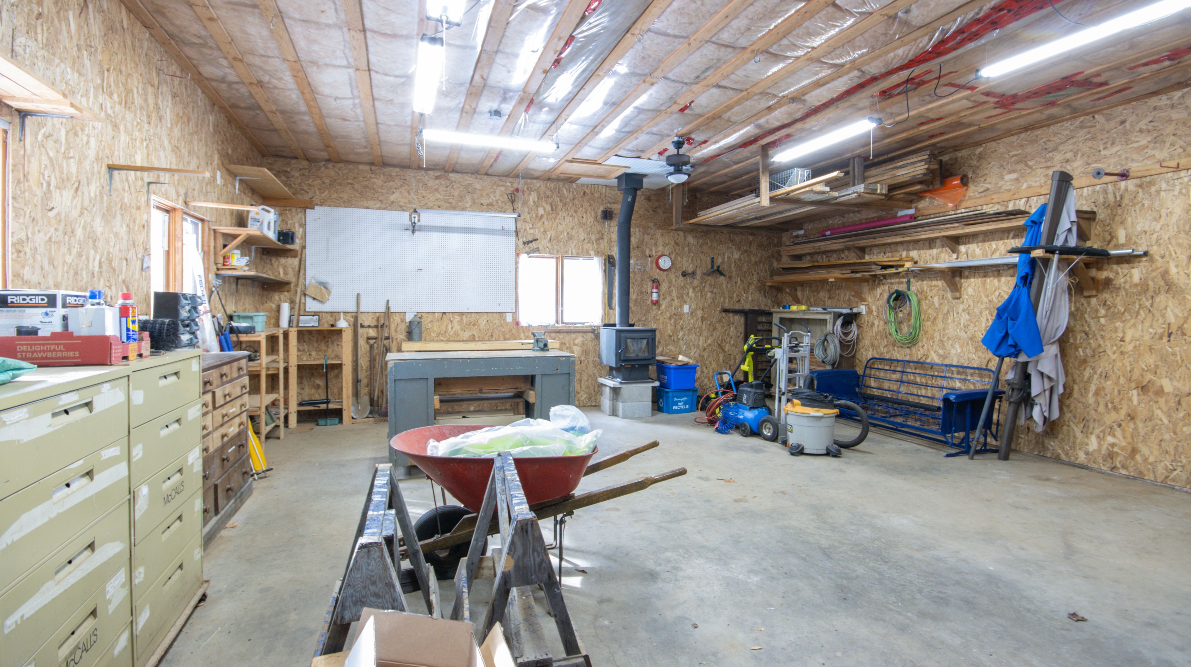 • Insulated garage/workshop with woodstove heat for year-round use.
