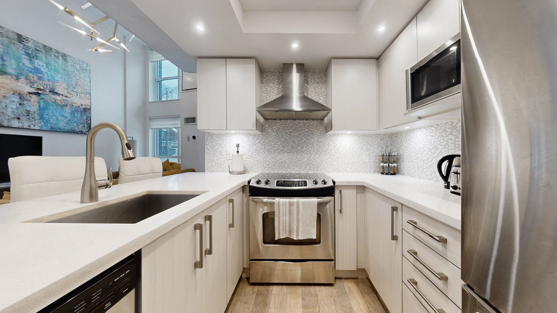 • Amenities include gym, theater room, and rooftop BBQ area.