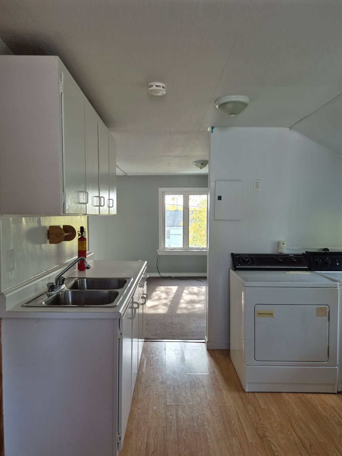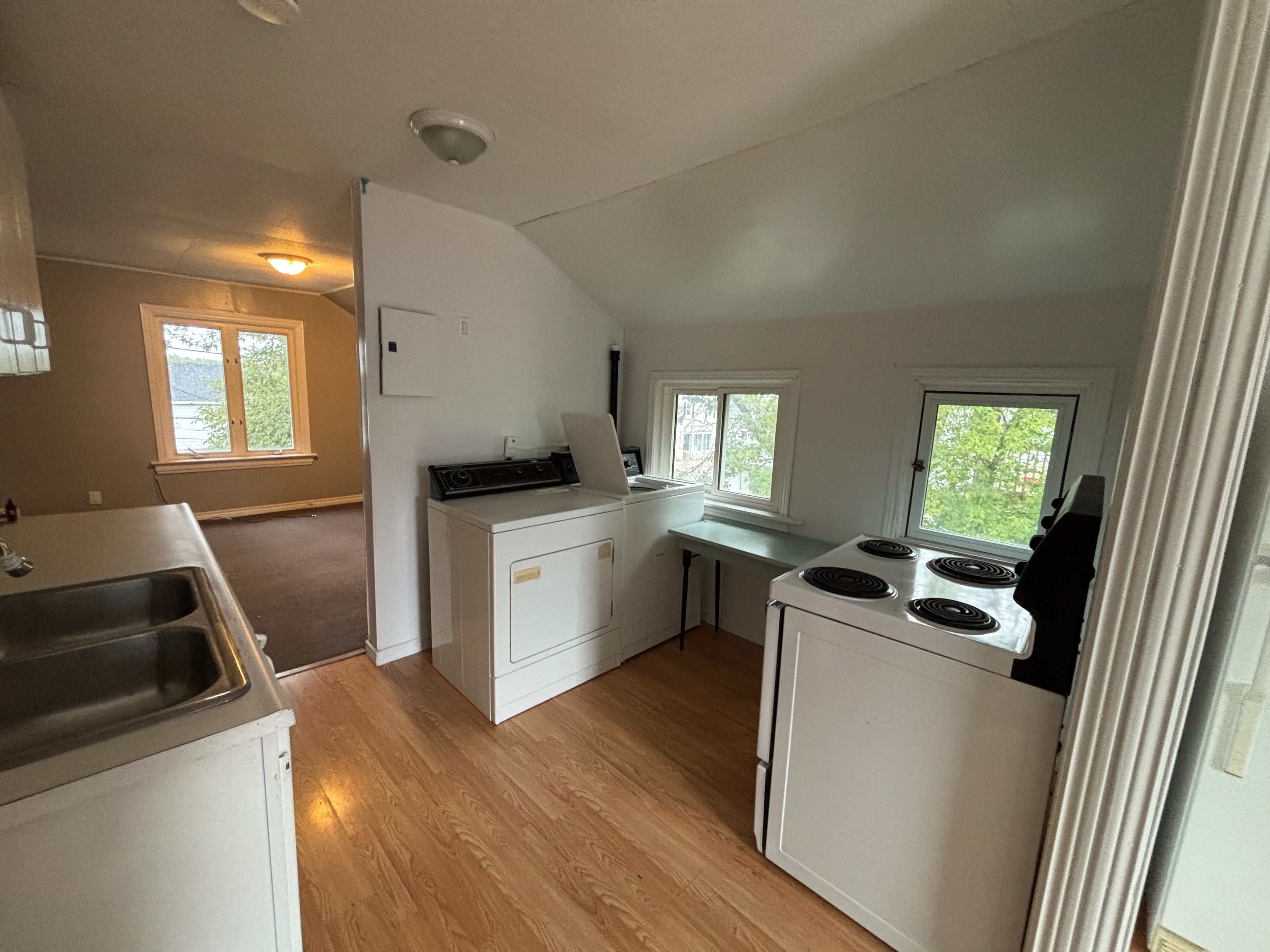 • Main floor features 2 bedrooms, kitchen, and living/dining area.