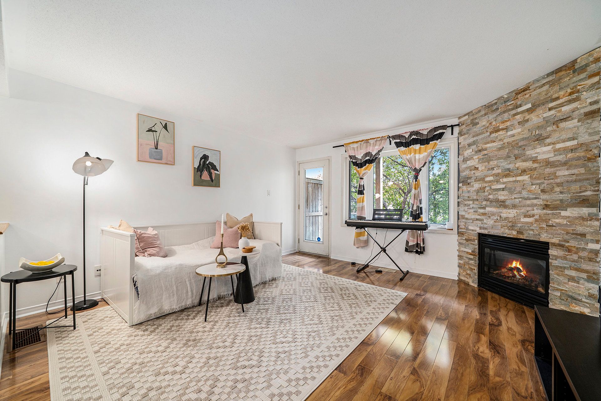 Incredibly maintained lower two-storey, 2-bedroom, 2-bath condo is located in the heart of the city, just minutes from st. Laurent mall, hospitals, la cité collegiale, and more. The main level offers an inviting open-concept layout with updated cabinetry and modern flooring. A beautifully accented stone fireplace serves as the focal point, adding warmth and character to the living space. For added convenience, the unit features a main-floor powder room. On the lower level, you'll find two spacious bedrooms, a full bathroom, and in-suite laundry.