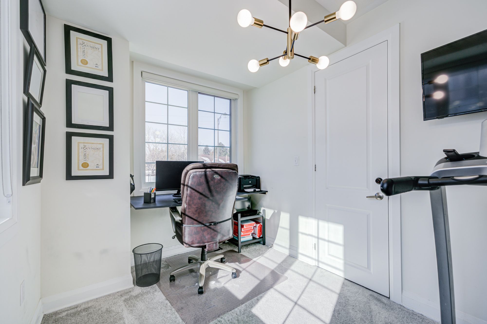 Gorgeous freehold modern corner-unit townhouse with 3+1 bedrooms in a prime markham location! 1,839 sq ft with a functional layout. 9' ceilings on both the ground and 2nd floors. Smooth ceilings w/ ample pot lights add a modern ambiance. Enclosed office on the ground floor is perfect for a home office or 4th bedroom. $$$numerous luxurious upgrades, wall moulding throughout the home, adds elegance to the entire house. One-year-old carpet in the living room, den, and stairs, installed to protect the hardwood underneath and can be removed if needed. Front door iron inserts and high-strength lower-level window film enhance security and resist break-ins. The gourmet kitchen features upgraded tall cabinets with molding, an additional gas rough-in, stainless steel appliances, and granite countertops w/ a breakfast bar and center island. Spacious primary bedroom with 4pc en-suite and upgraded frameless glass shower. 3rd bedroom with upgraded wall closet. Two south-facing private walk-out balconies ideal for relaxation or entertaining. Convenient 3rd floor laundry room. Just a 5-minute drive to highway 404, restaurants, grocery stores, costco, shops, parks, and top-rated schools like nokidaa public school (sir john a macdonald public school) and richmond green secondary.