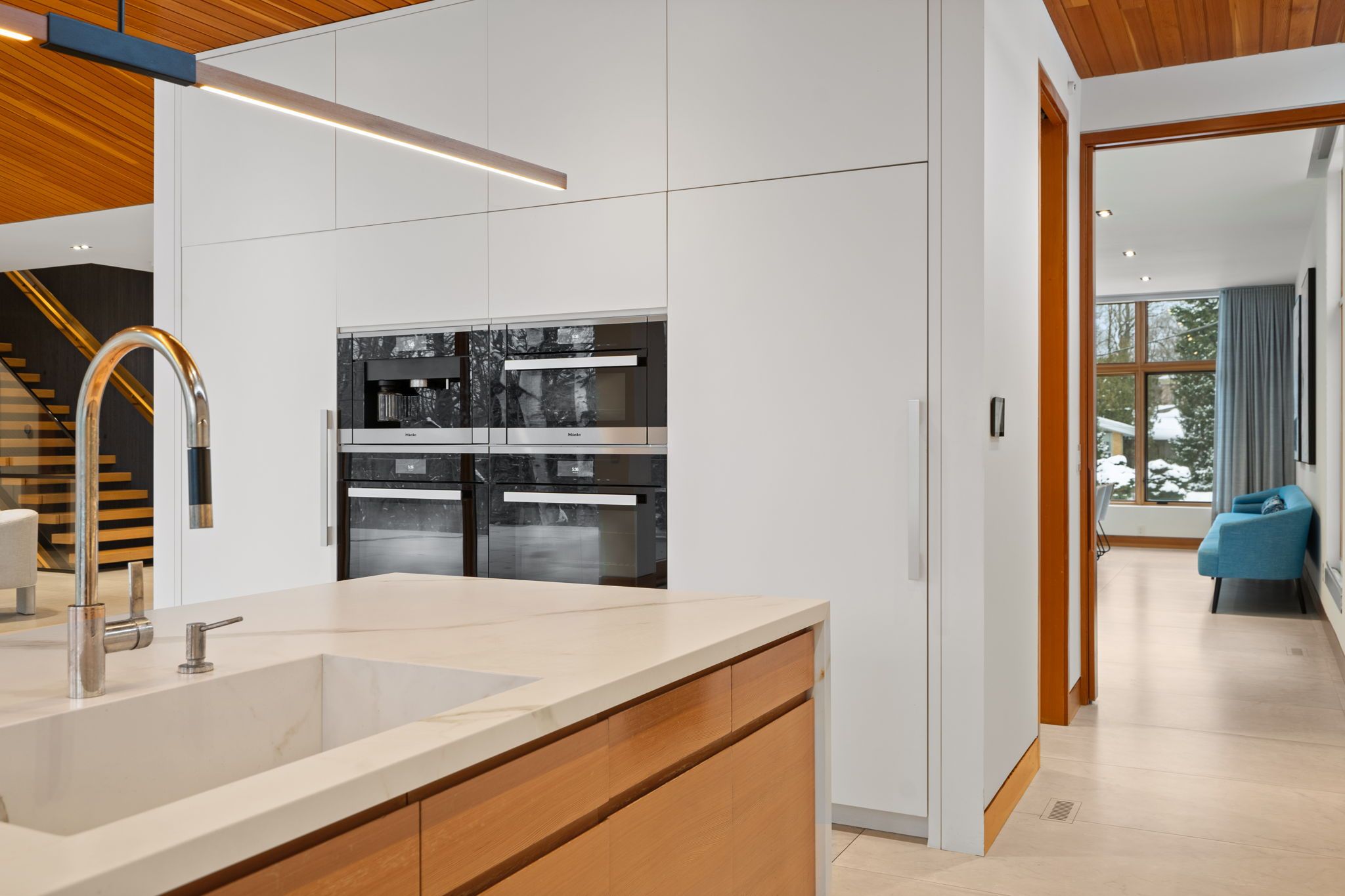 West coast inspired - architecturally significant custom residence. Designer palette and nestled at cul-de-sacs end. In perfect harmony of sleek design and timeless modern elegance. Picturesque natural treed setting overlooking private ravine views. This home boasts an open-concept floor plan, soaring ceilings, floor-to-ceiling windows and cascading natural light. Designed for both luxury, functionality & family entertainment being amenity rich with an exciting interior slide from main floor to lower level (not just for kids). The main living area is an entertainers dream, featuring a sophisticated living room with a sleek wood-burning fireplace and a chefs kitchen outfitted with top-of-the-line appliances, refined finishes and eating area. The spacious dining area is equally impressive, providing the perfect setting for hosting. The primary suite is a serene retreat, offering floor-to-ceiling windows, a walkout to the deck, a spa-like ensuite, and a large walk-in closet. Additional bedrooms are generously sized, each featuring walk-in closets and beautifully designed private ensuites washrooms. The expansive lower level provides exceptional versatility, complete with a large recreation room that opens to the backyard and overlooks a scenic ravine, making it an ideal space for both relaxation and entertaining. Step outside to discover a serene backyard oasis, backing onto a lush ravine that offers both privacy and breathtaking natural views. This home seamlessly blends indoor and outdoor living. This rare modern retreat is situated within exclusive neighbourhood with convenient access to top-tier amenities, renowned park, public and private schools, shops and dining.