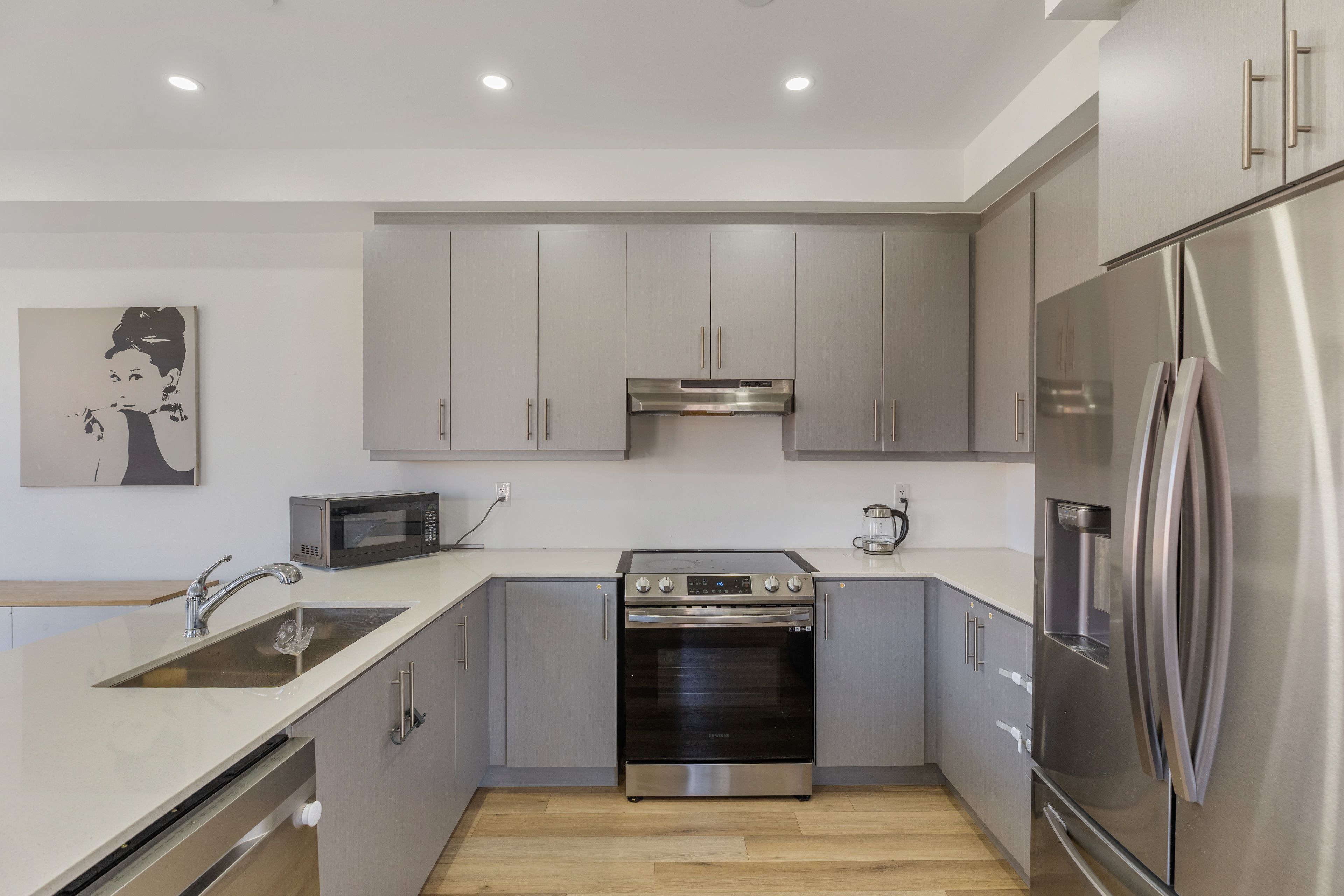 • Chef's kitchen with quartz countertops and high-end appliances.
