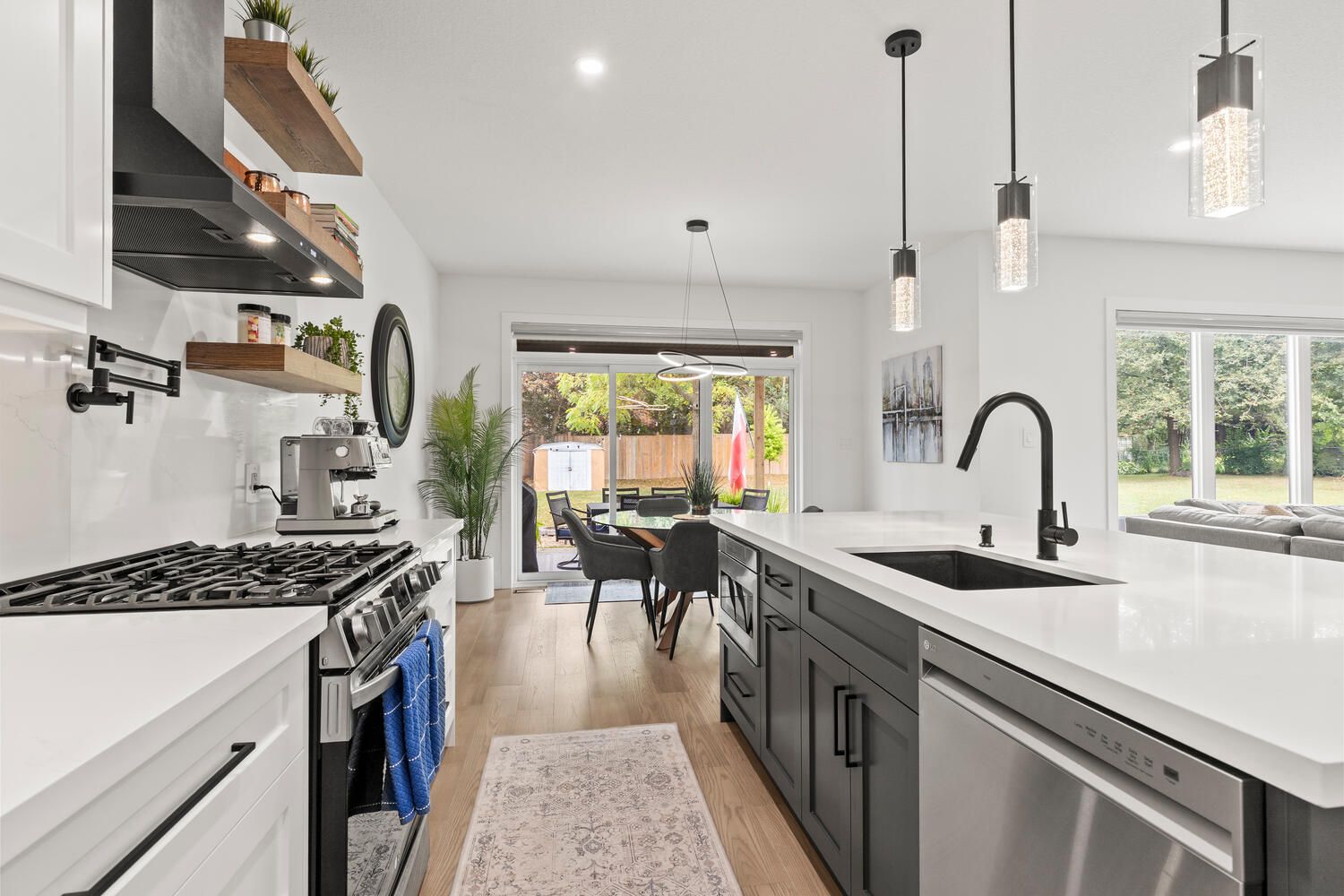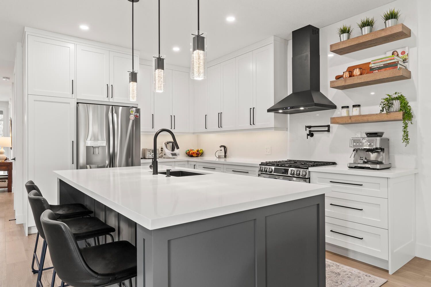 • Custom-designed kitchen with premium cabinetry and gas stove for culinary enthusiasts.