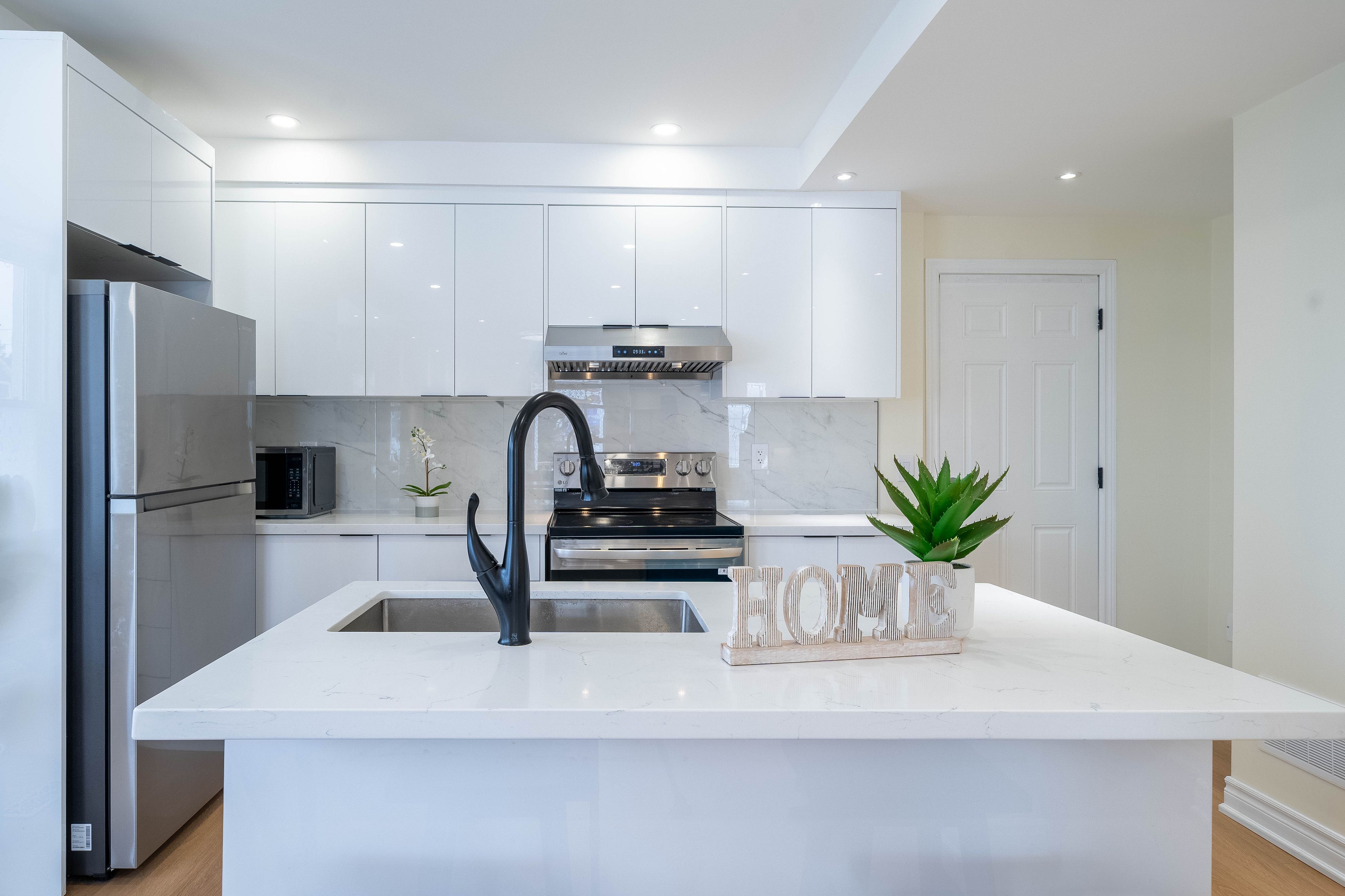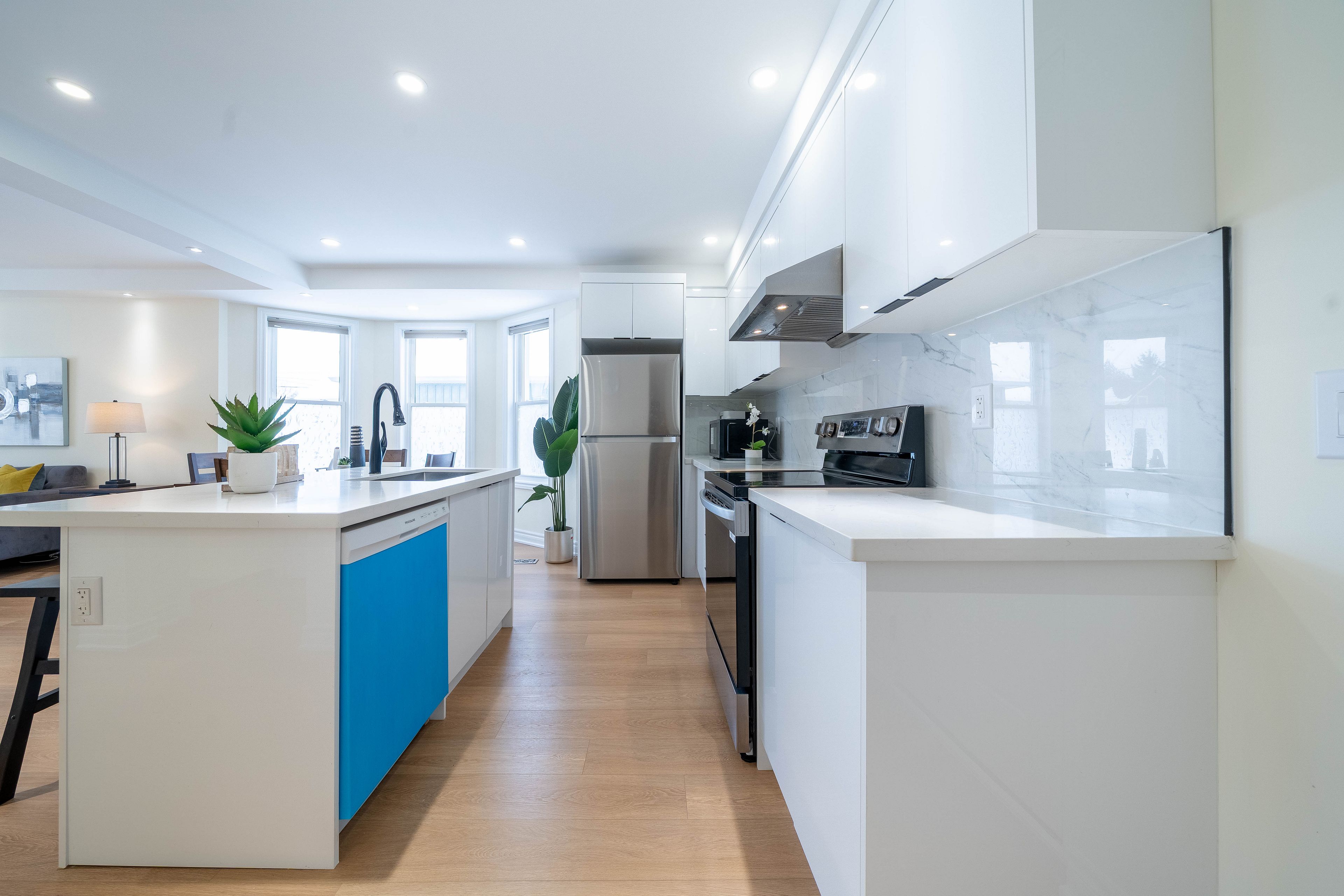 • Modern kitchen with custom cabinetry and quartz countertops.