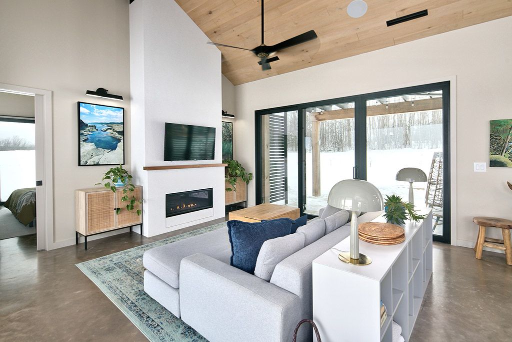 • Open-concept living area with vaulted ceilings and beautiful nature views.