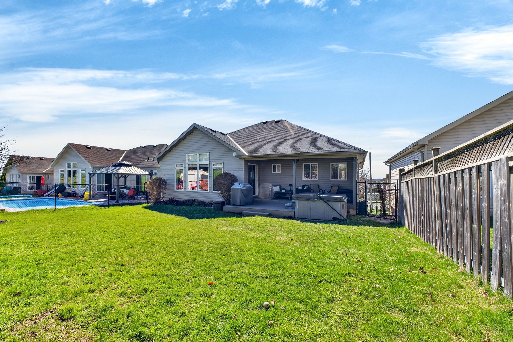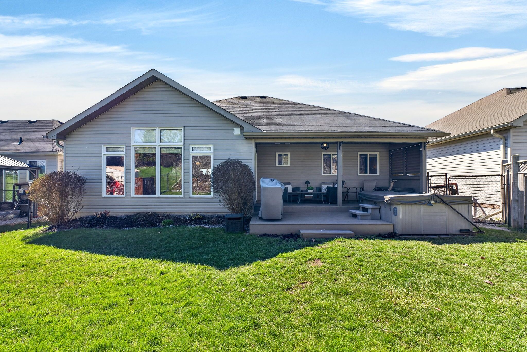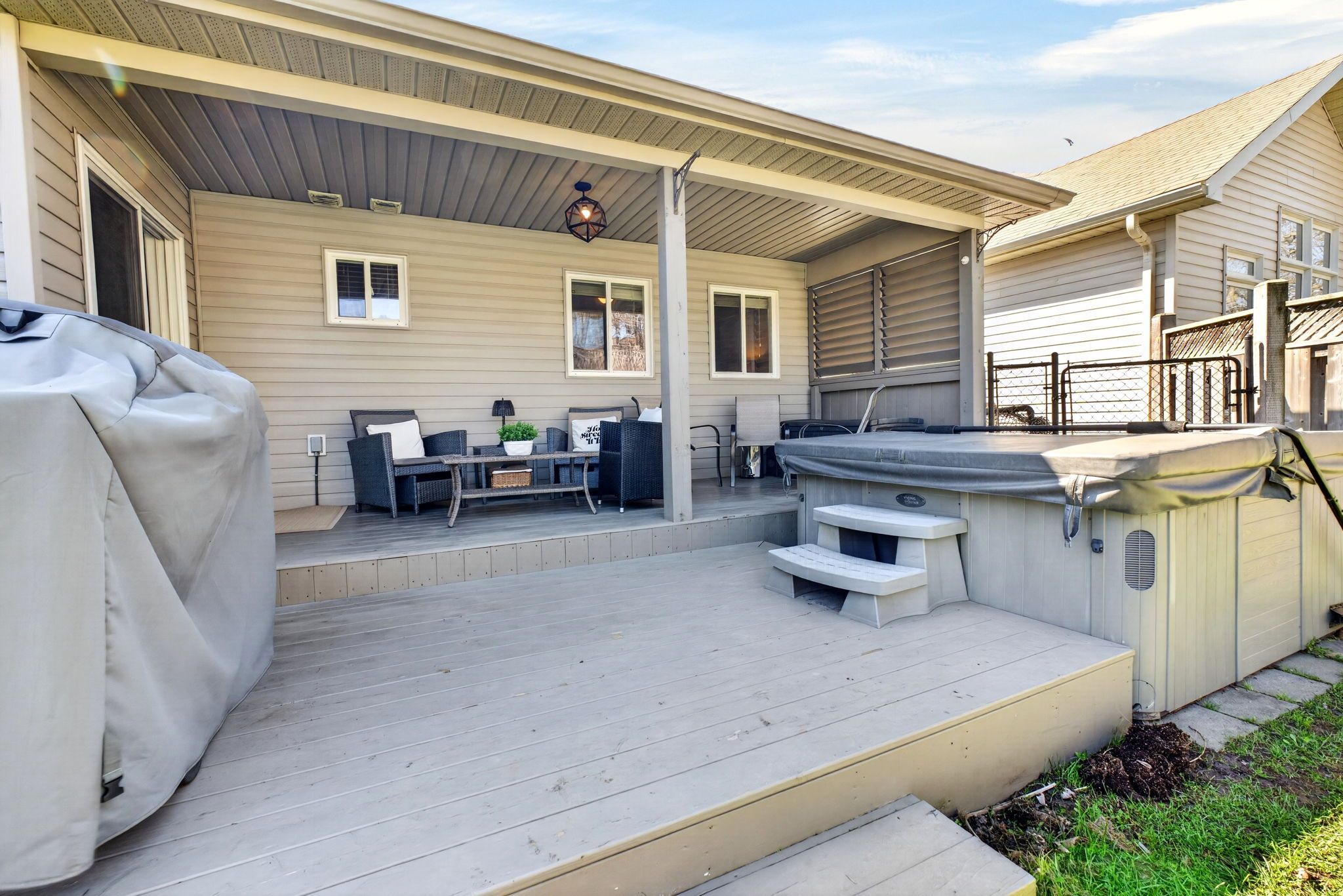 • Private backyard oasis with a large deck and maintained hot tub.