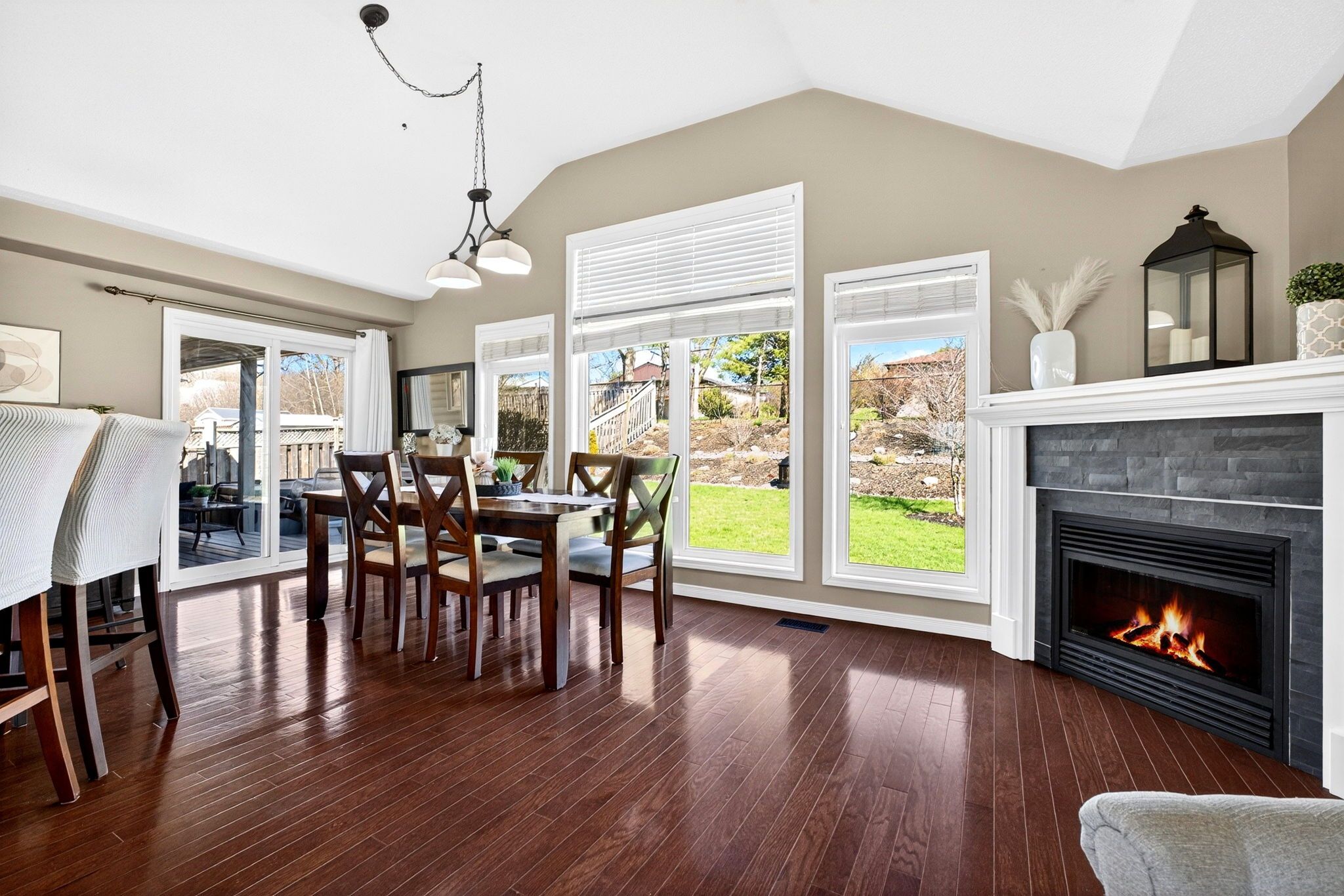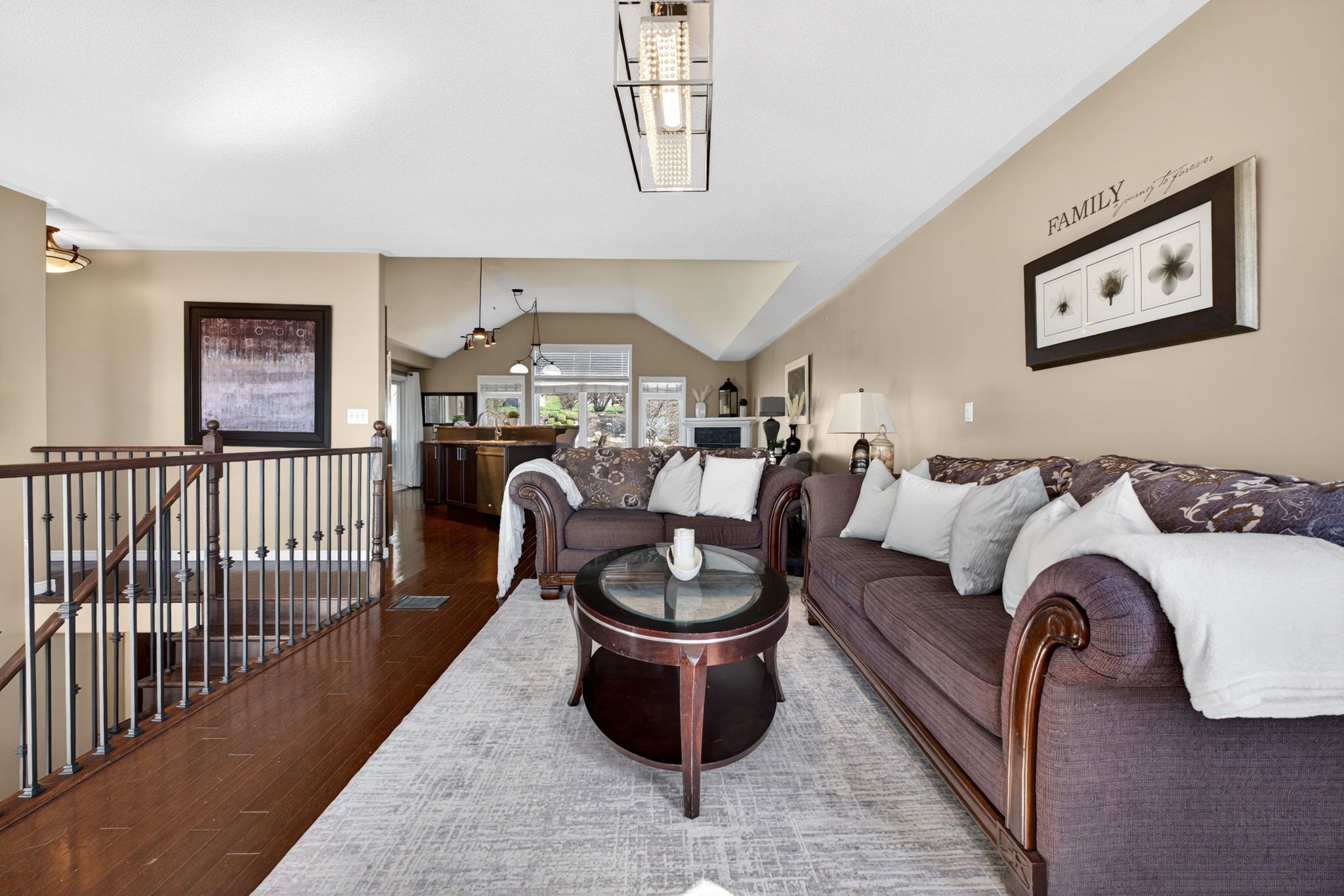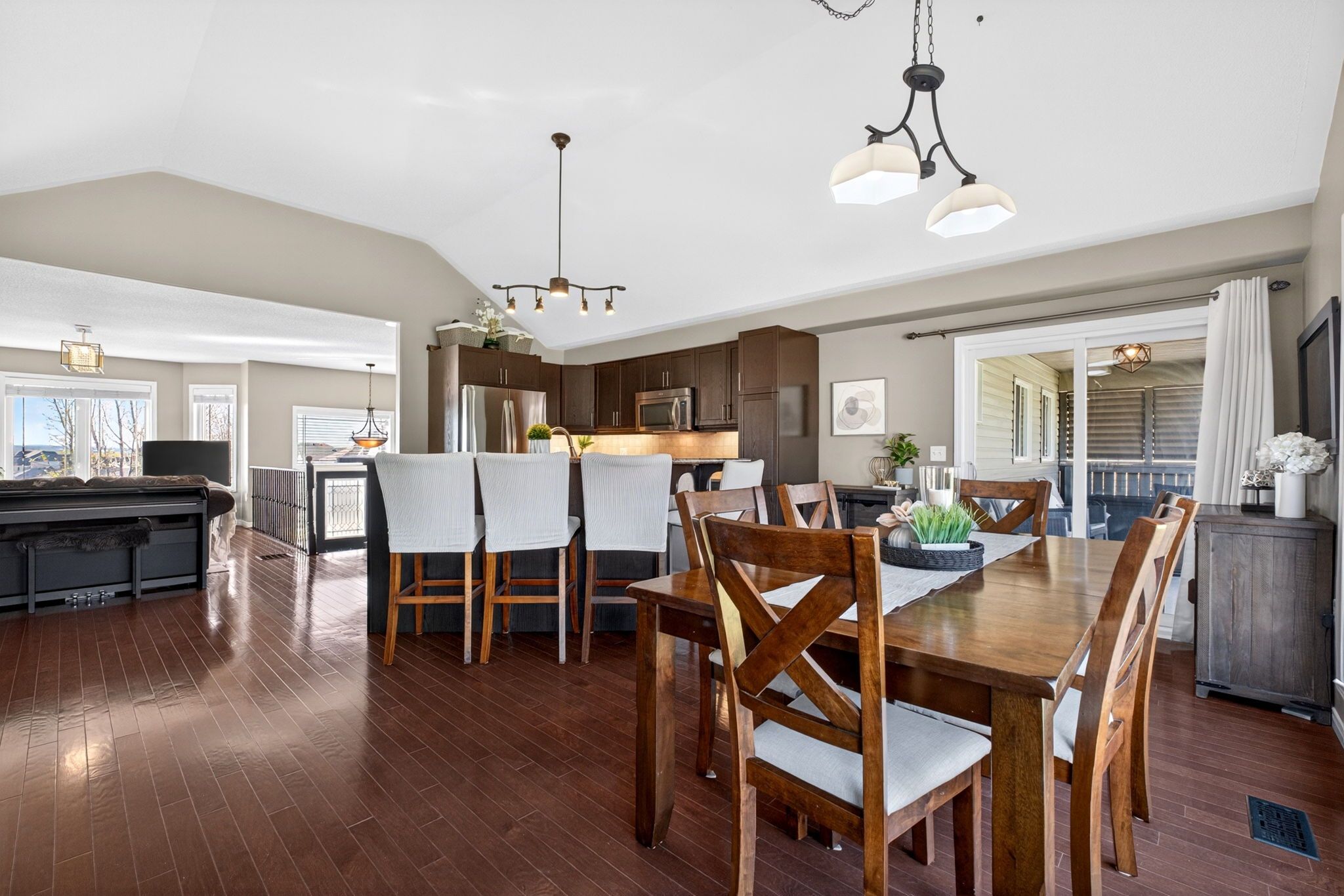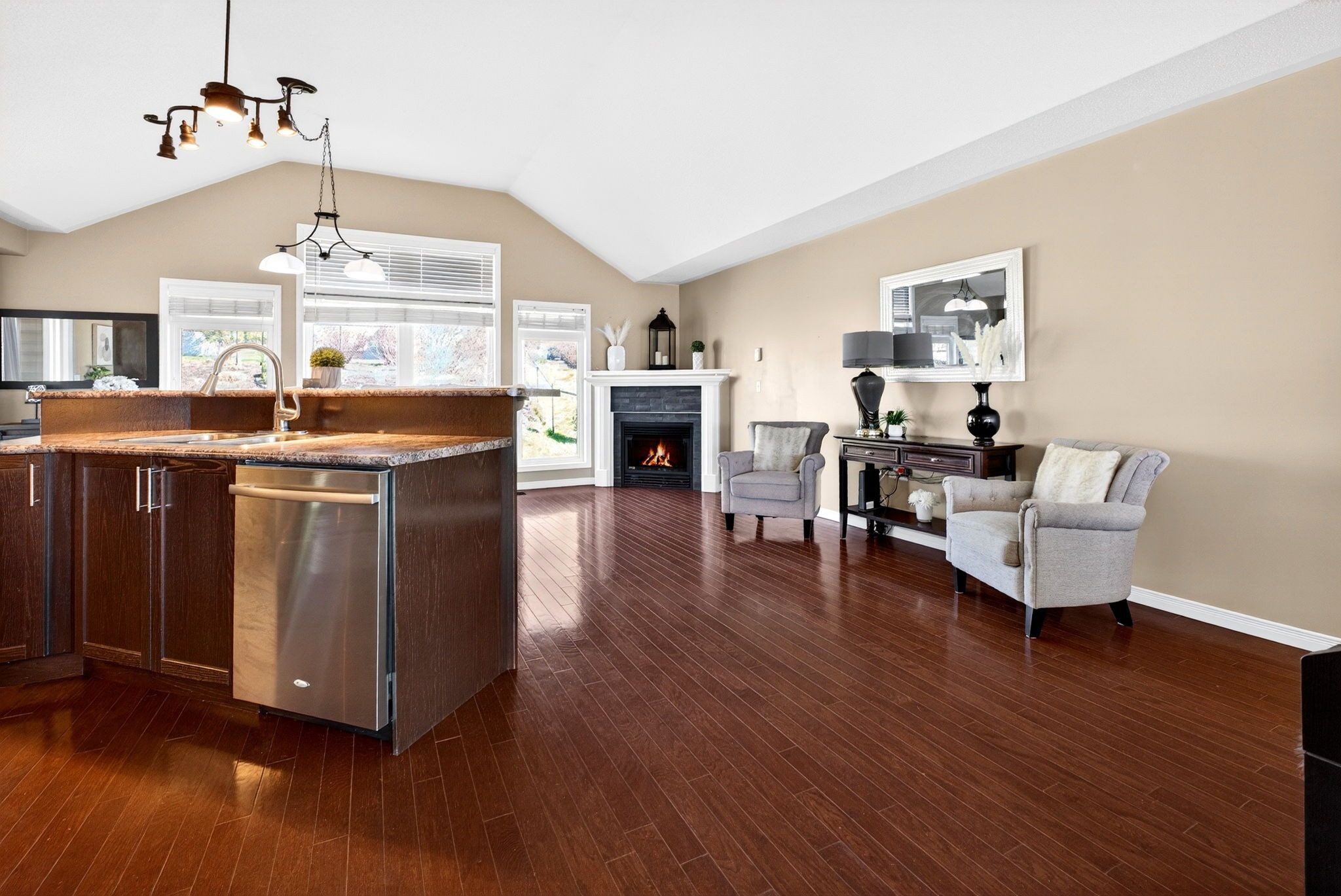 • Bright open-concept main floor with vaulted ceilings and hardwood flooring.
