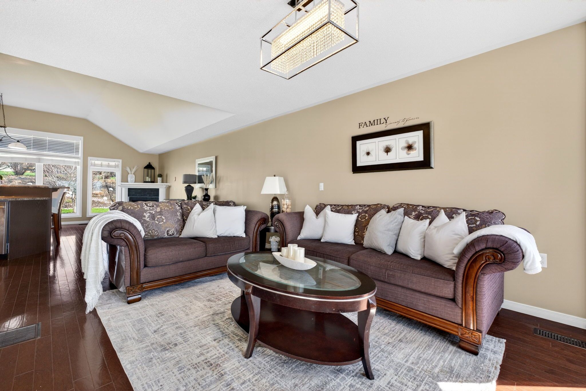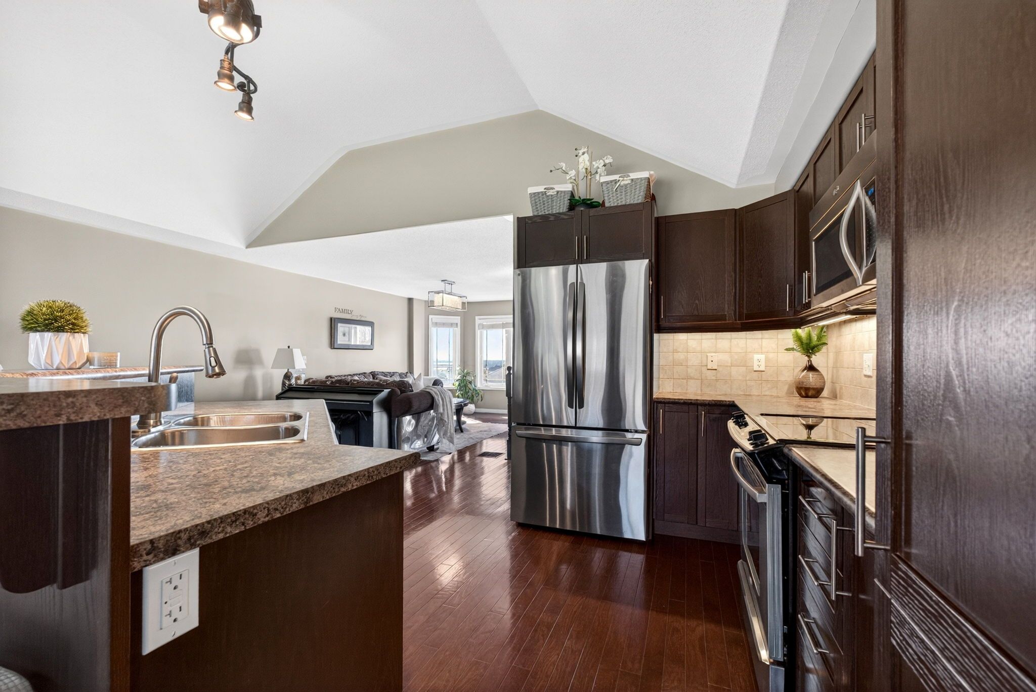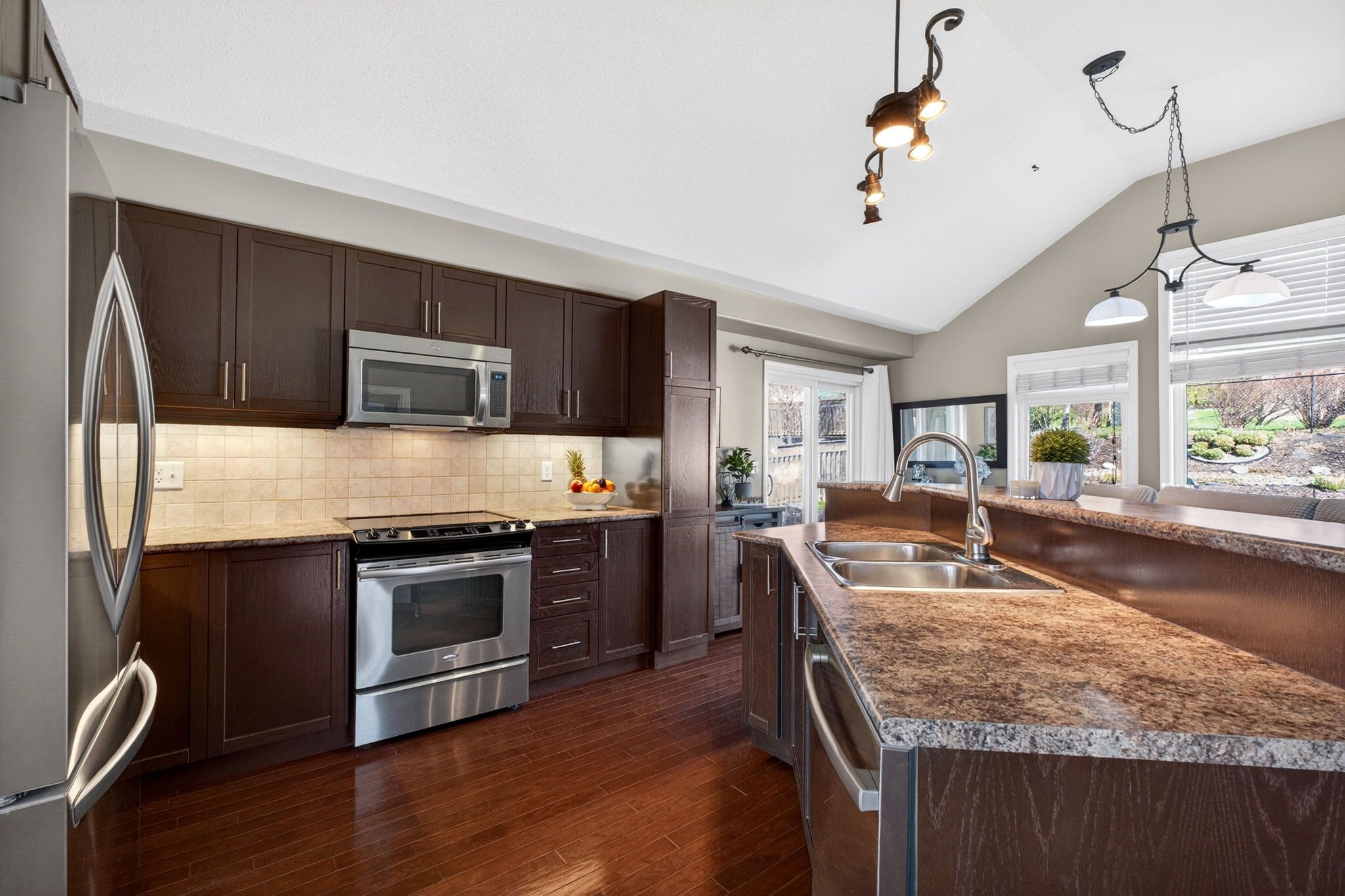 • Bright open-concept main floor with vaulted ceilings and hardwood flooring.