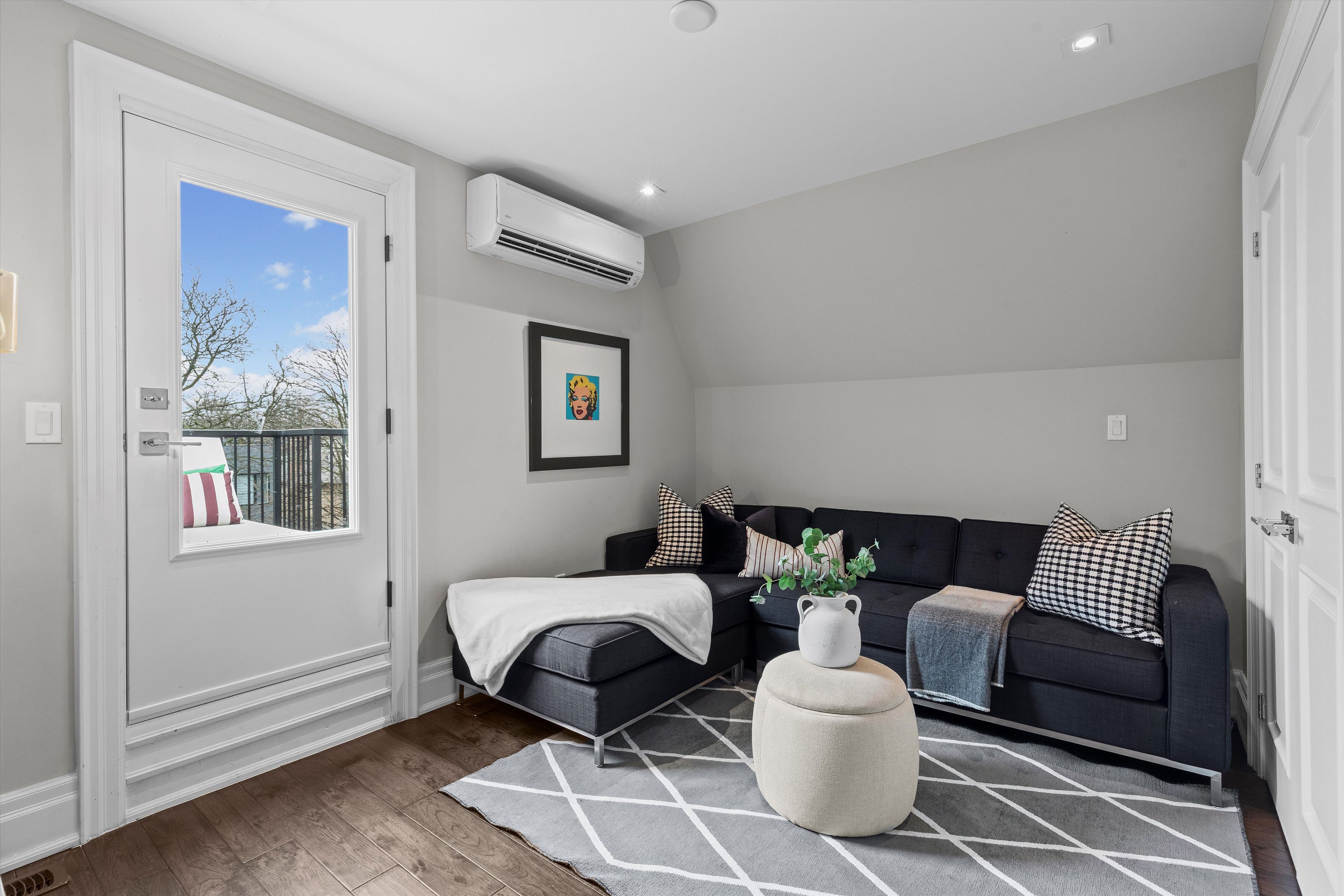 • Bright living area with hardwood floors and a large bay window for natural light.