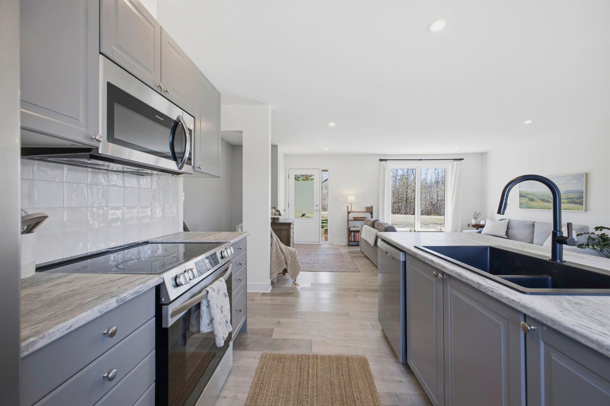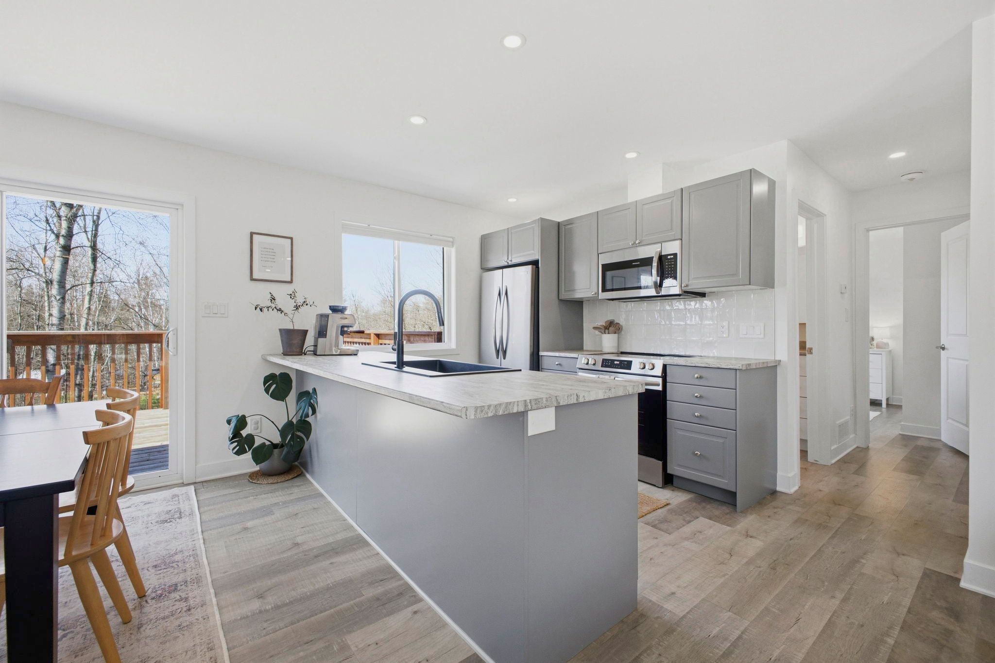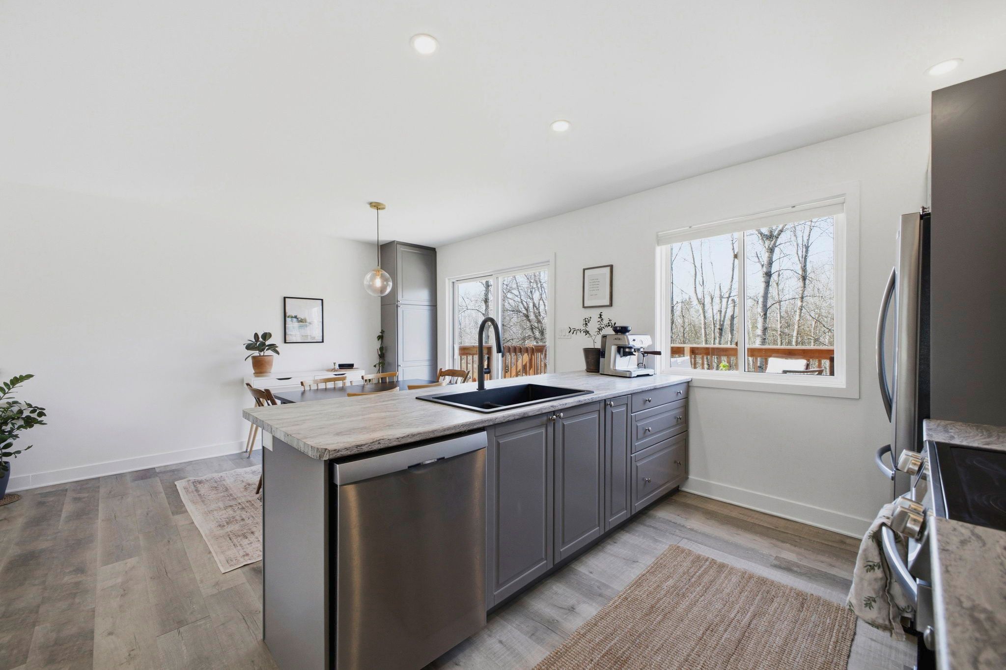 • Stylish kitchen with grey cabinetry, large island, and stainless steel appliances.