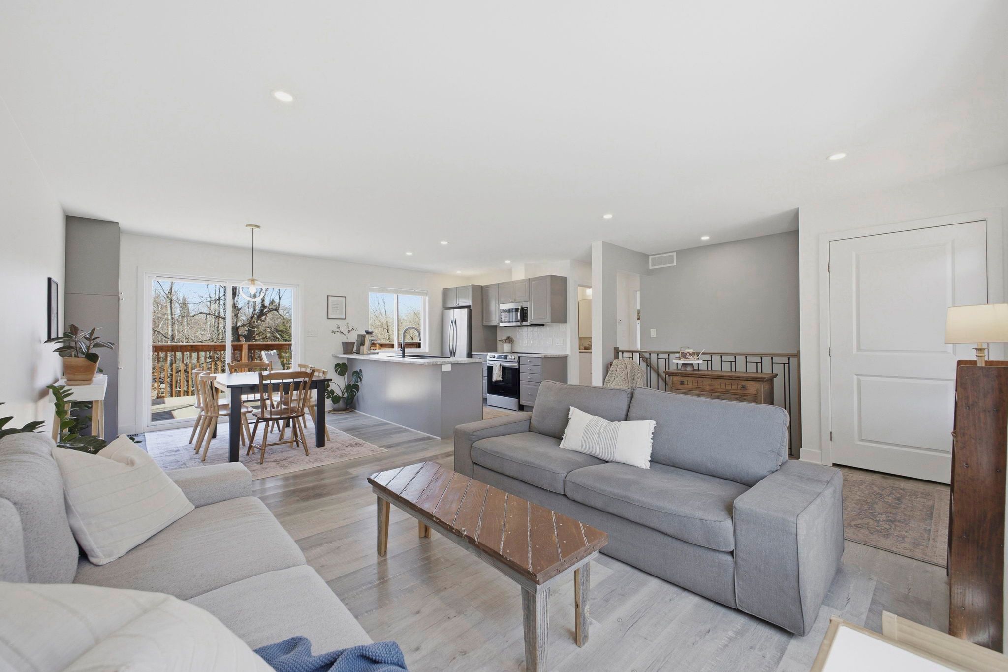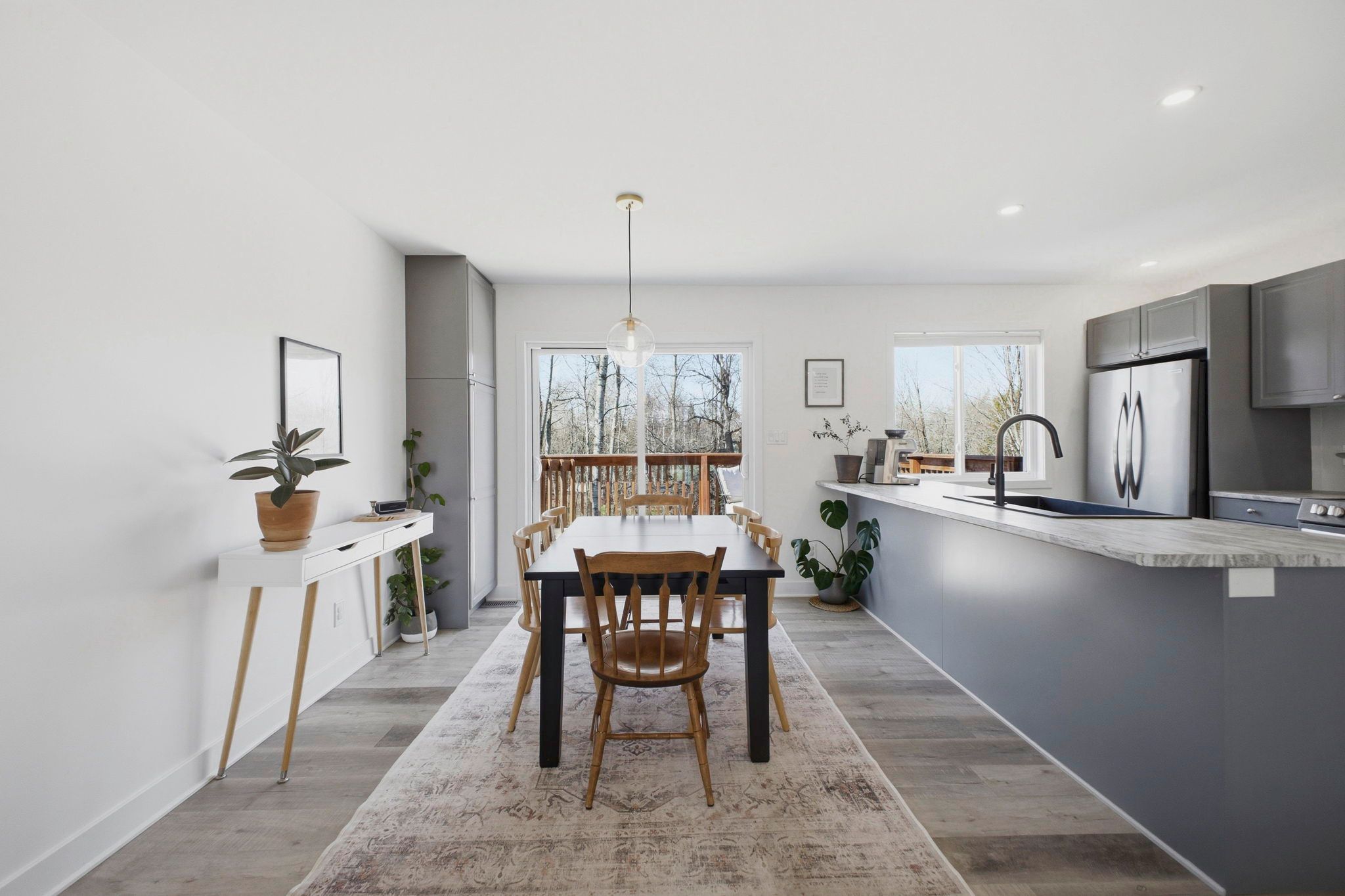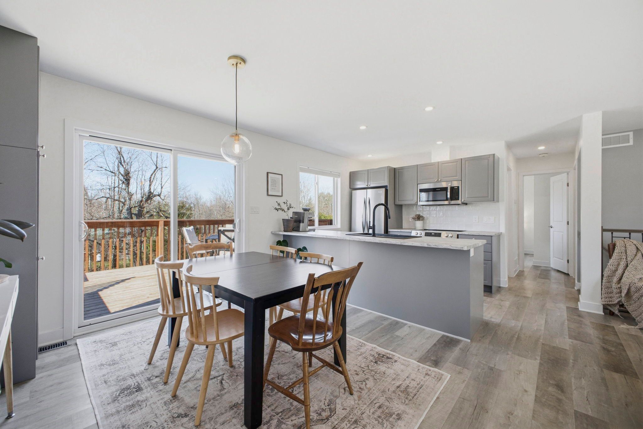 • Stylish kitchen with grey cabinetry, large island, and stainless steel appliances.