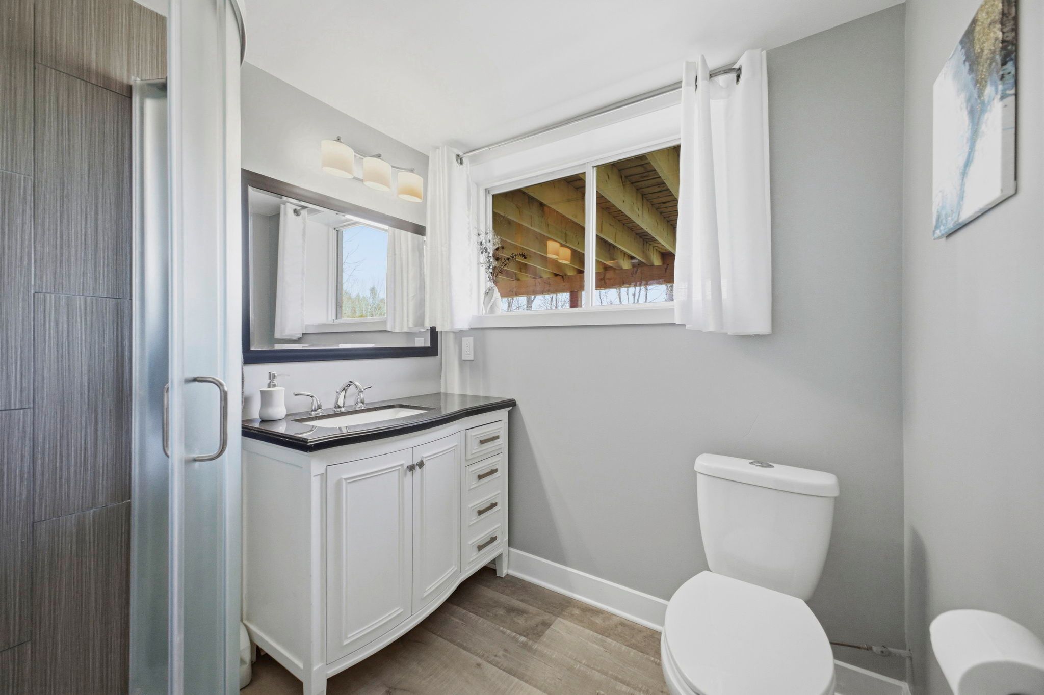 • Bright interior with large windows and inviting open living space.