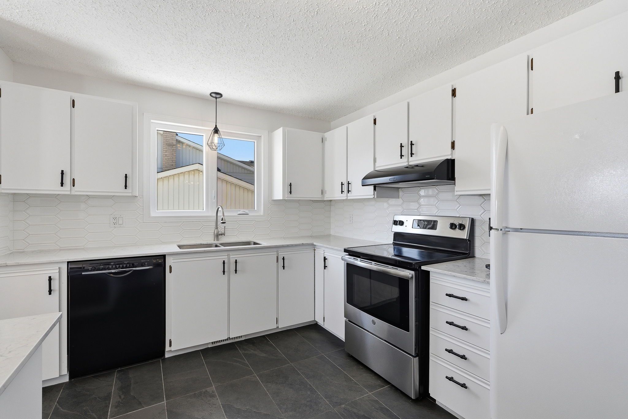• Bright white kitchen with spacious layout and ample countertops.