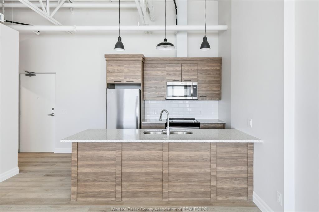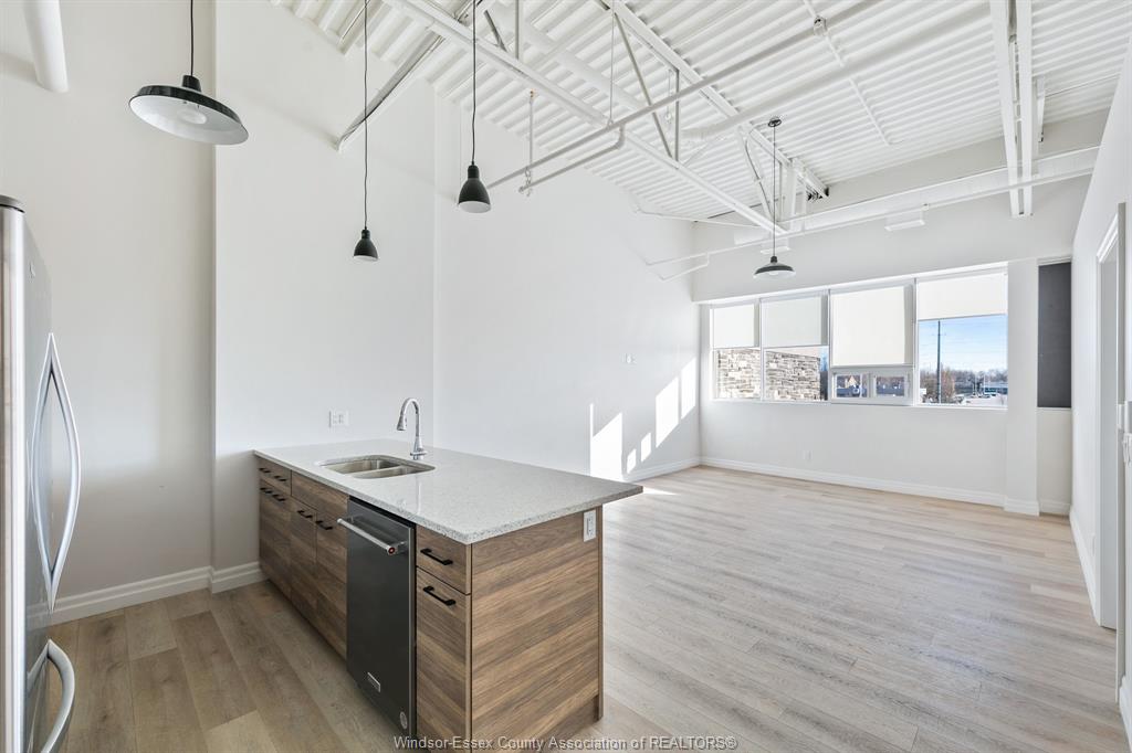 Interesting loft unit in the heart of lasalle. Walk to shops, medical offices, restaurants, banks, etc. Soaring open ceilings, vinyl plank floors, open plan kitchen/dining/living room. Large island with quartz countertop. All appliances included. Assigned surface parking included. No rental charges for furnace, etc. Credit check and proof of employment required. 1 year lease. Tenant pays utilities (gas, water and hydro). Please note: small pets only (20 lbs max). By appointment only.