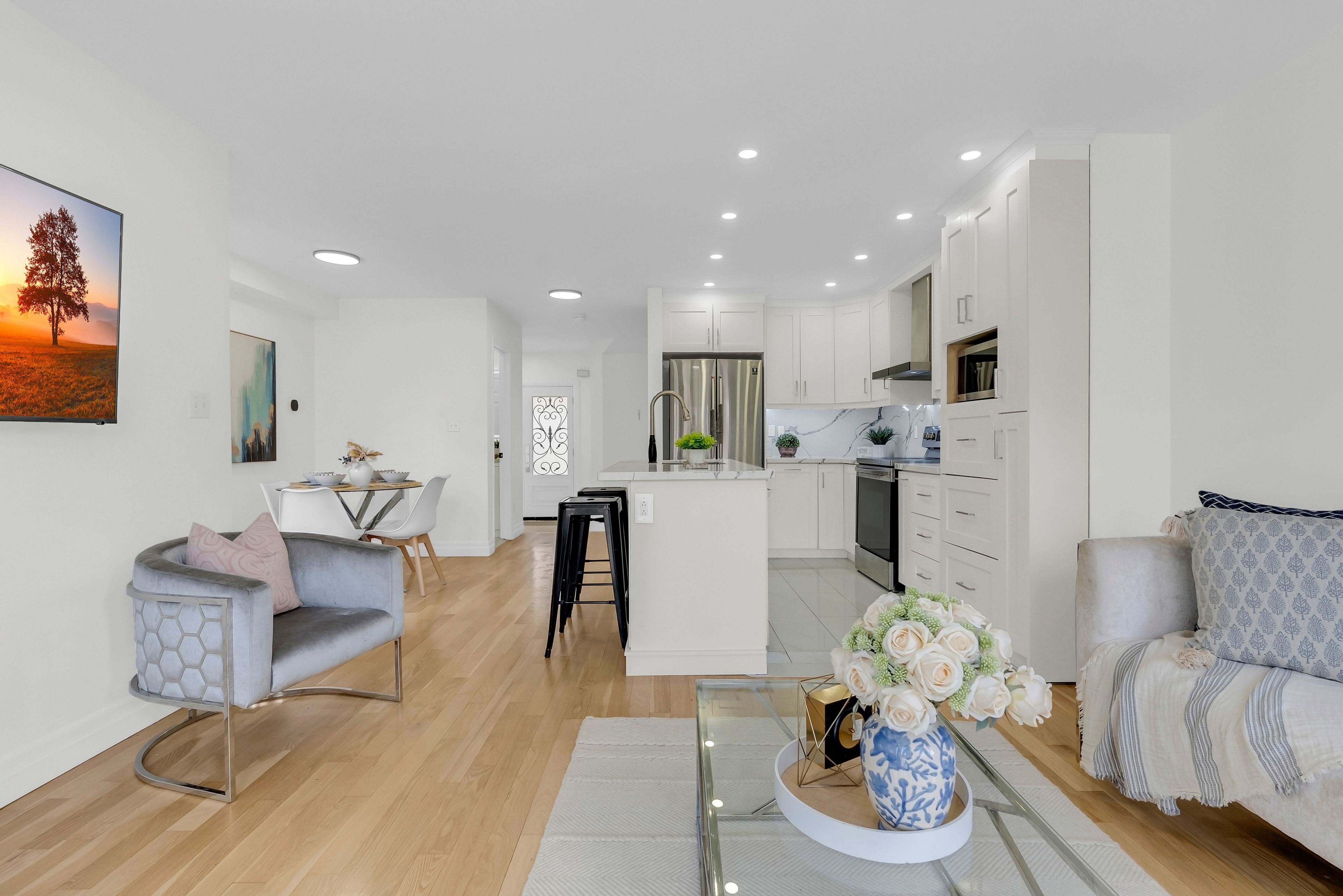 • Bright, open-concept layout with hardwood flooring and fresh paint.