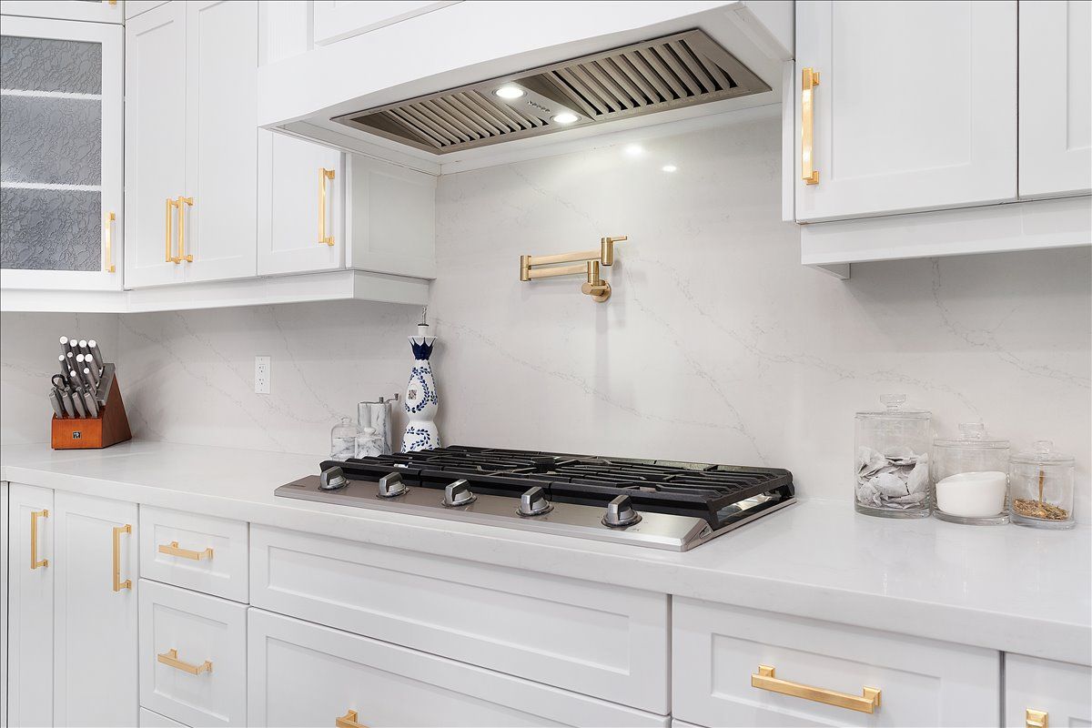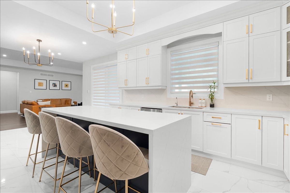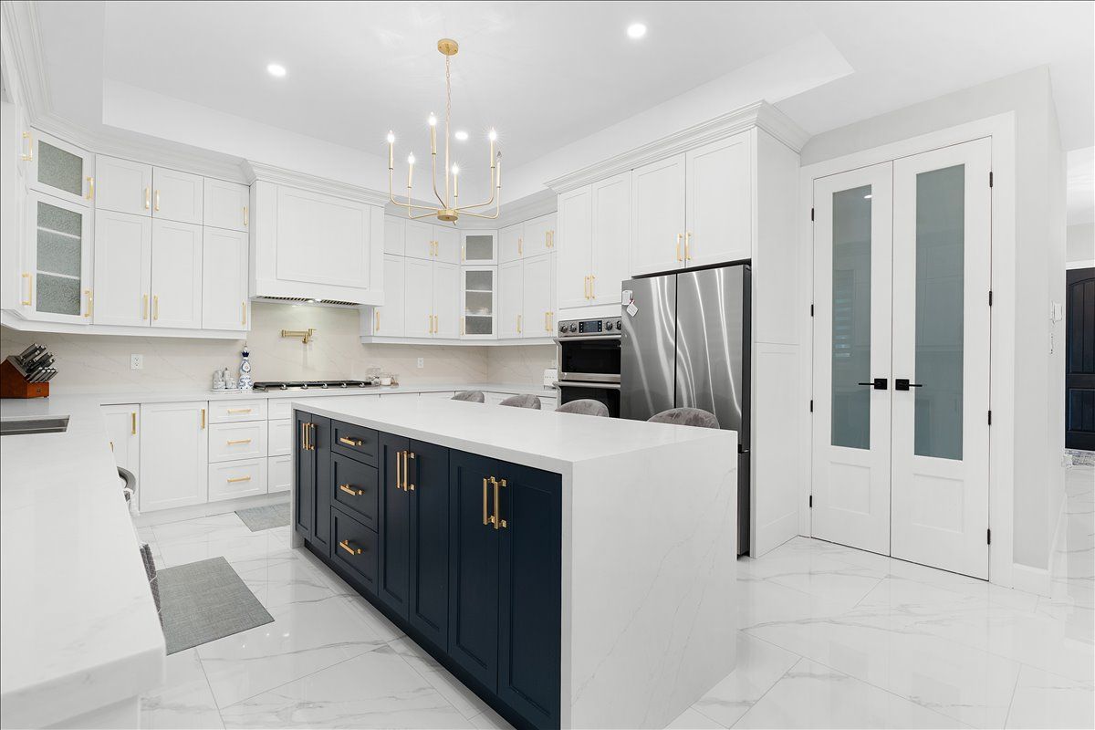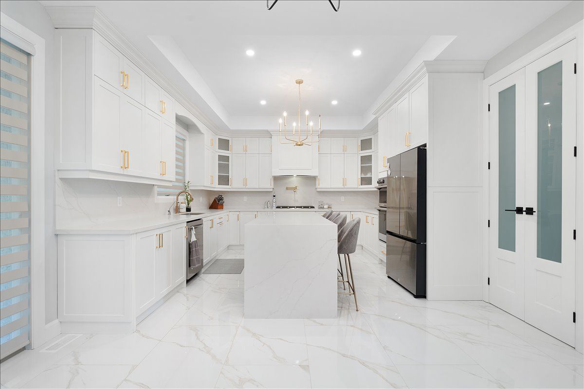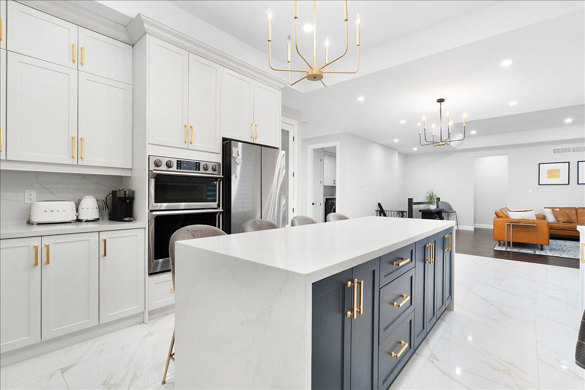 • Chef-inspired kitchen featuring quartz waterfall island and built-in appliances.