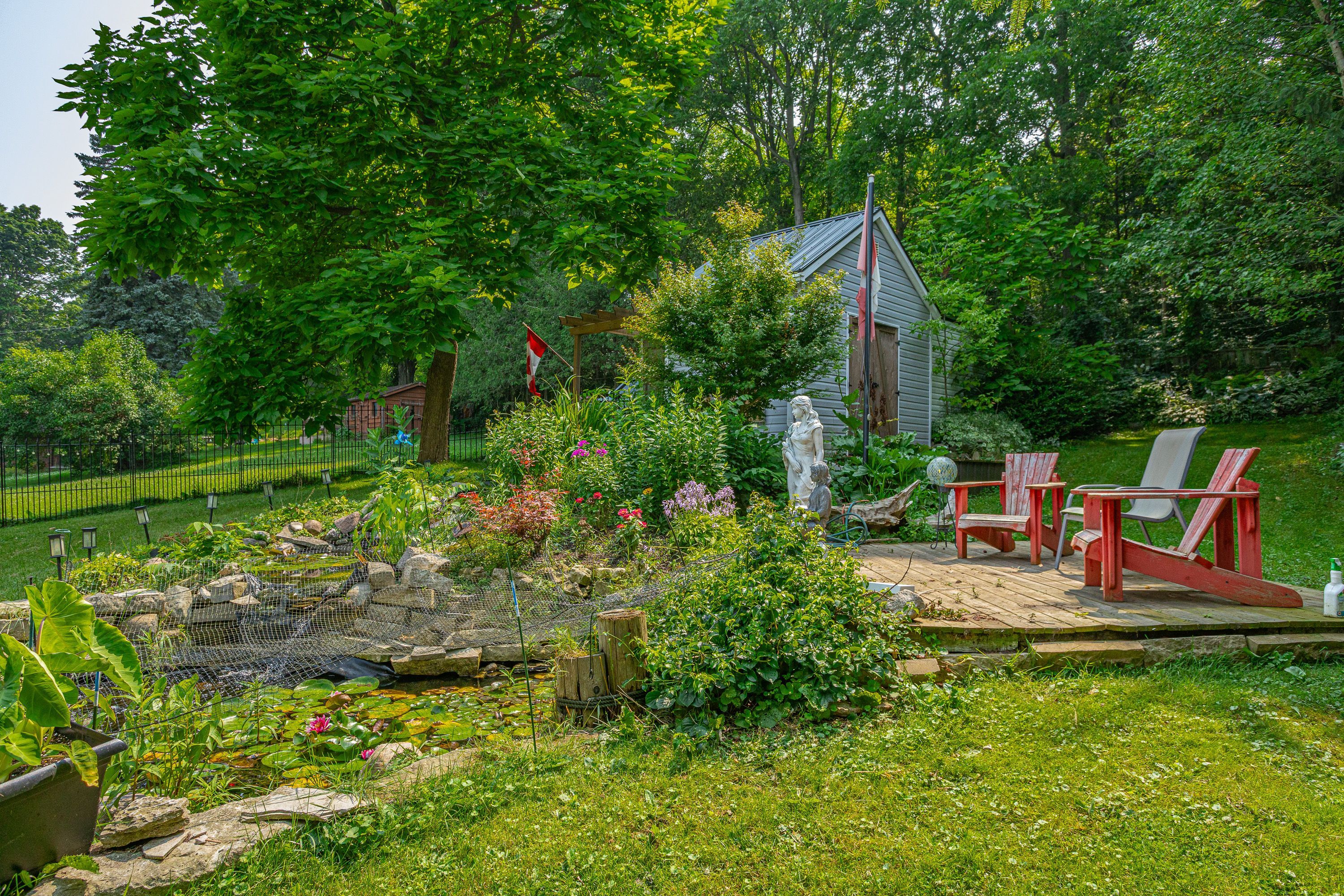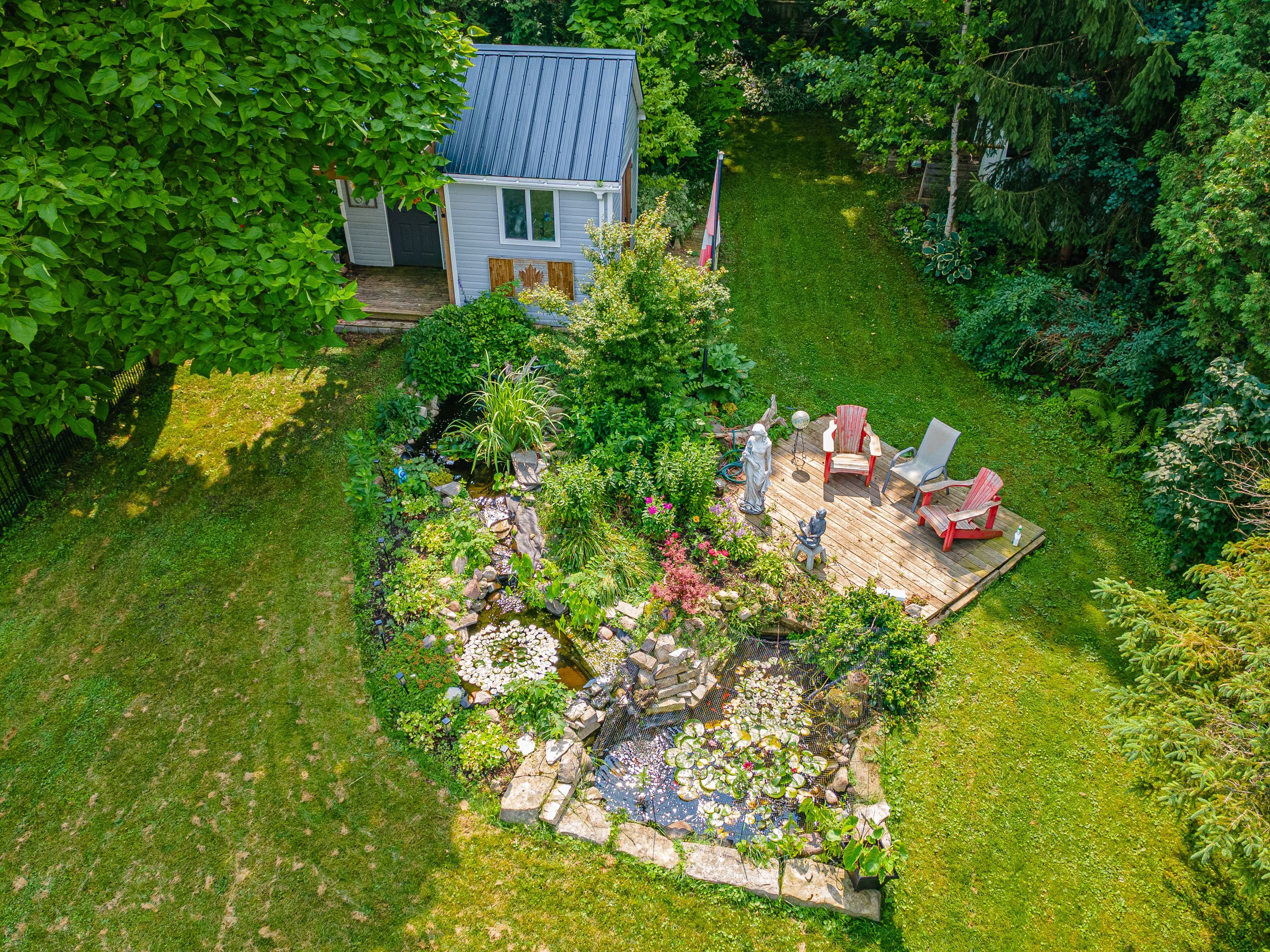 • Private backyard featuring multiple decks and a soothing fishpond.