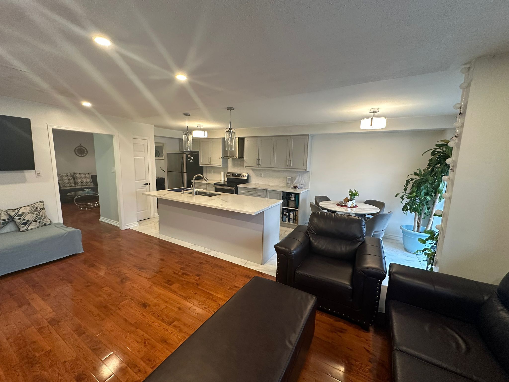 • Modern kitchen with stainless steel appliances and sleek quartz countertops.