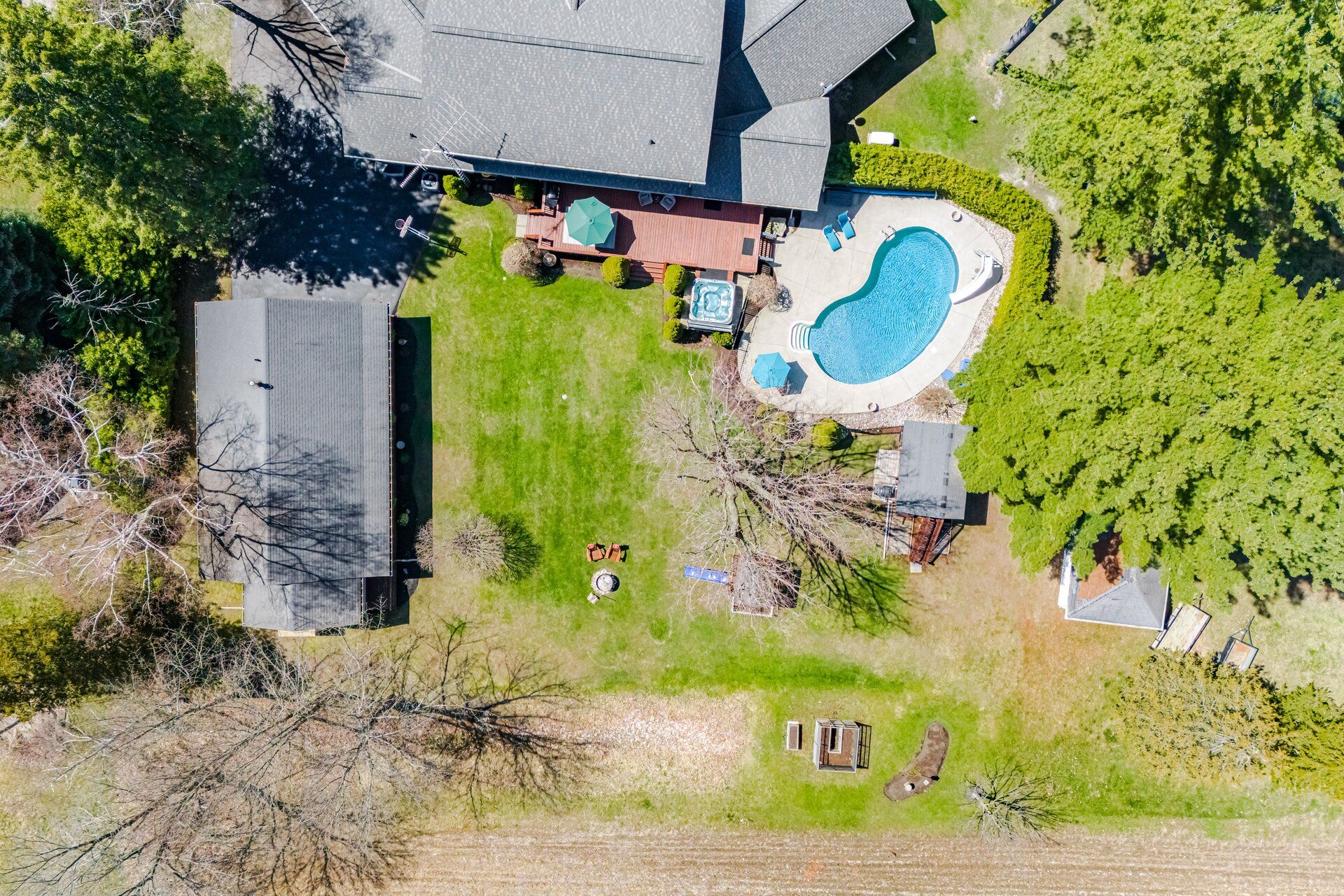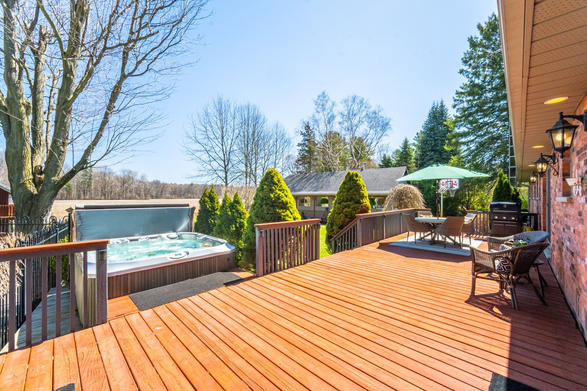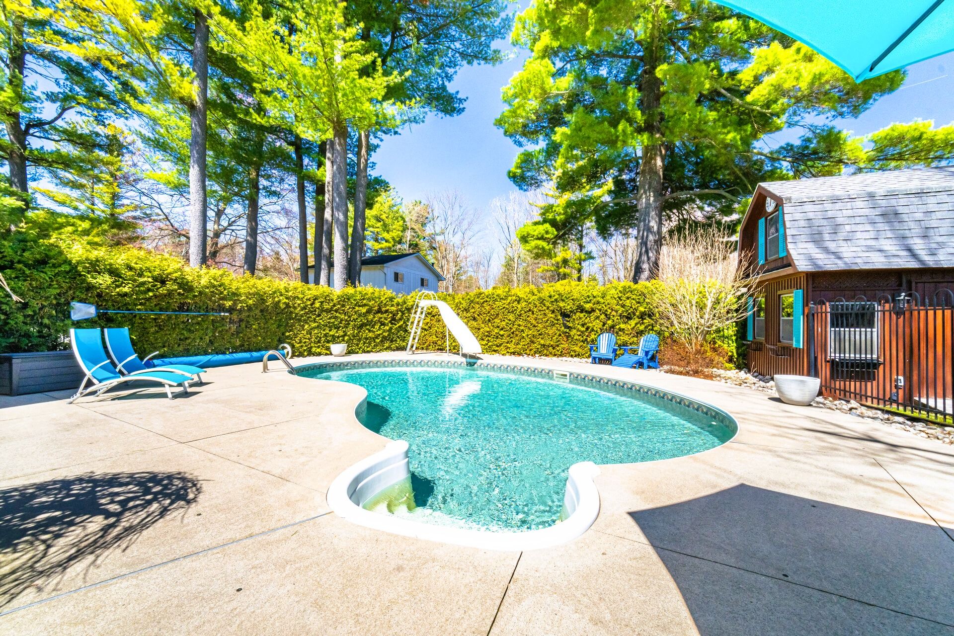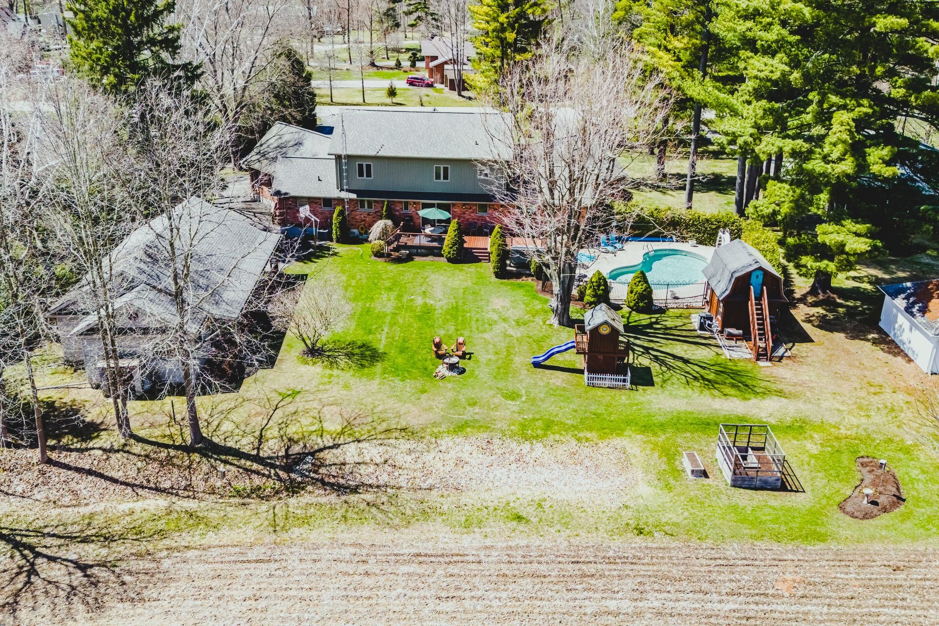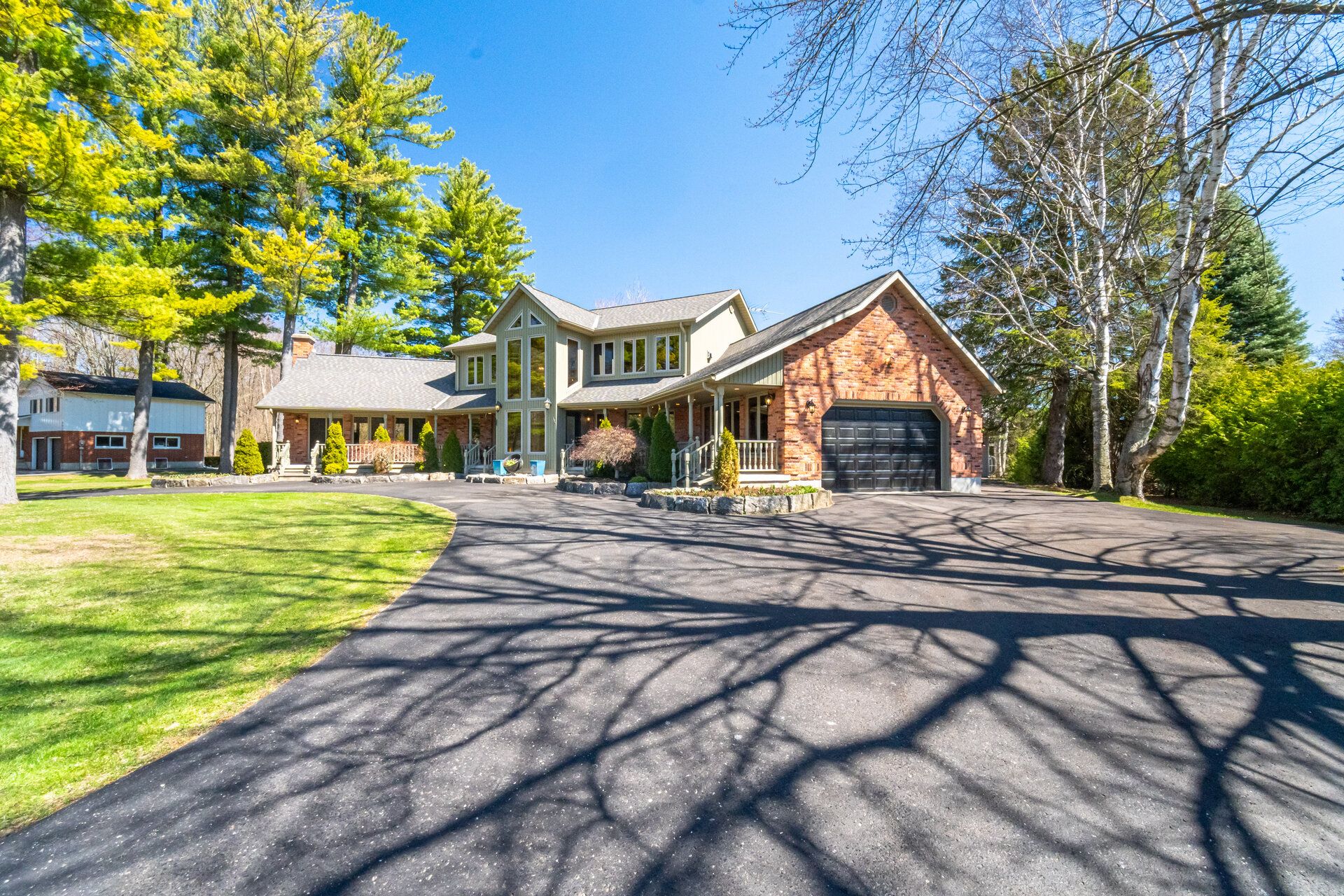 Stunning country estate !!! This one-of-a-kind masterpiece with main floor principle bedroom suite captivates from the very first glance with unmatched curb appeal and it's distinctive design. A true architectural gem, the home showcases custom exposed timber and iron construction, offering a dramatic welcome with soaring 26-ft ceilings in the foyer & great room. Anchoring the space is a striking gas stove and dramatic staircase just two of of the many bespoke touches throughout. The chefs kitchen is a showstopper in its own right, thoughtfully positioned between the great room & the expansive rear deck. Designed for seamless indoor-outdoor living, its perfect for entertaining on any scale, from intimate gatherings to grand events incorporating the sparkling heated saltwater pool, hot tub, deck, & beyond. Prepare to be awestruck yet again in the window-walled family room, where vaulted ceilings rise above a stunning floor-to-ceiling brick fireplace. Here, panoramic views of the beautifully manicured grounds, create a tranquil yet breathtaking backdrop for family gatherings. The main floor offers 2 bedrooms, including an expansive primary suite that feels like a private retreat. It features a luxurious 5-piece spa-style bath w/glass shower enclosure, a generous walk-in closet & direct access to the deck through a private walkout. Additional features include renovated 3 piece bath & laundry rm. The sweeping, open-riser circular staircase leads to the equally impressive upper level. Here you'll find two spacious bedrooms, a sleek and modern 3-piece bathroom, and a versatile loft-style den or studio area. The open-to-below wrap around balcony offers a front-row seat to the craftsmanship of the handcrafted artistry that defines this remarkable home. For the hobbyist or diy, an incredible bonus awaits: heated 1,200 sq ft- accessory building, equipped with a 3-piece bathroom. This versatile space is ideal for a workshop, studio- home gym, the possibilities are endless!