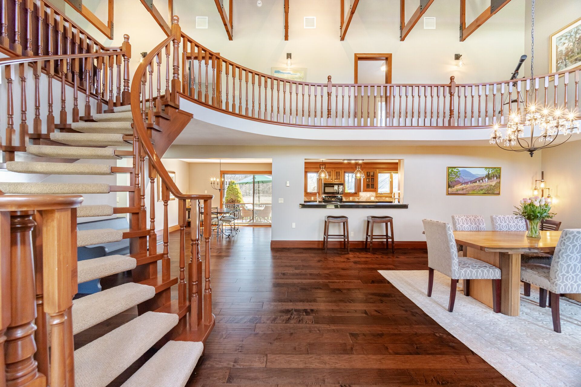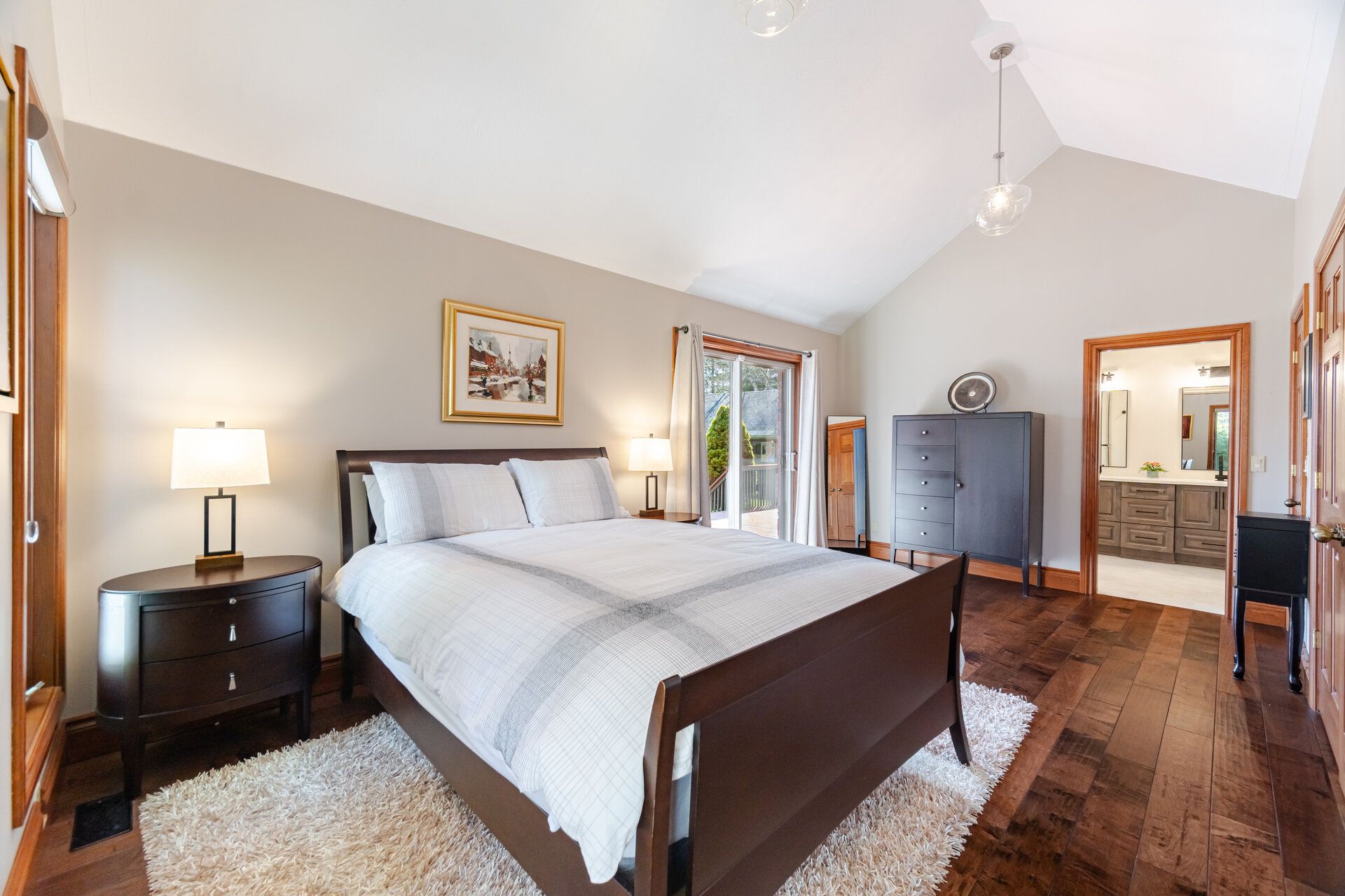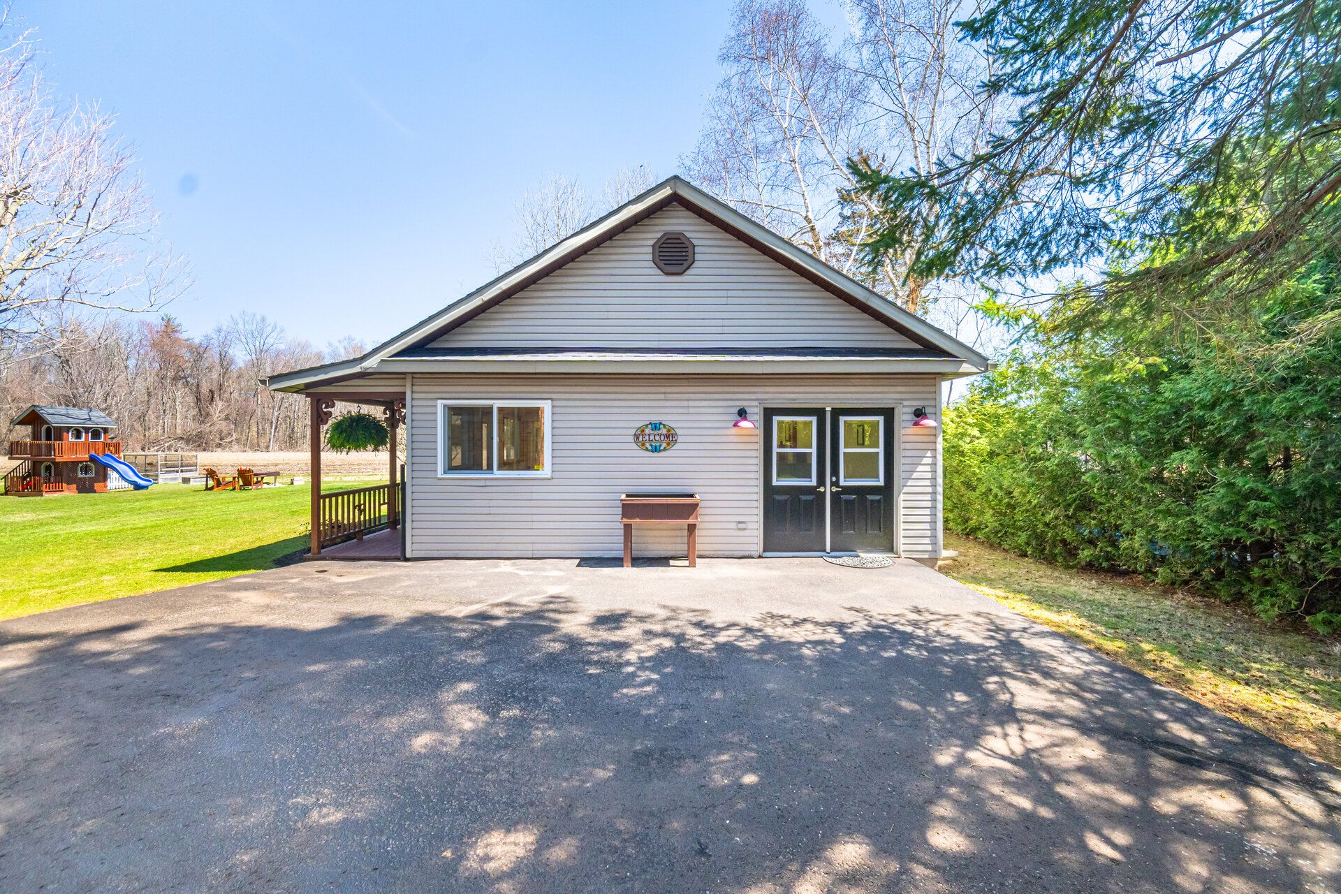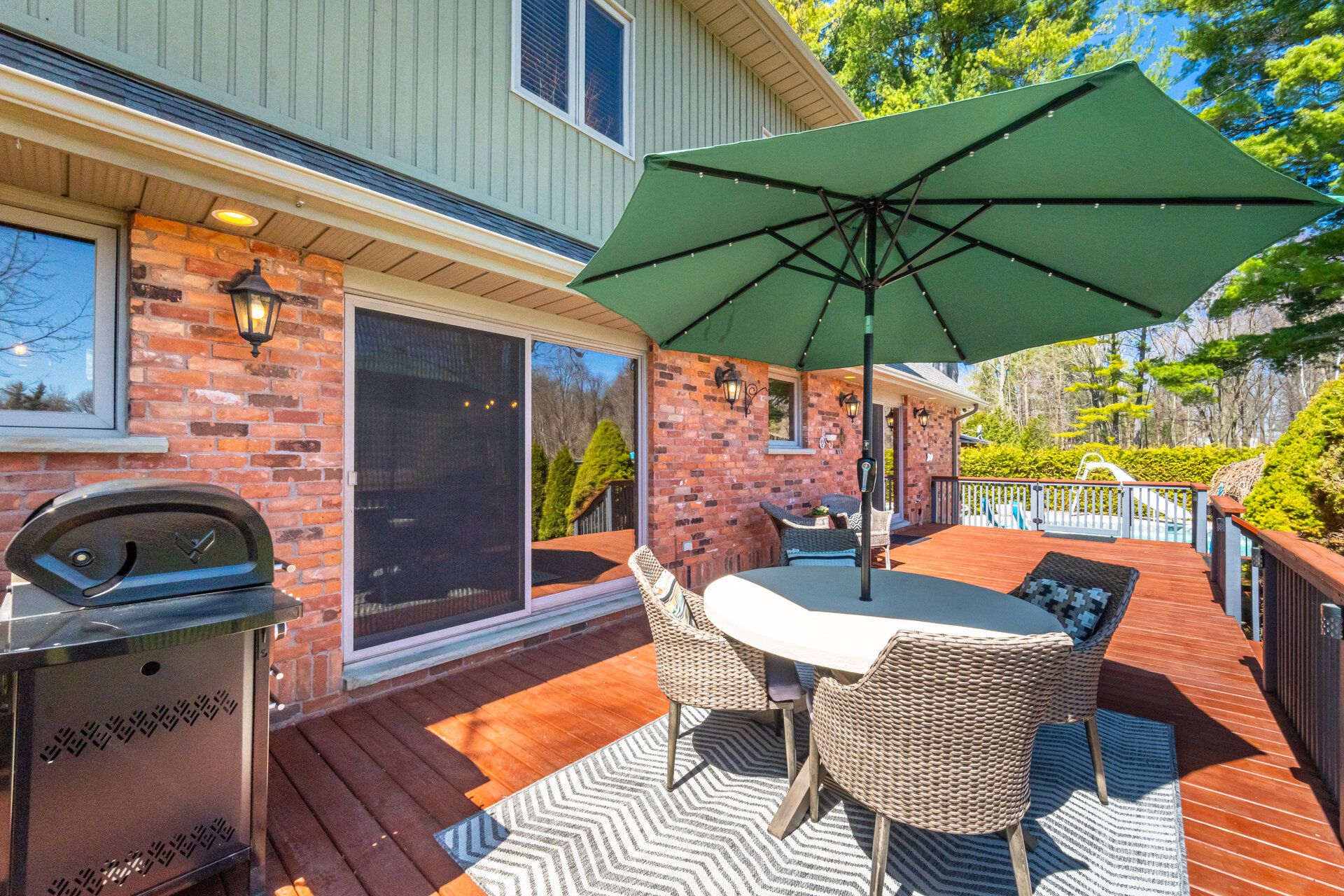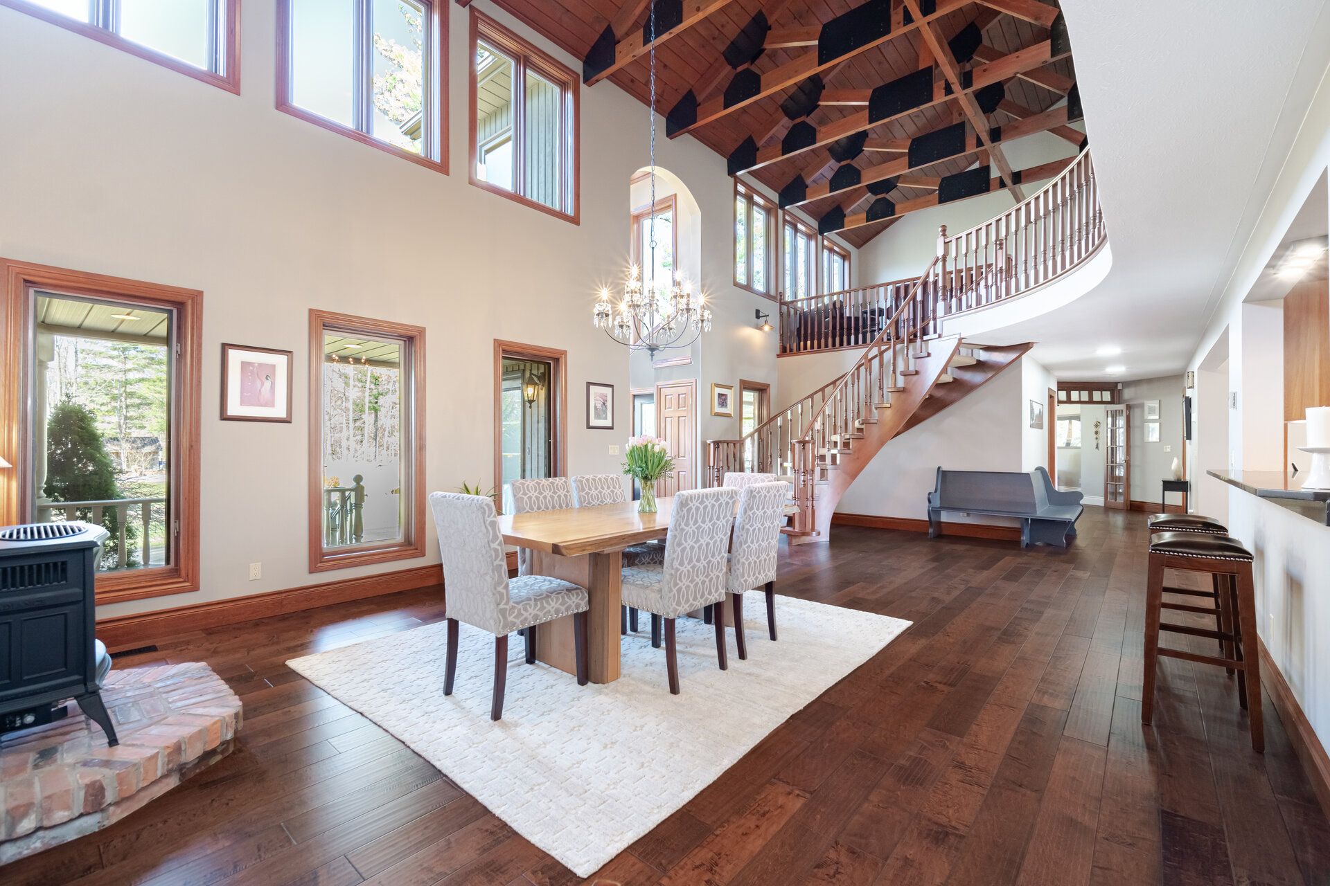 Stunning country estate !!! This one-of-a-kind masterpiece with main floor principle bedroom suite captivates from the very first glance with unmatched curb appeal and it's distinctive design. A true architectural gem, the home showcases custom exposed timber and iron construction, offering a dramatic welcome with soaring 26-ft ceilings in the foyer & great room. Anchoring the space is a striking gas stove and dramatic staircase just two of of the many bespoke touches throughout. The chefs kitchen is a showstopper in its own right, thoughtfully positioned between the great room & the expansive rear deck. Designed for seamless indoor-outdoor living, its perfect for entertaining on any scale, from intimate gatherings to grand events incorporating the sparkling heated saltwater pool, hot tub, deck, & beyond. Prepare to be awestruck yet again in the window-walled family room, where vaulted ceilings rise above a stunning floor-to-ceiling brick fireplace. Here, panoramic views of the beautifully manicured grounds, create a tranquil yet breathtaking backdrop for family gatherings. The main floor offers 2 bedrooms, including an expansive primary suite that feels like a private retreat. It features a luxurious 5-piece spa-style bath w/glass shower enclosure, a generous walk-in closet & direct access to the deck through a private walkout. Additional features include renovated 3 piece bath & laundry rm. The sweeping, open-riser circular staircase leads to the equally impressive upper level. Here you'll find two spacious bedrooms, a sleek and modern 3-piece bathroom, and a versatile loft-style den or studio area. The open-to-below wrap around balcony offers a front-row seat to the craftsmanship of the handcrafted artistry that defines this remarkable home. For the hobbyist or diy, an incredible bonus awaits: heated 1,200 sq ft- accessory building, equipped with a 3-piece bathroom. This versatile space is ideal for a workshop, studio- home gym, the possibilities are endless!